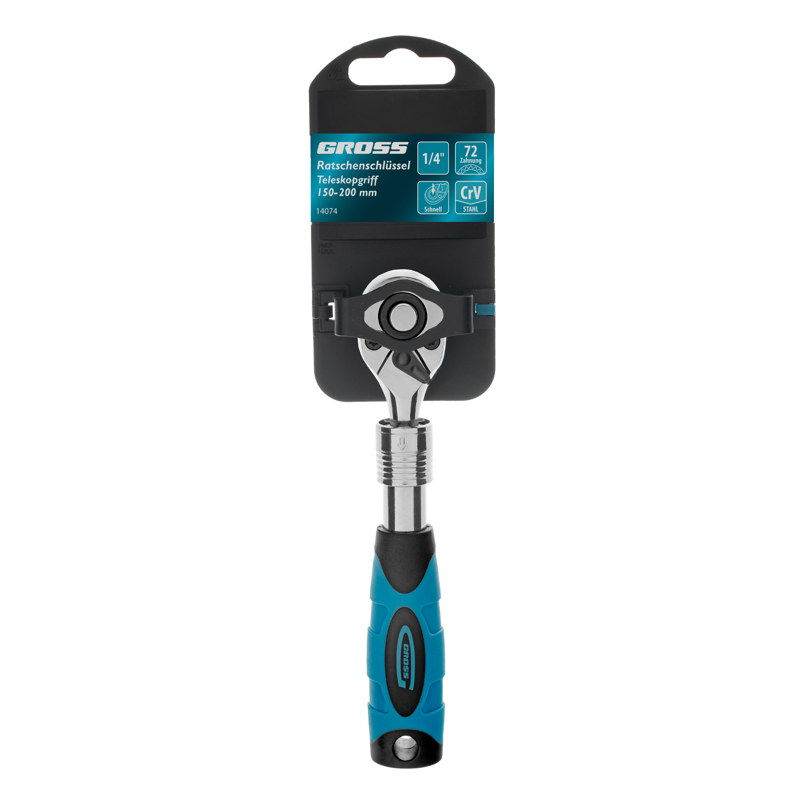 Телескопический хромированный трещоточный ключ Gross 14074, 150-200 мм, из стали CrV, с присоединительным квадратом 1/4 дюйма и 2-компонентной рукояткой, предназначен для монтажных работ с резьбовыми соединениями. Особенно удобен для работы в труднодоступных местах, т.к. имеет запатентованный механизм фиксации телескопической рукоятки. Ее длину можно изменить с 150 до 200 мм. Инструмент используется в слесарных мастерских, автосервисах, пригодится и в быту.