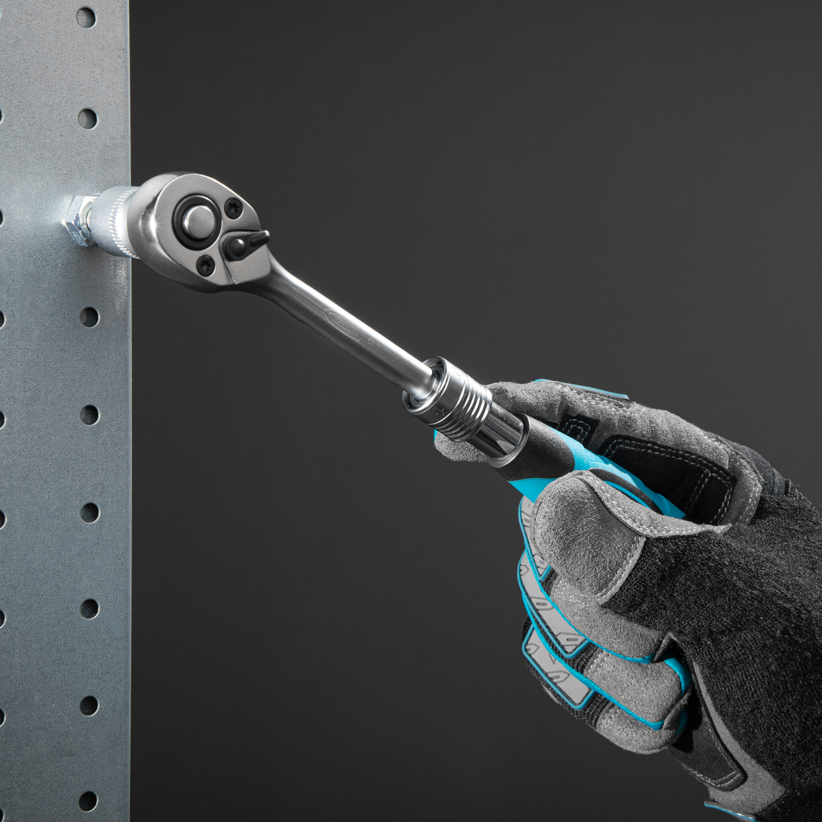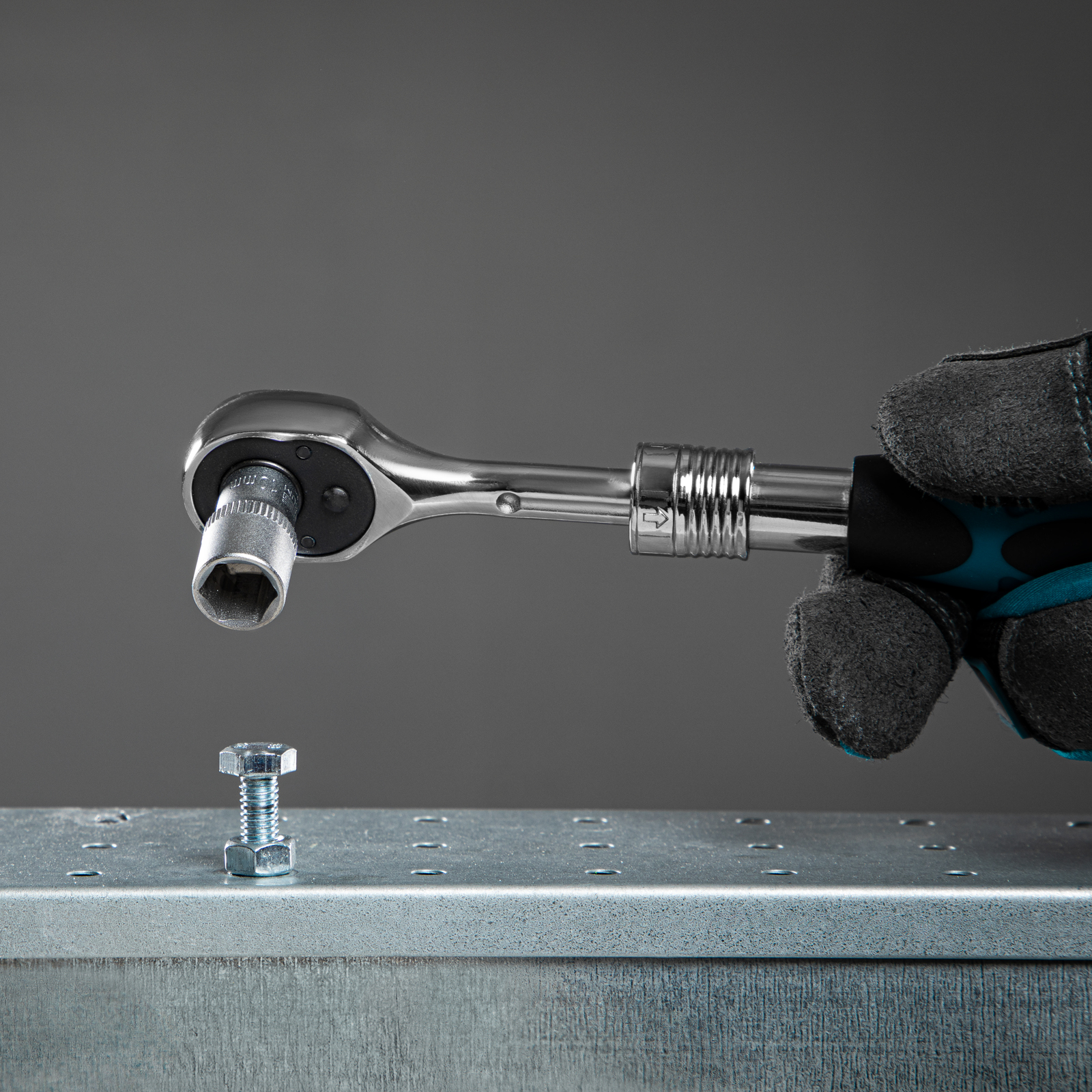 Высокая износостойкость — ключ-трещотка изготовлен из прочной стали хромованадиевой группы.
