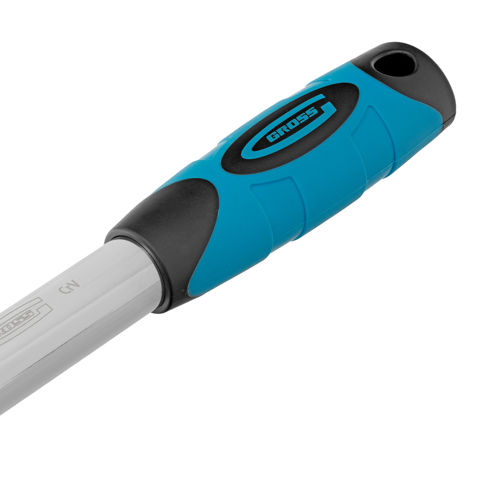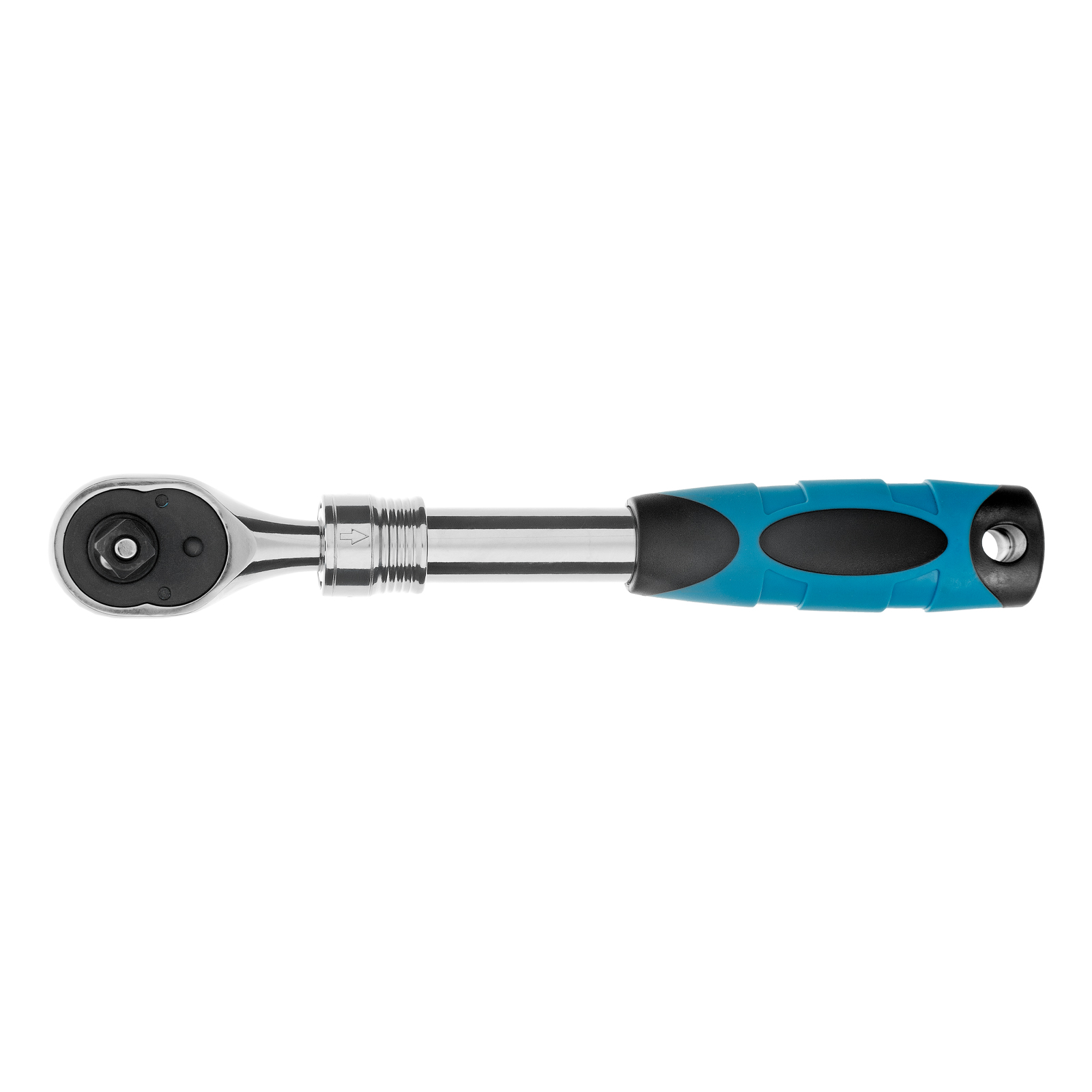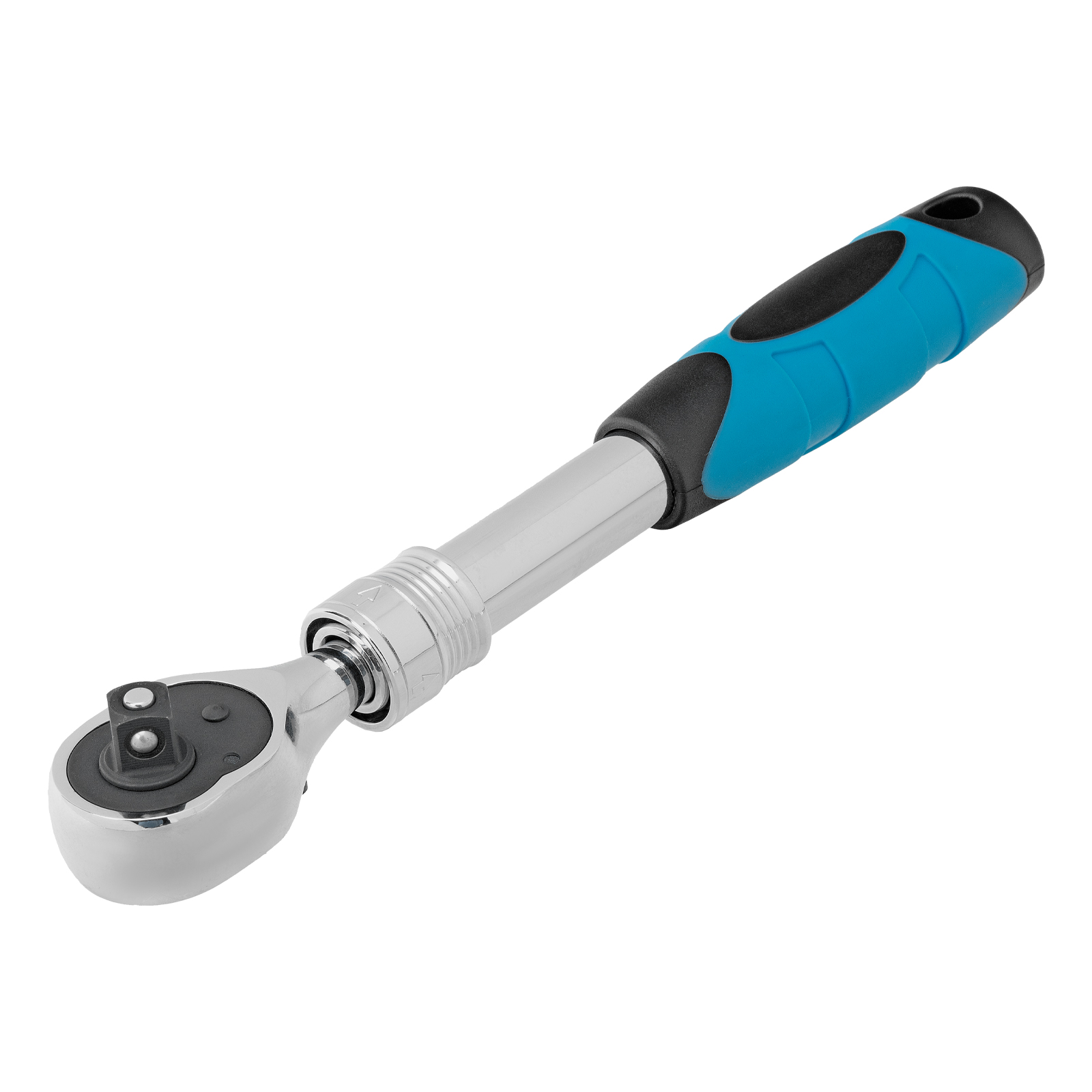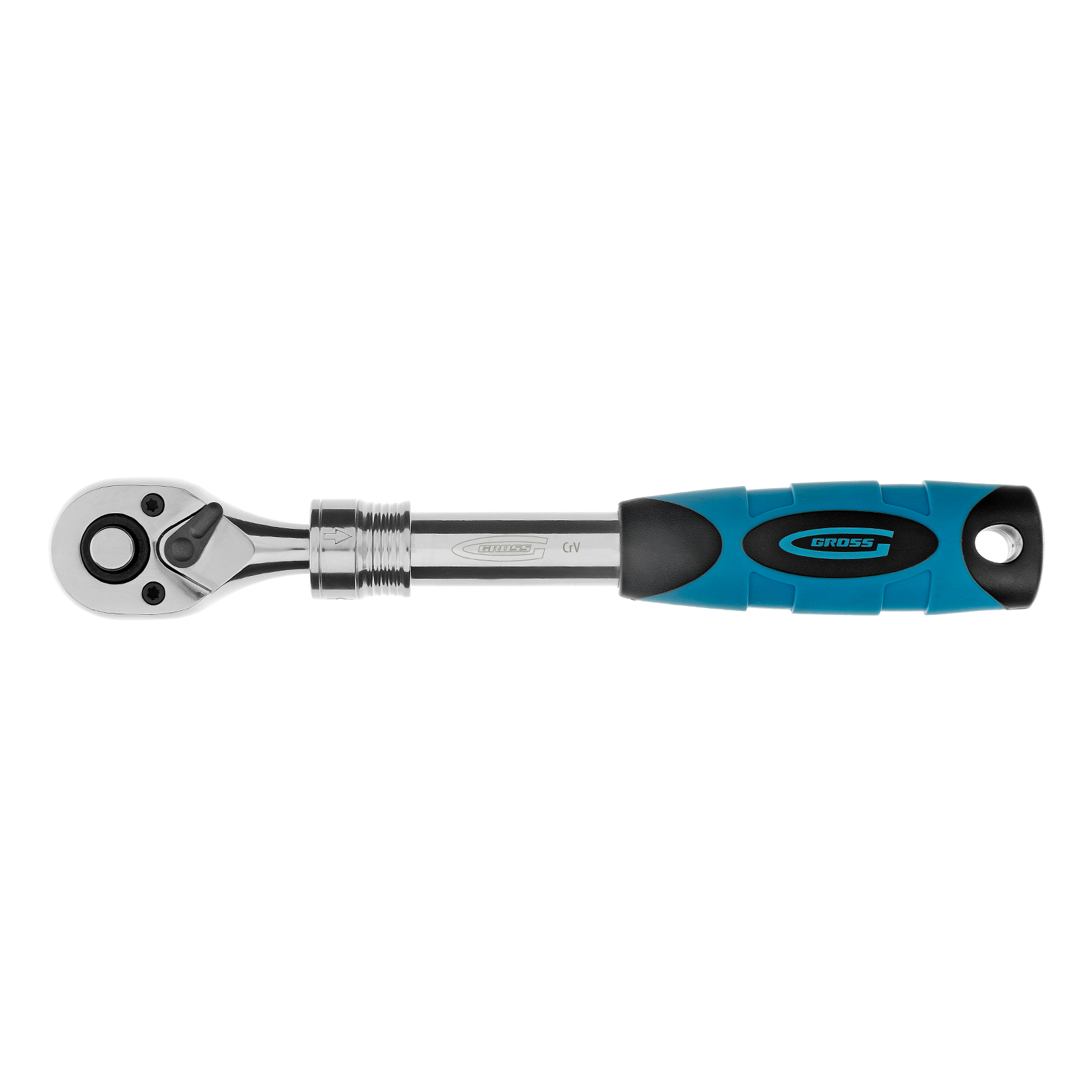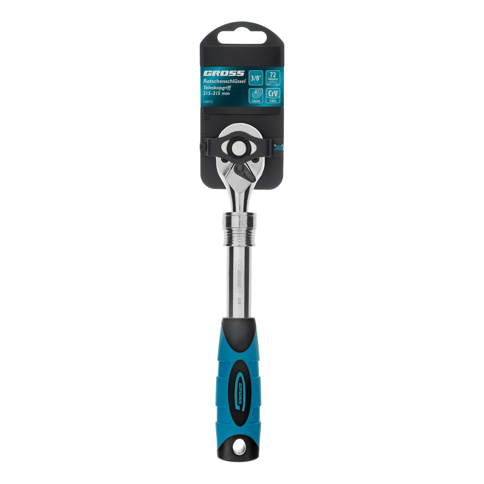 Телескопический хромированный трещоточный ключ Gross 14072, 215-315 мм, из стали CrV, с присоединительным квадратом 3/8 дюйма и 2-компонентной рукояткой, предназначен для монтажных работ с резьбовыми соединениями. Особенно удобен для работы в труднодоступных местах, т.к. имеет запатентованный механизм фиксации телескопической рукоятки. Ее длину можно изменить с 215 до 315 мм. Инструмент используется в слесарных мастерских, автосервисах, пригодится и в быту.