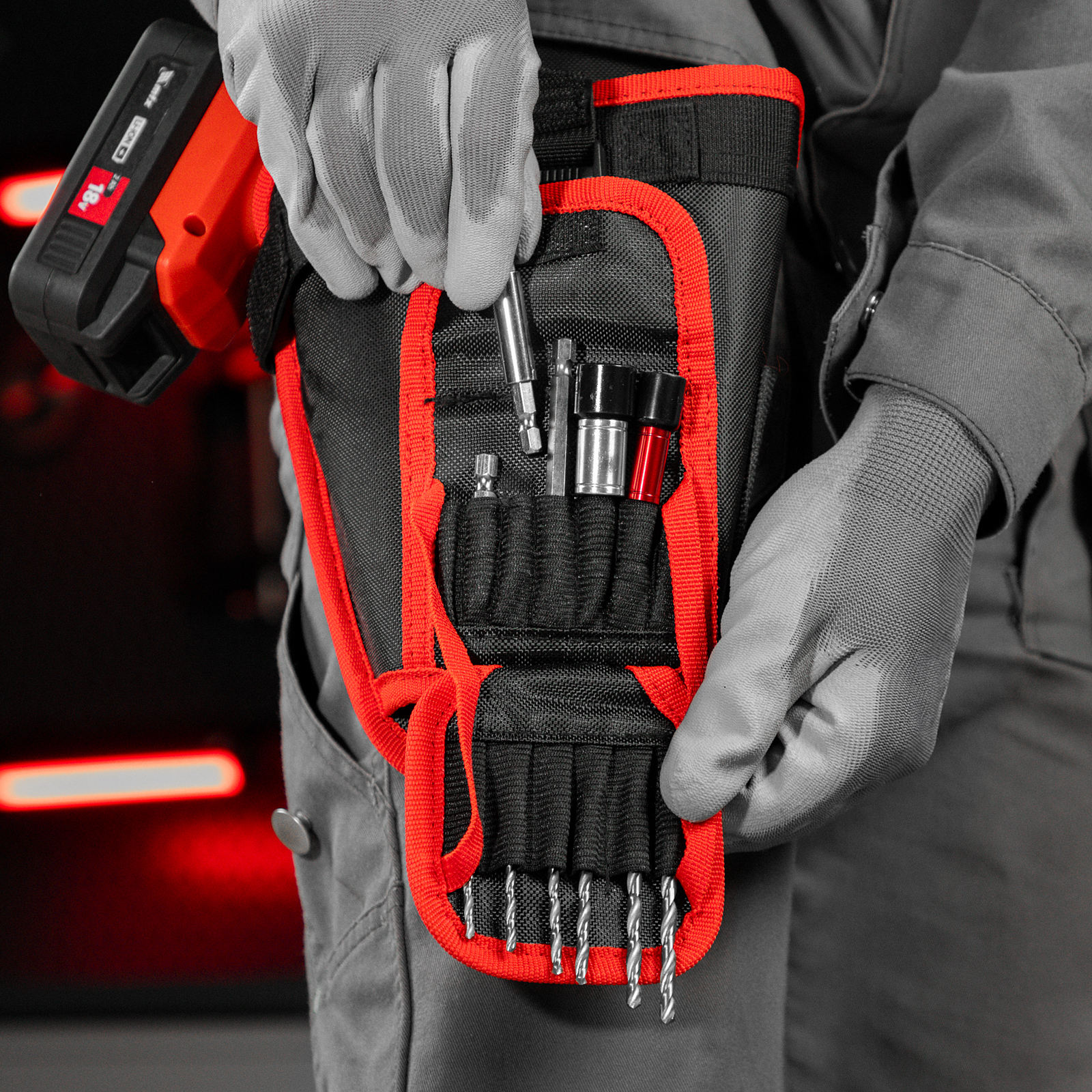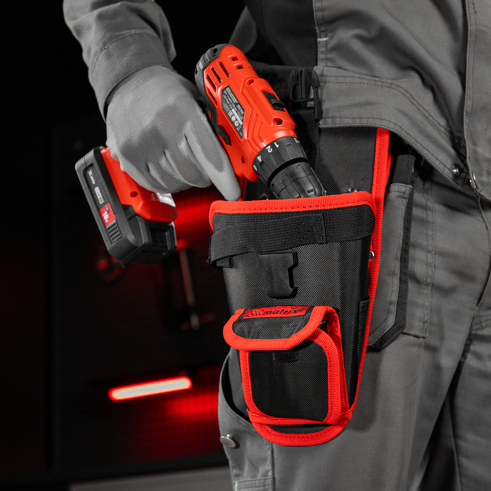 - Специальная петля обеспечивает надежную фиксацию шуруповерта, предотвращая его выскальзывание.