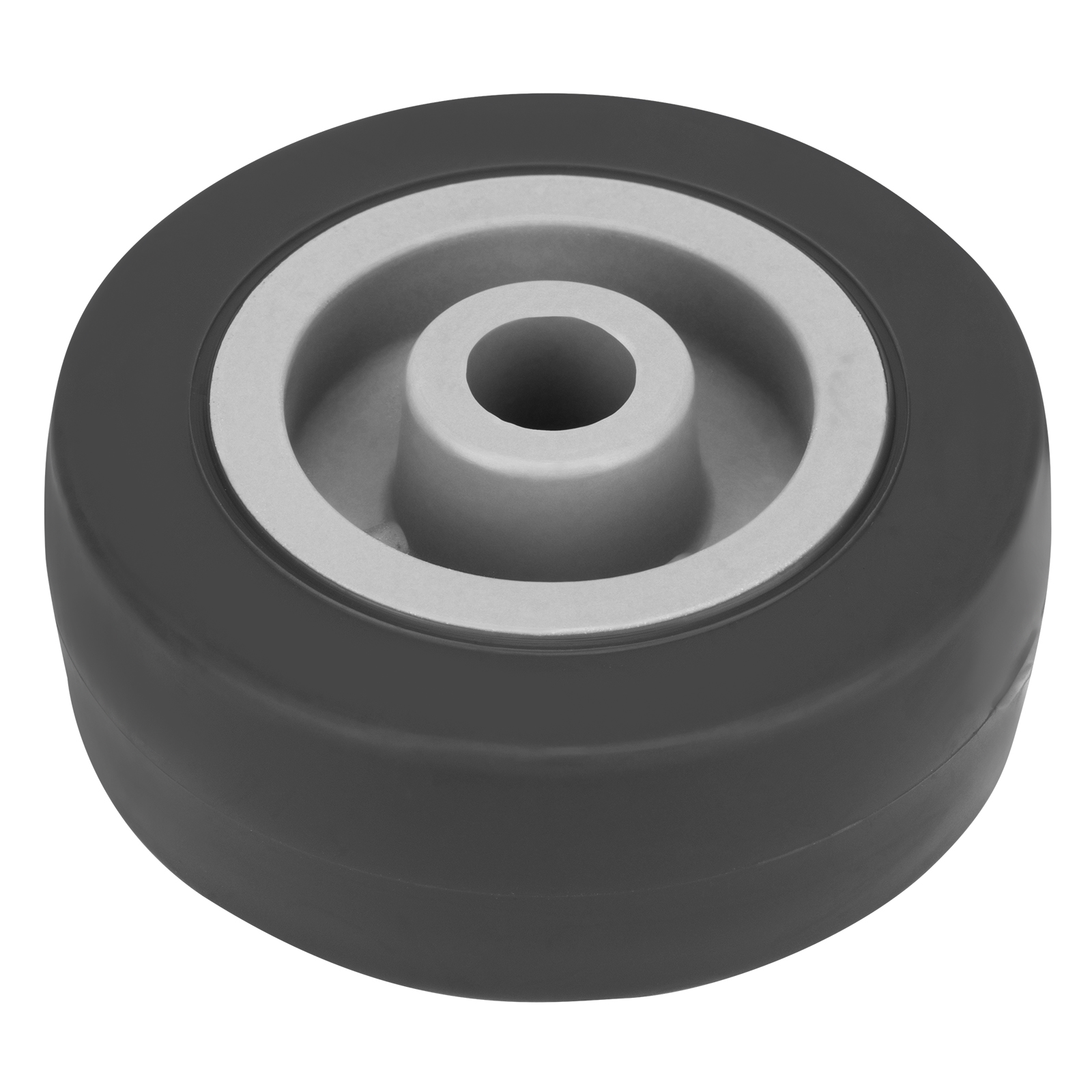 - Универсальность — контактная поверхность выполнена из термопластичной серой резины, поэтому колесо может применяться на различных покрытиях, долгое время сохраняя рабочие качества.