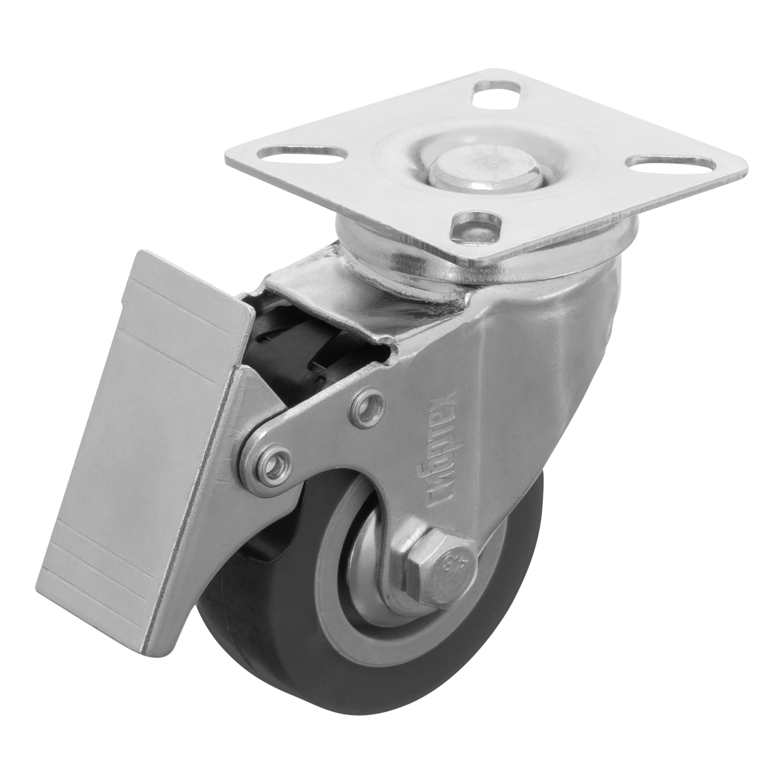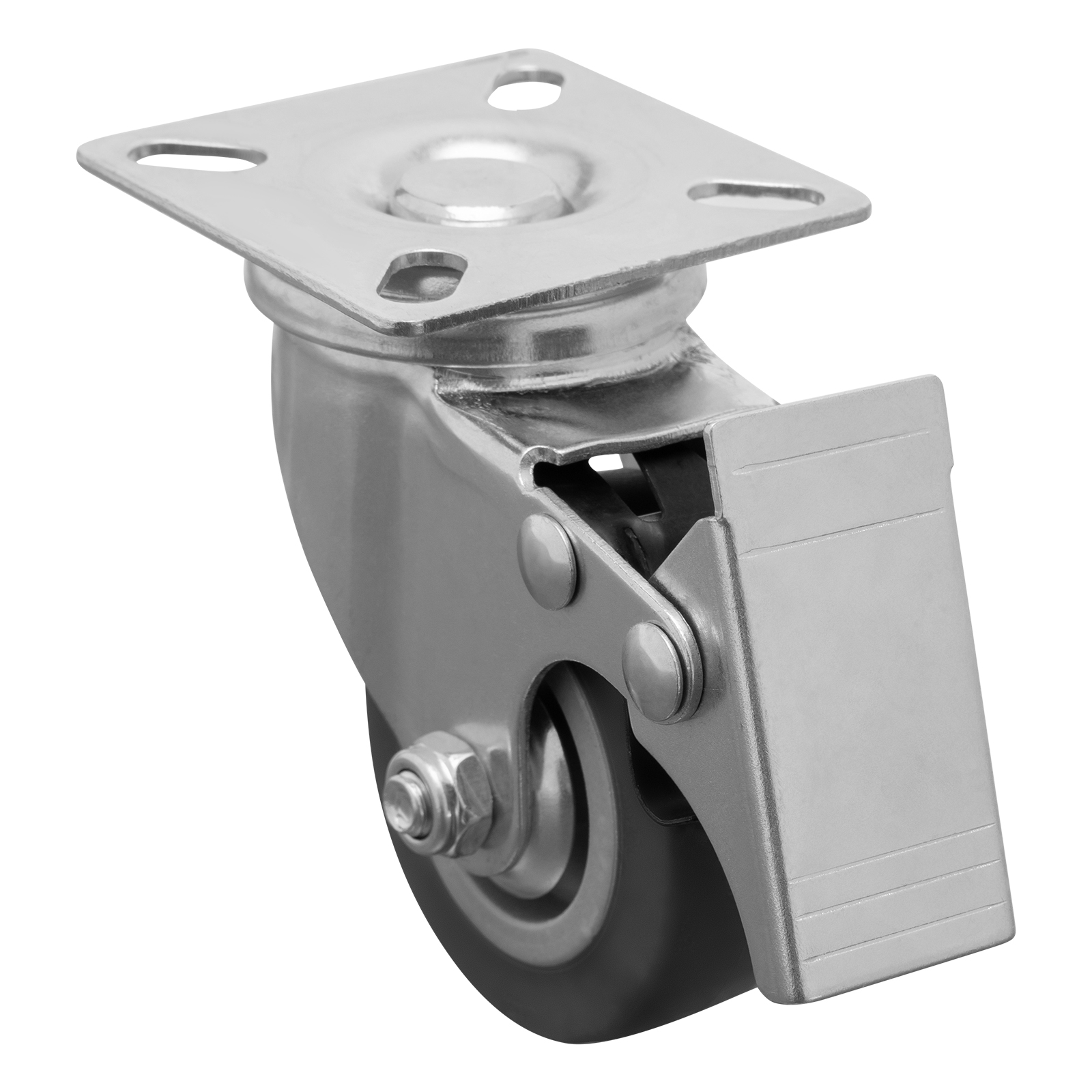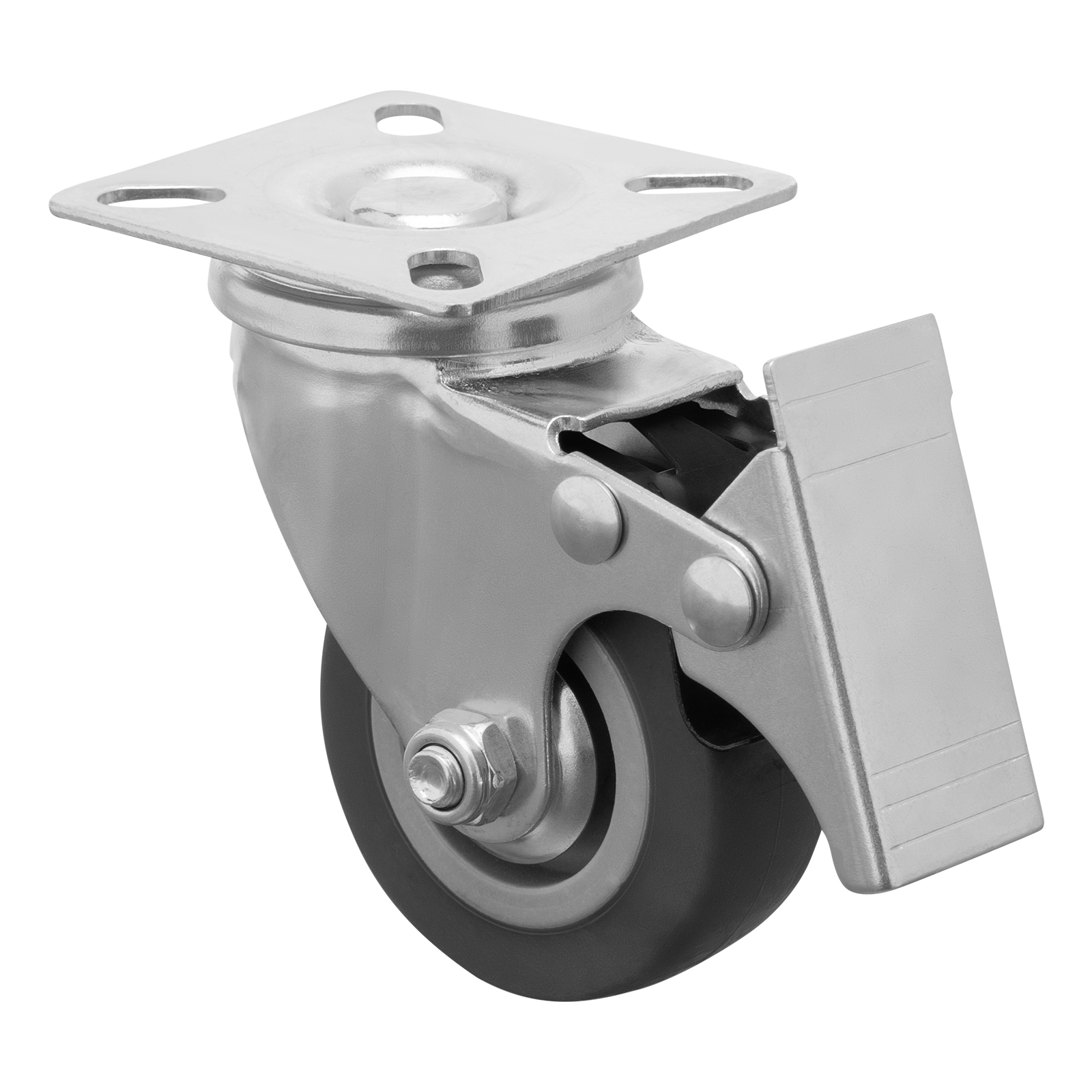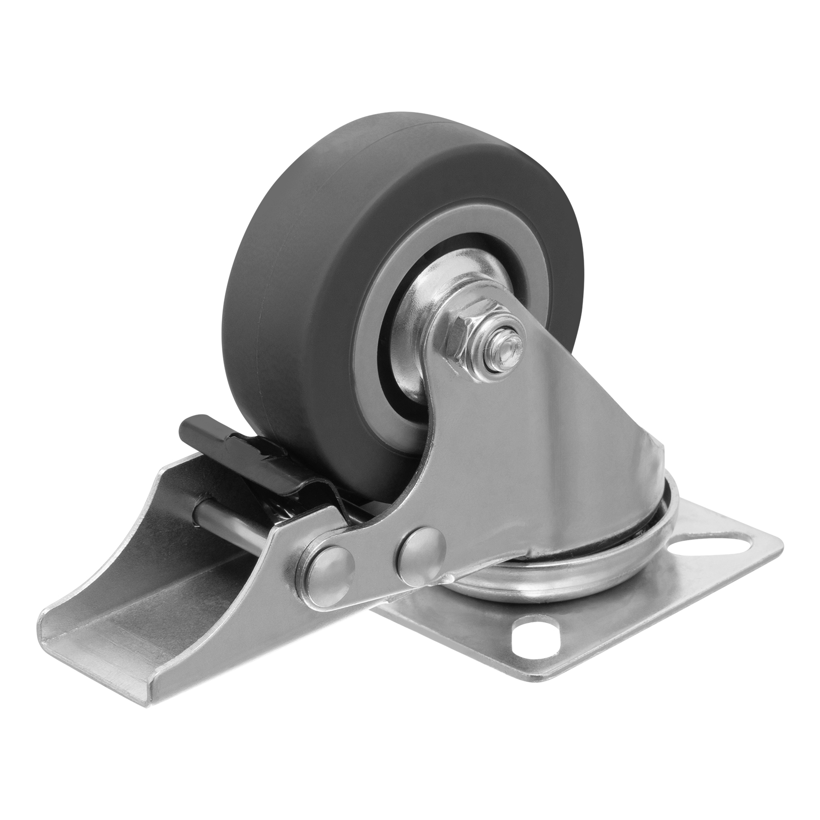 Колесо поворотное Сибртех 68719 диаметром 50 мм, грузоподъемностью 35 кг, с платформенным креплением и тормозом, — движущая часть ручных тележек стандартной и увеличенной грузоподъемности. Поворотный механизм позволяет тележке маневрировать. Устойчивость к высоким и низким температурам, влаге и ультрафиолету позволяет использовать колесо как на улице, так и в складских или производственных помещениях.