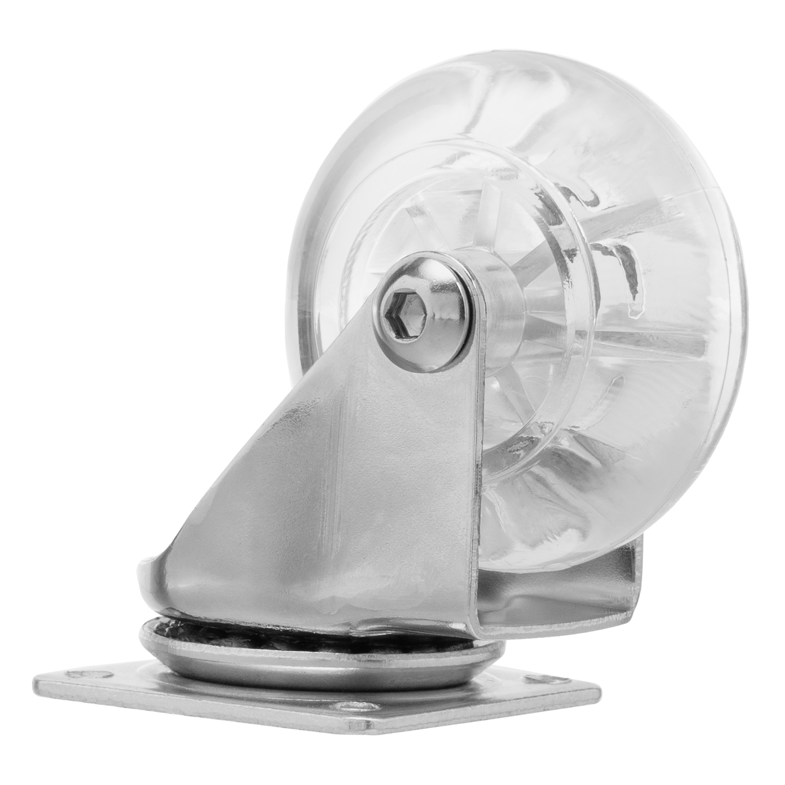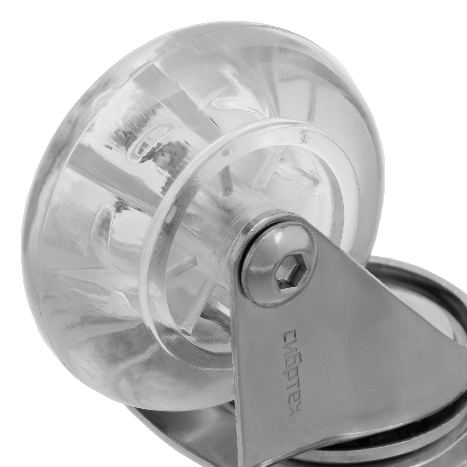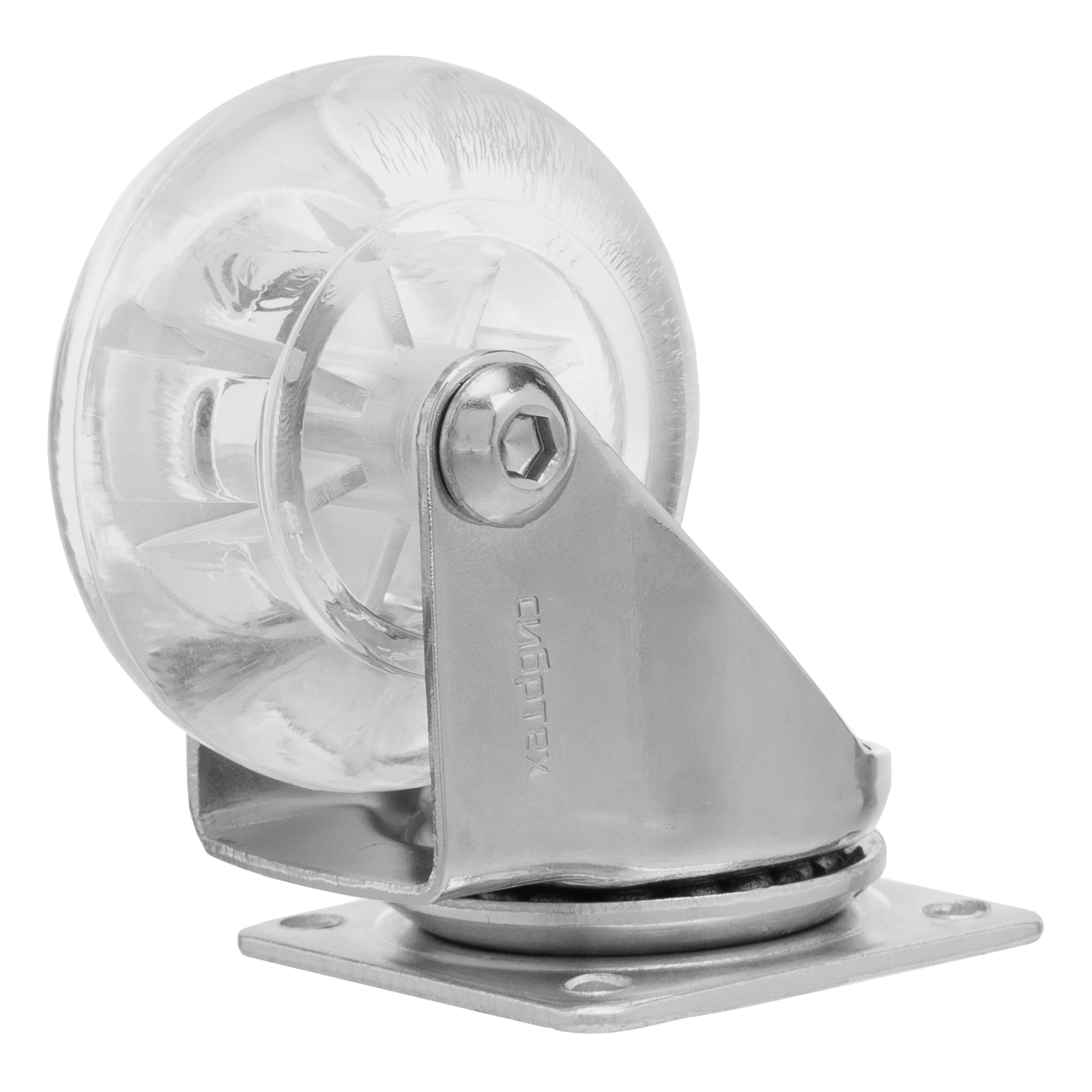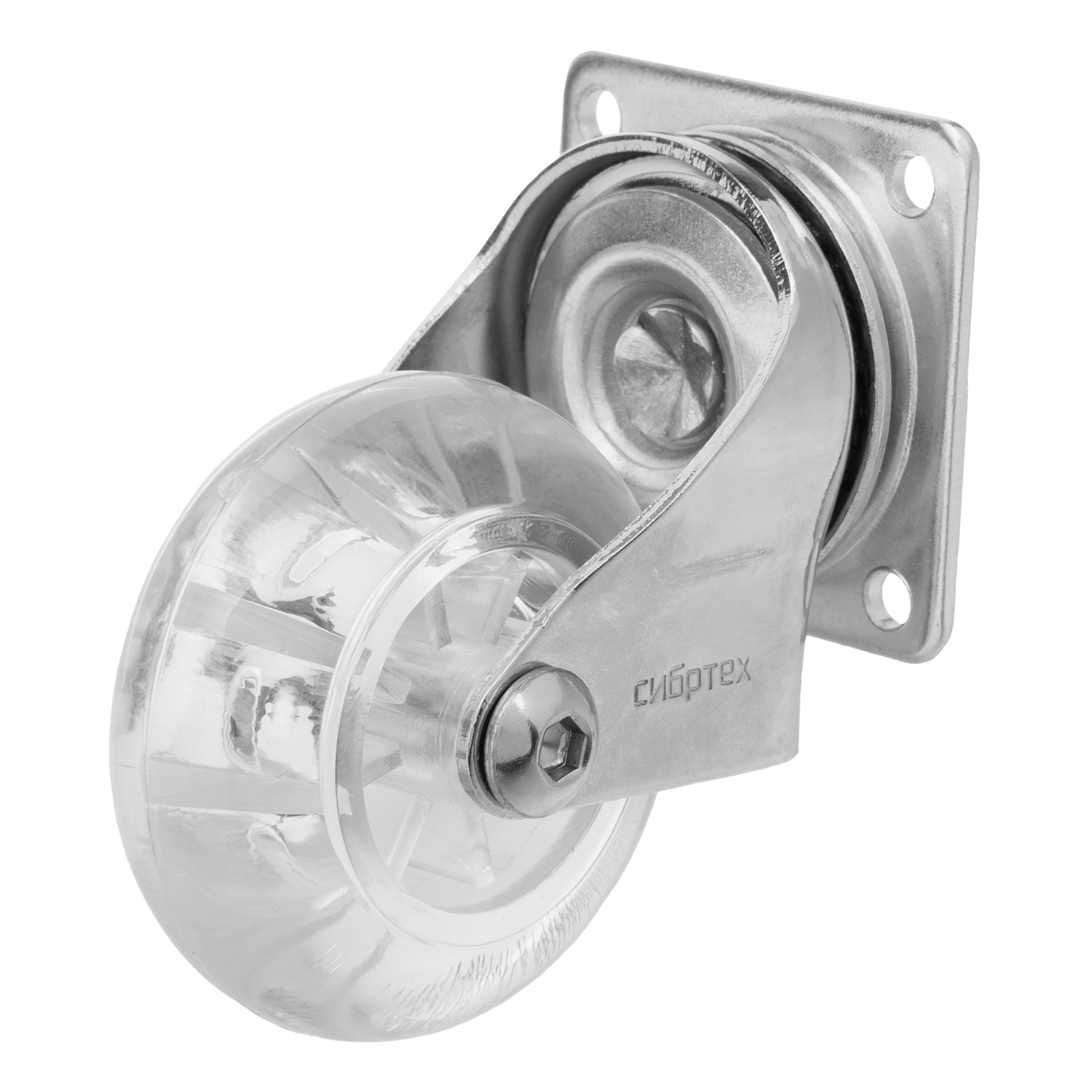 Прозрачное поворотное колесо Сибртех 68732 из полиуретана, диаметром 50 мм, с платформенным креплением, устанавливается на ручные тележки и служит для перемещения грузов. Не производит шума, поэтому оптимально для использования в помещениях.