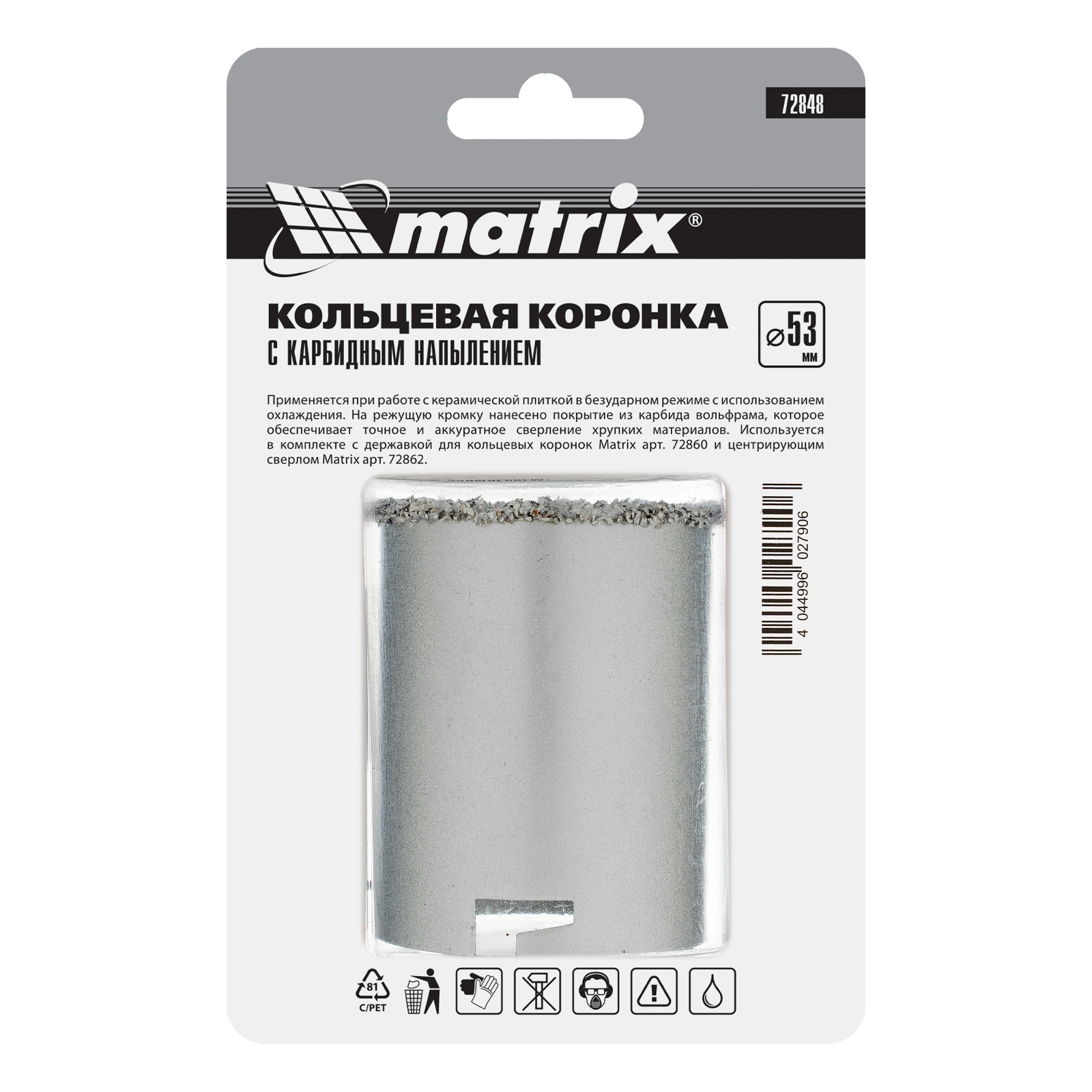 Кольцевая коронка с карбидным напылением Matrix 72848 диаметром 53 мм — сменный режущий элемент для дрелей и перфораторов. Предназначена для сверления отверстий в керамической плитке, ячеистом бетоне, пенобетоне, газосиликате, кирпиче. Пригодится для монтажа проводки в доме. Используется совместно с державкой Matrix 72860 и центрирующим сверлом Matrix 72862 (не входят в комплект поставки).