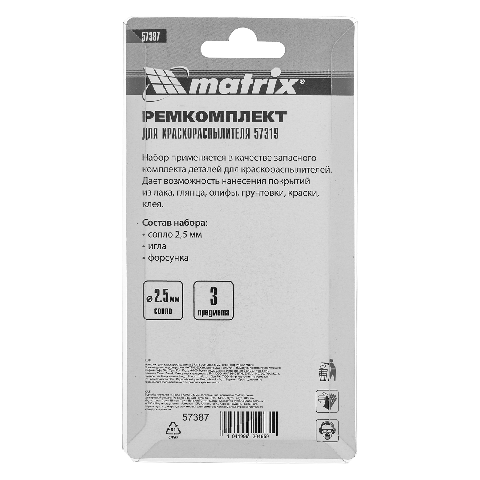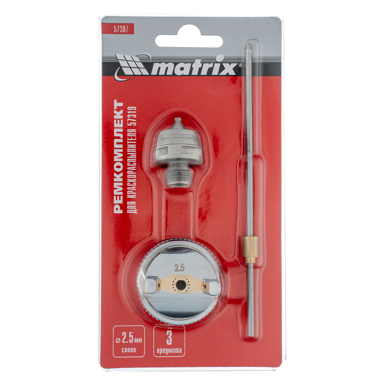 Комплект Matrix 57387 для краскораспылителя Matrix 57319 включает в себя 3 предмета: сопло диаметром 2,5 мм, иглу и форсунку. Их можно использовать для ремонта инструмента или расширения его функциональных возможностей.