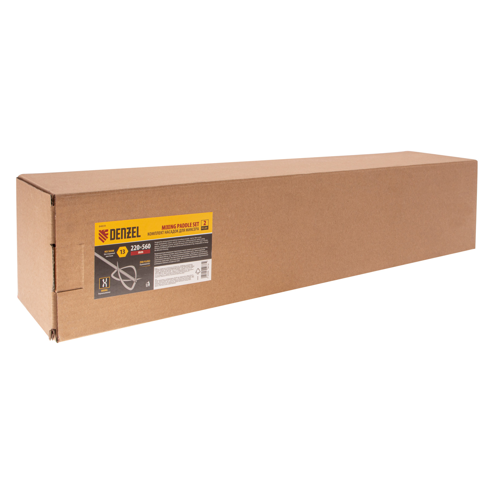 <p>Комплект оцинкованных насадок для строительного миксера Denzel 84839 состоит из 2 шт. размером 220 х 560 мм, с шестигранным хвостовиком HEX13. Оснастка предназначена для установки на миксер с быстросъемным креплением и используется для равномерного смешивания строительных смесей с низкой и средней вязкостью: различных растворов, стяжки пола, готовой штукатурки, цемента, бетона, эпоксидной смолы, герметизирующего состава, асфальтобетона, гипса и гранулированного материала.</p><h2>Преимущества</h2><ul><li>Универсальность — смеси можно перемешивать как сверху вниз, так и снизу вверх (для изменения направления перемешивания необходимо поменять насадки местами).</li><li>Устойчивость к механическим повреждениям и внешним воздействиям — оснастка изготовлена из стали и оцинкована.</li><li>Надежность и долговечность — насадки не деформируются в процессе эксплуатации.</li></ul>