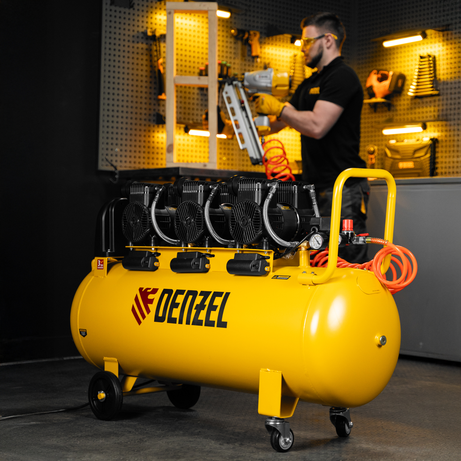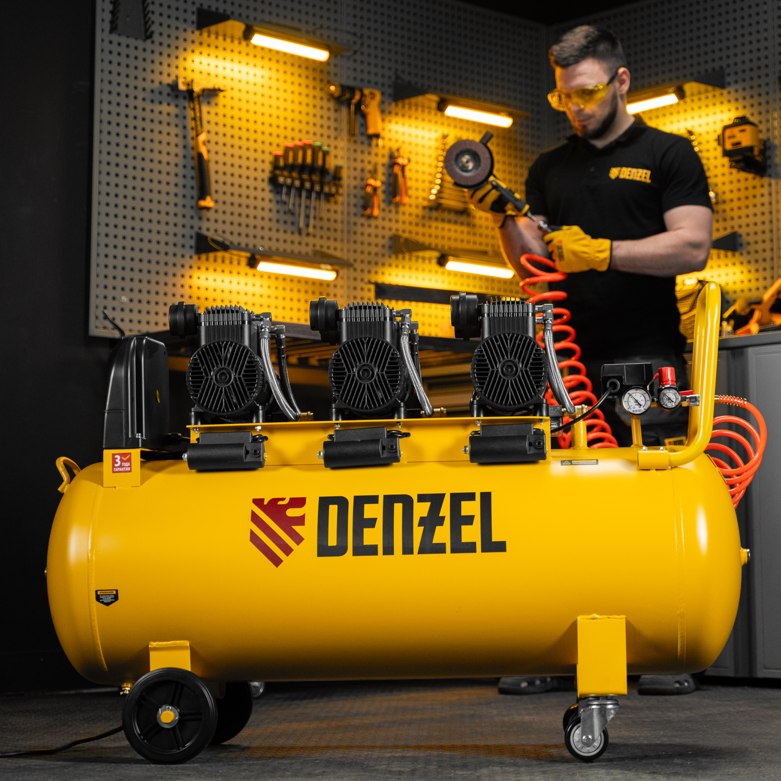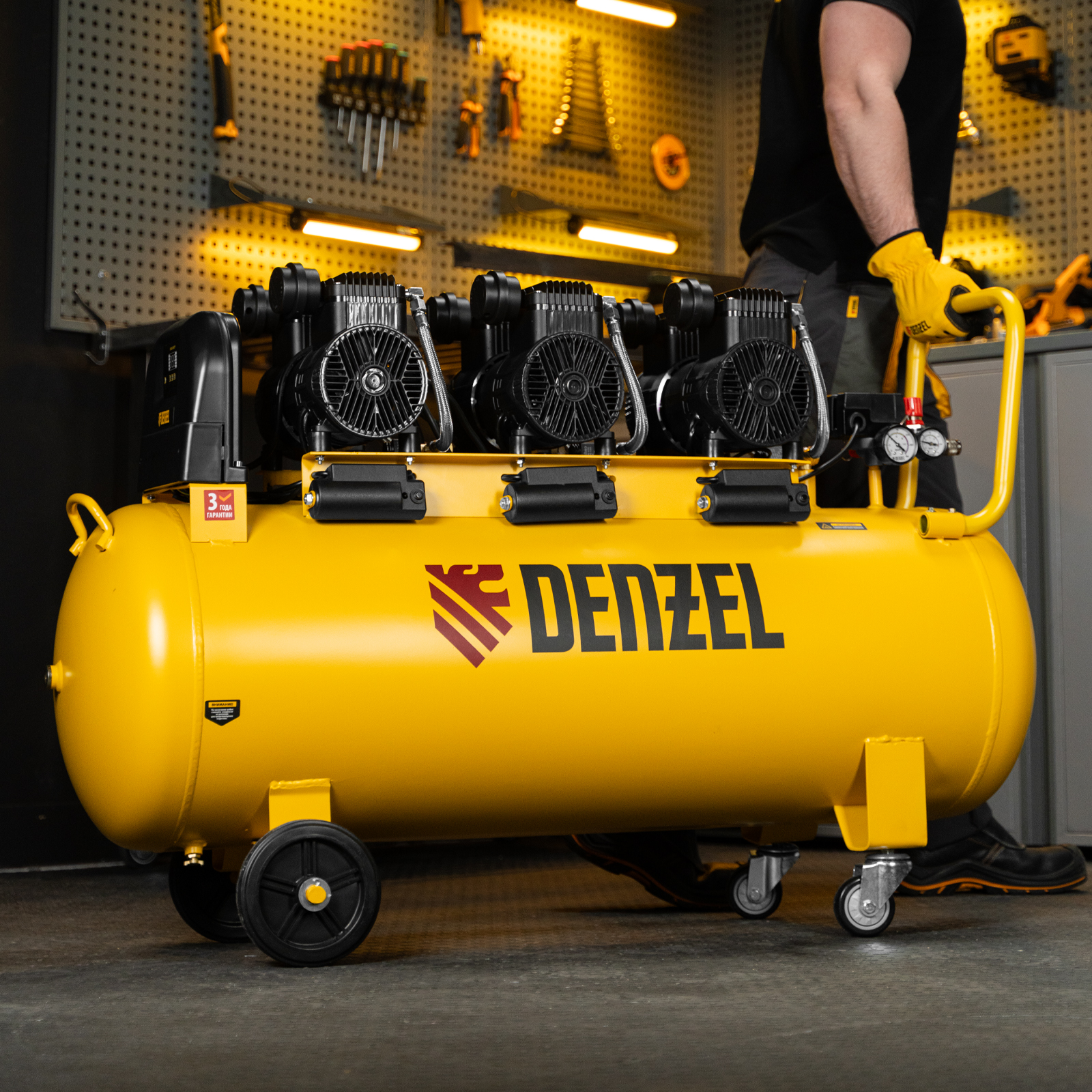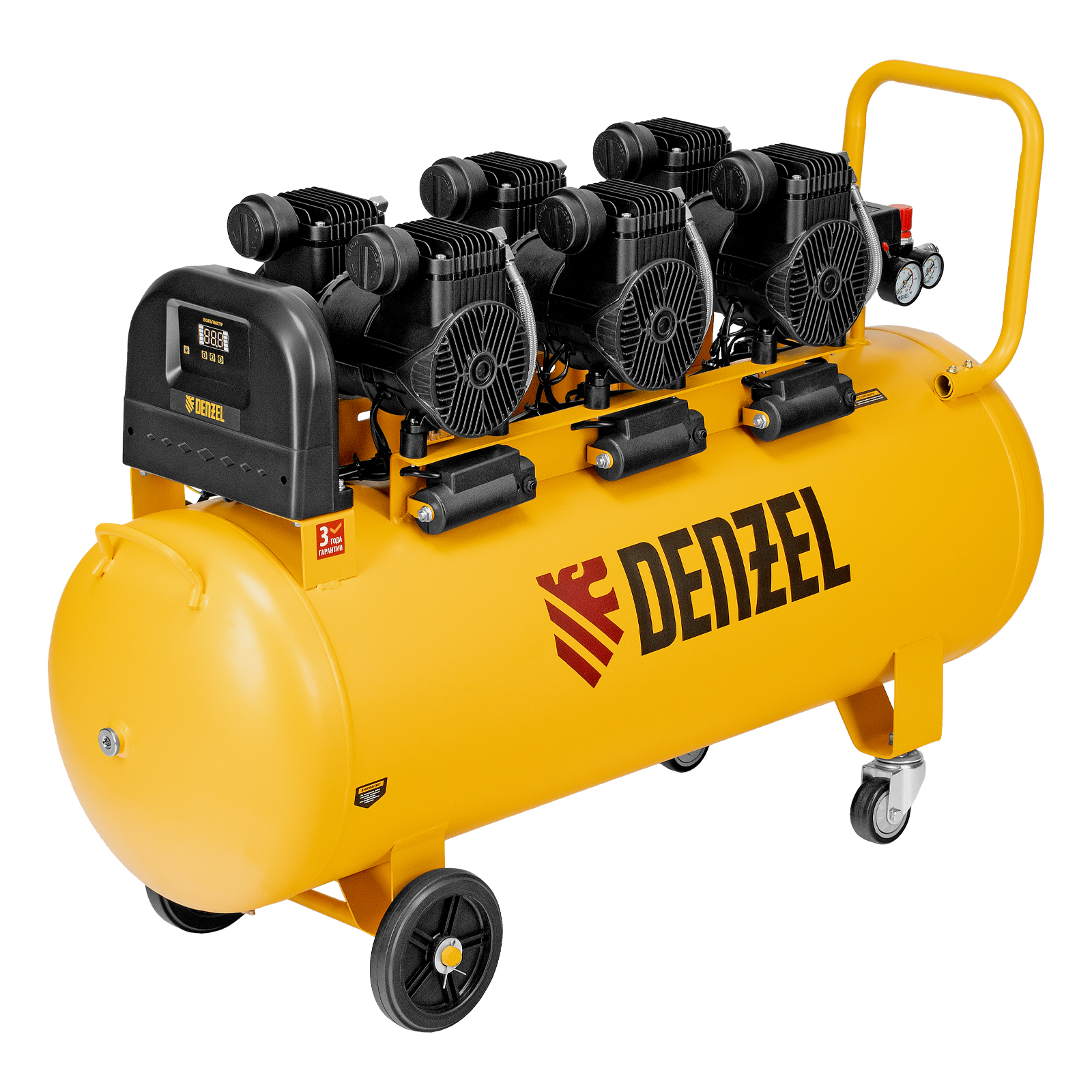 Безмасляный малошумный компрессор Denzel DLP-4500/150 58146 мощностью 4,5 кВт (3 x 1,5 кВт) и производительностью 750 л/мин, с ресивером объемом 150 л, оснащен двигателем со скоростью вращения 2850 об/мин. Предназначен для обеспечения пневмоинструмента сжатым воздухом. Для работы компрессора не требуется масло, поэтому он подходит для проведения покрасочных работ и продувки электронных компонентов. Прямой привод обеспечивает максимально эффективную работу и высокую производительность. Благодаря низкому уровню шума эксплуатация компрессора не вызывает ощущение дискомфорта.