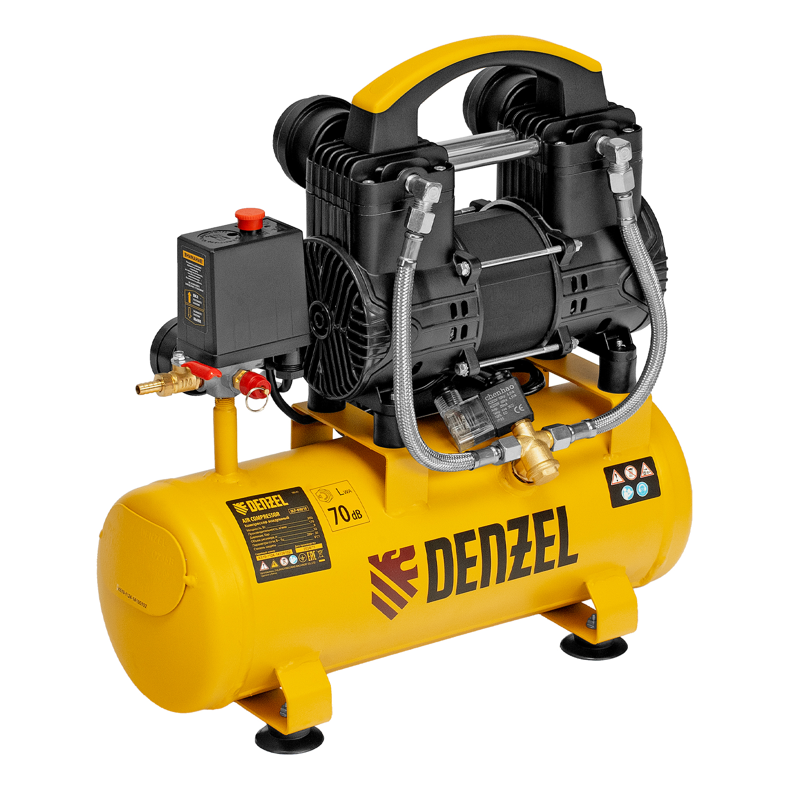 Безмасляный малошумный компрессор Denzel DLP-950/10 58141 мощностью 950 Вт и производительностью 170 л/мин, с ресивером объемом 10 л, оснащен двигателем со скоростью вращения 2850 об/мин. Предназначен для обеспечения пневмоинструмента сжатым воздухом. Для работы компрессора не требуется масло, поэтому он подходит для проведения покрасочных работ и продувки электронных компонентов. Прямой привод обеспечивает максимально эффективную работу и высокую производительность. Благодаря низкому уровню шума эксплуатация компрессора не вызывает ощущение дискомфорта. Для подключения шланга пневмомагистрали или пневматического инструмента используется штуцер елка.
