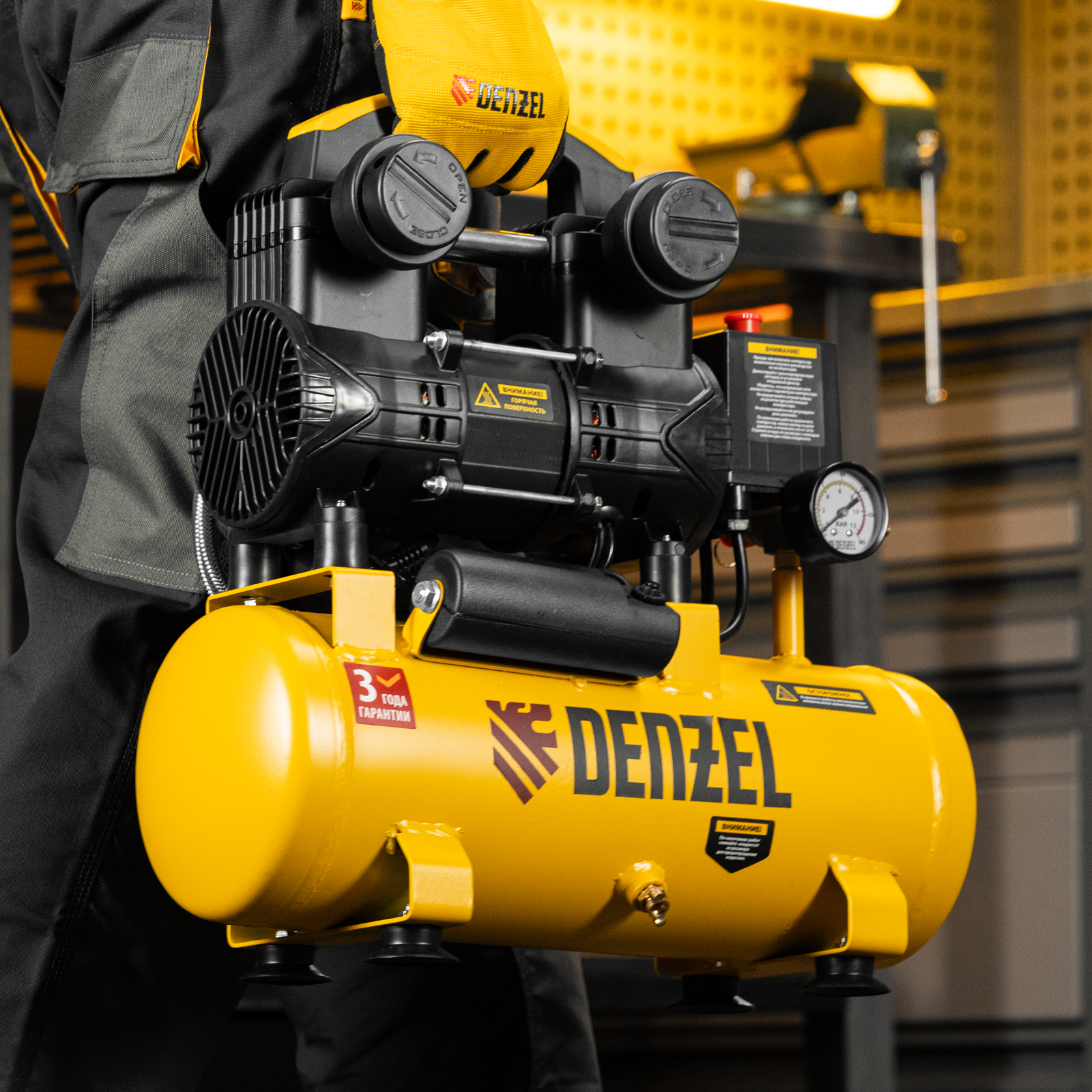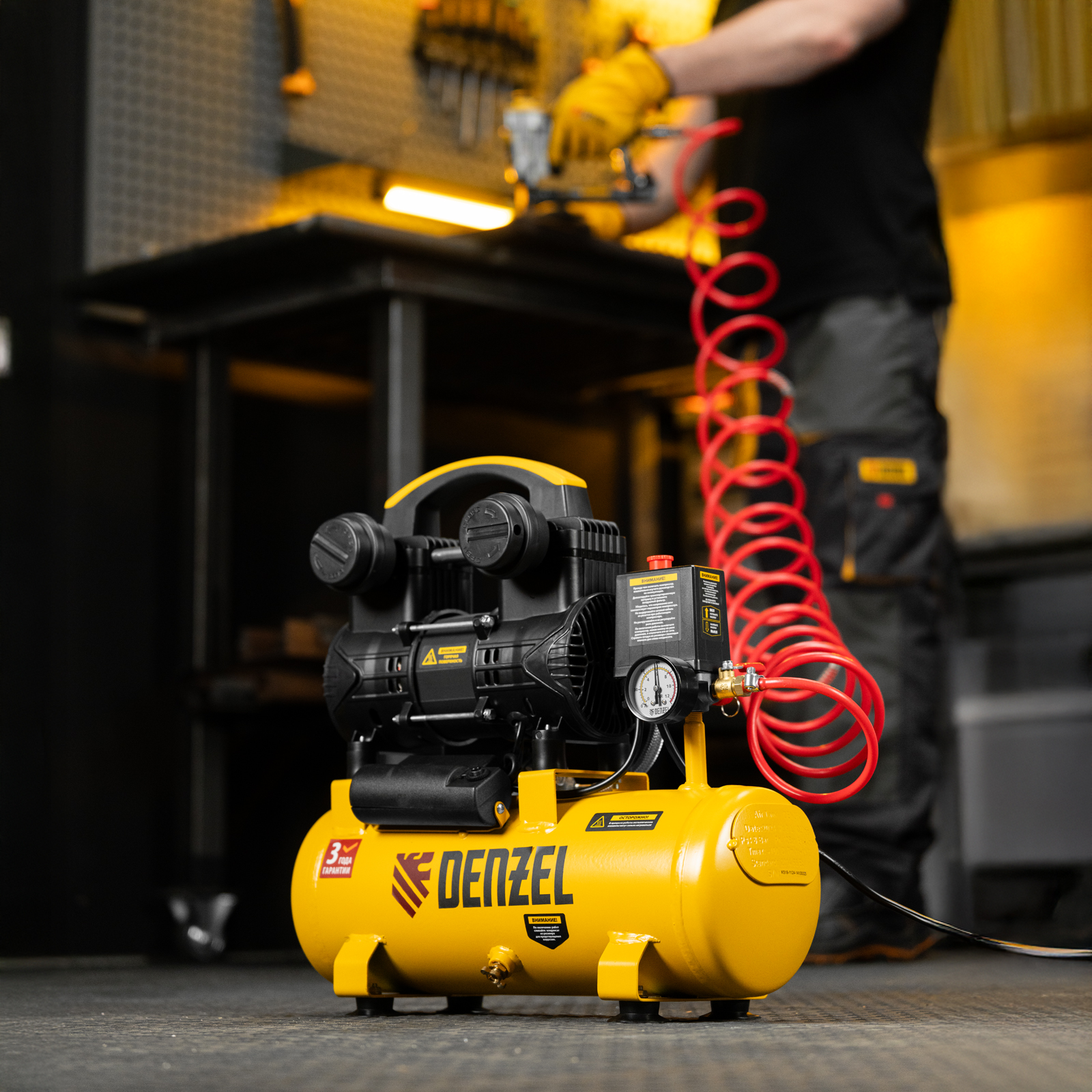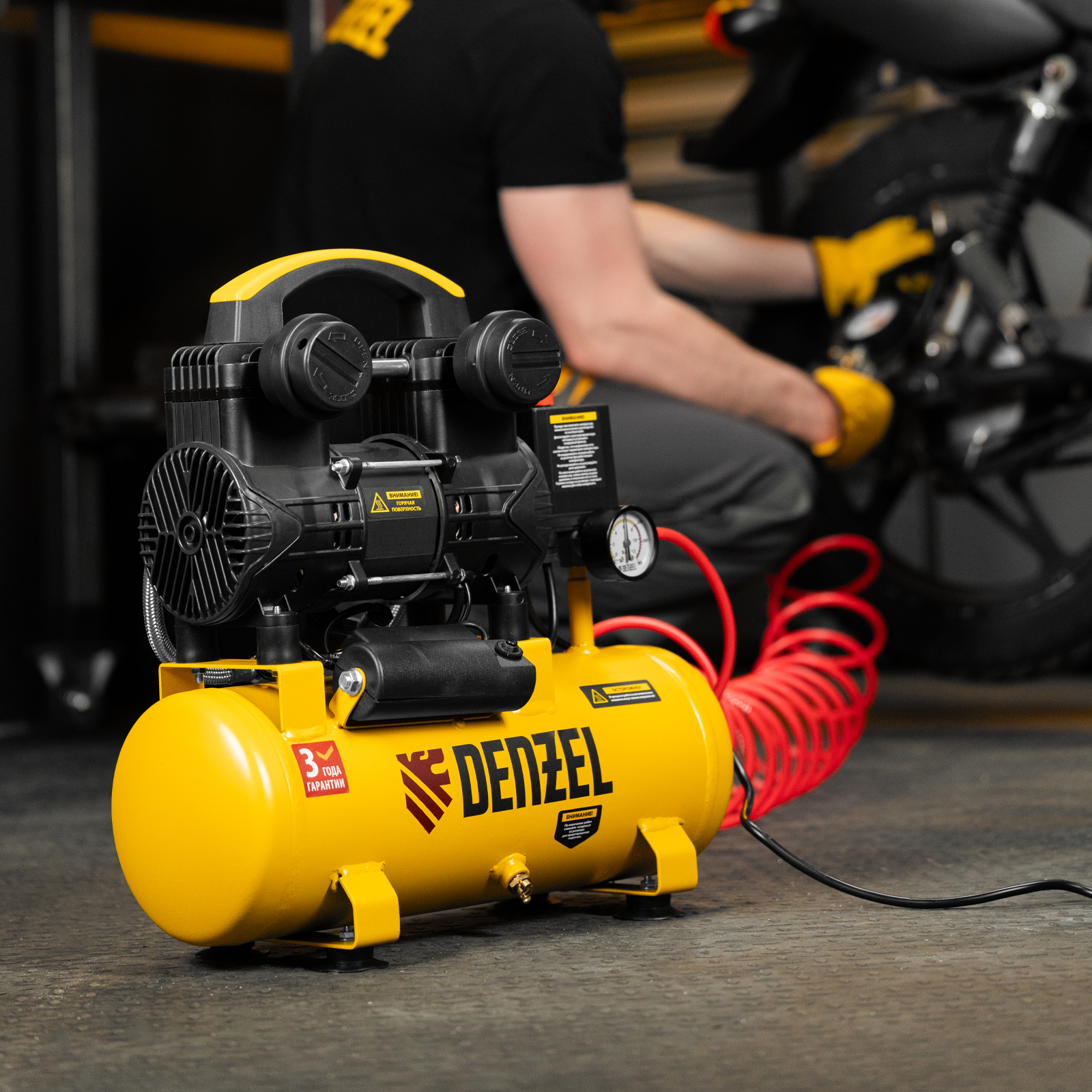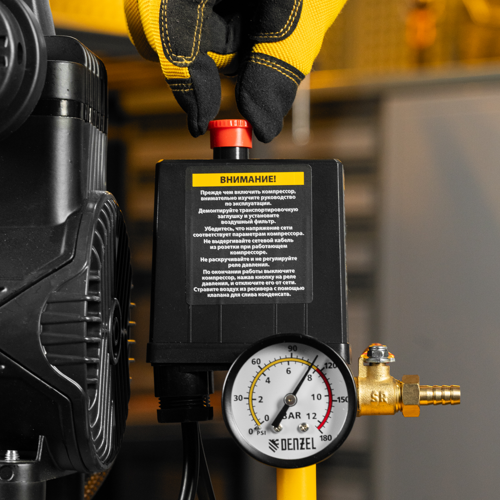 - Контроль давления — компрессор оснащен удобным манометром.