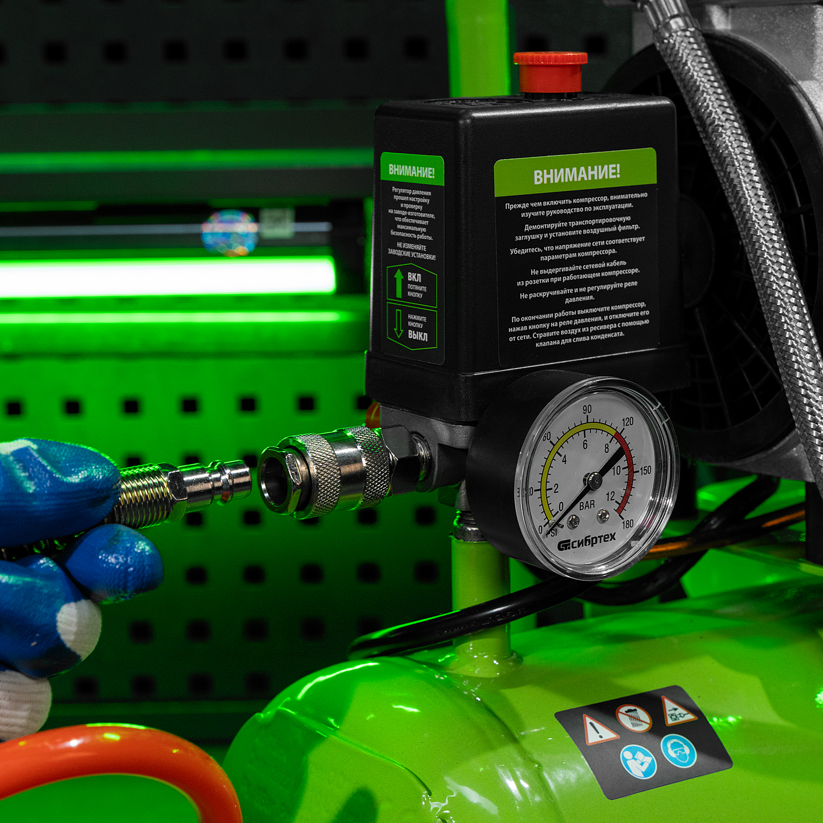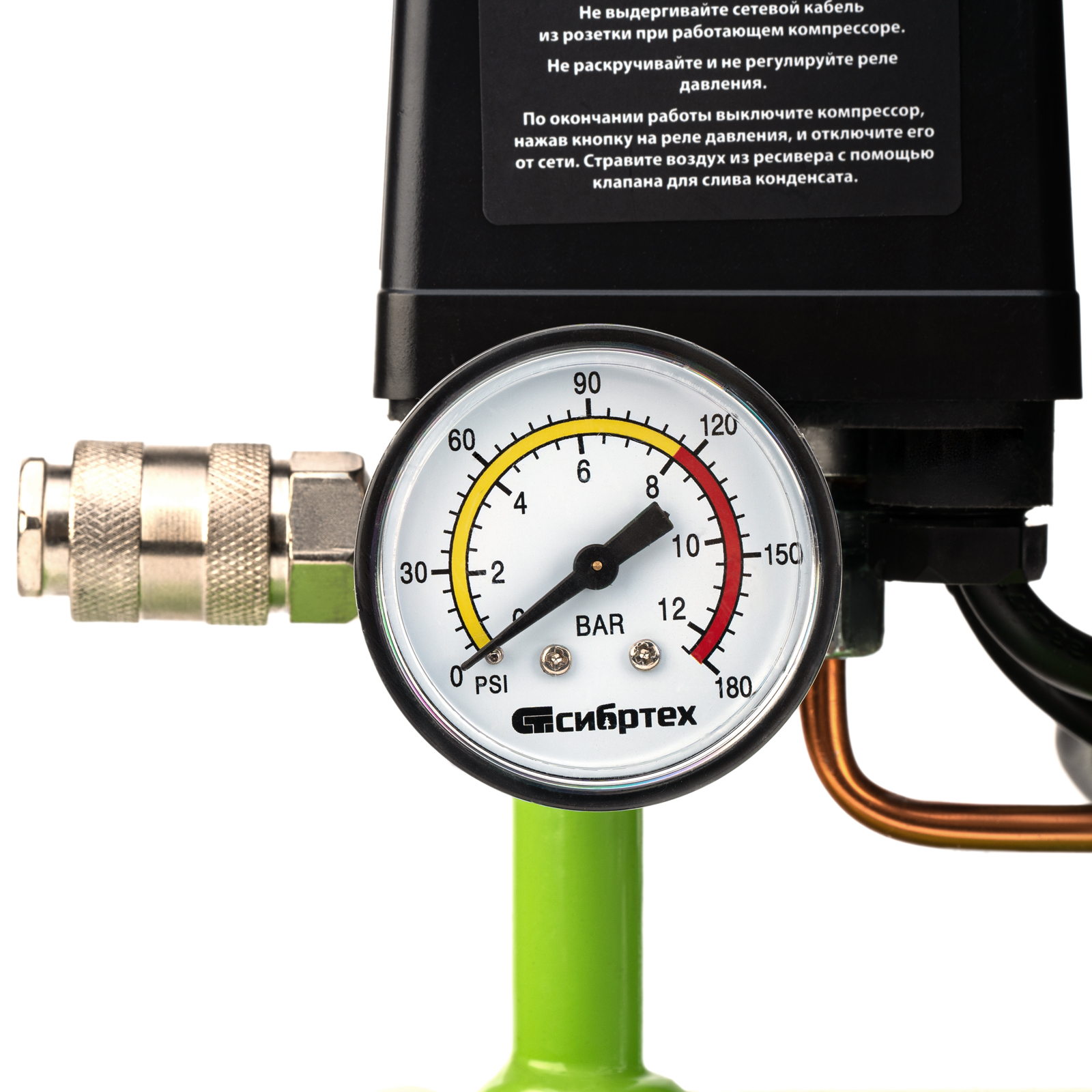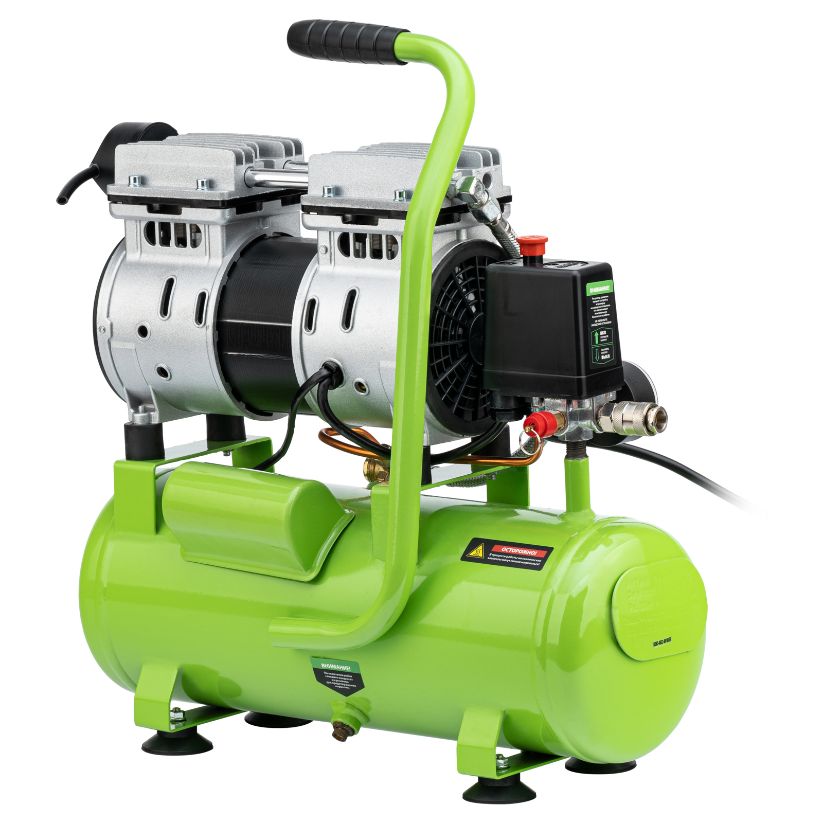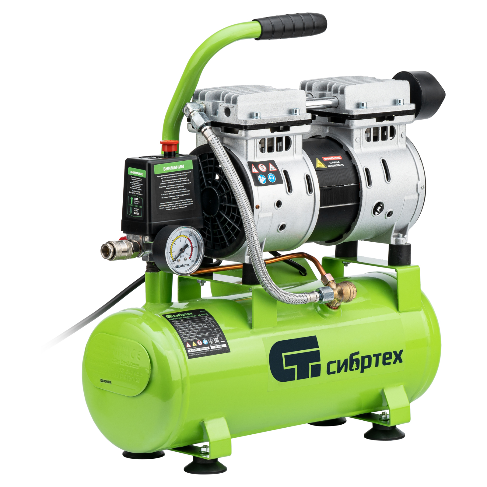 - Контроль рабочих параметров — компрессор оборудован механическим манометром для отслеживания давления.