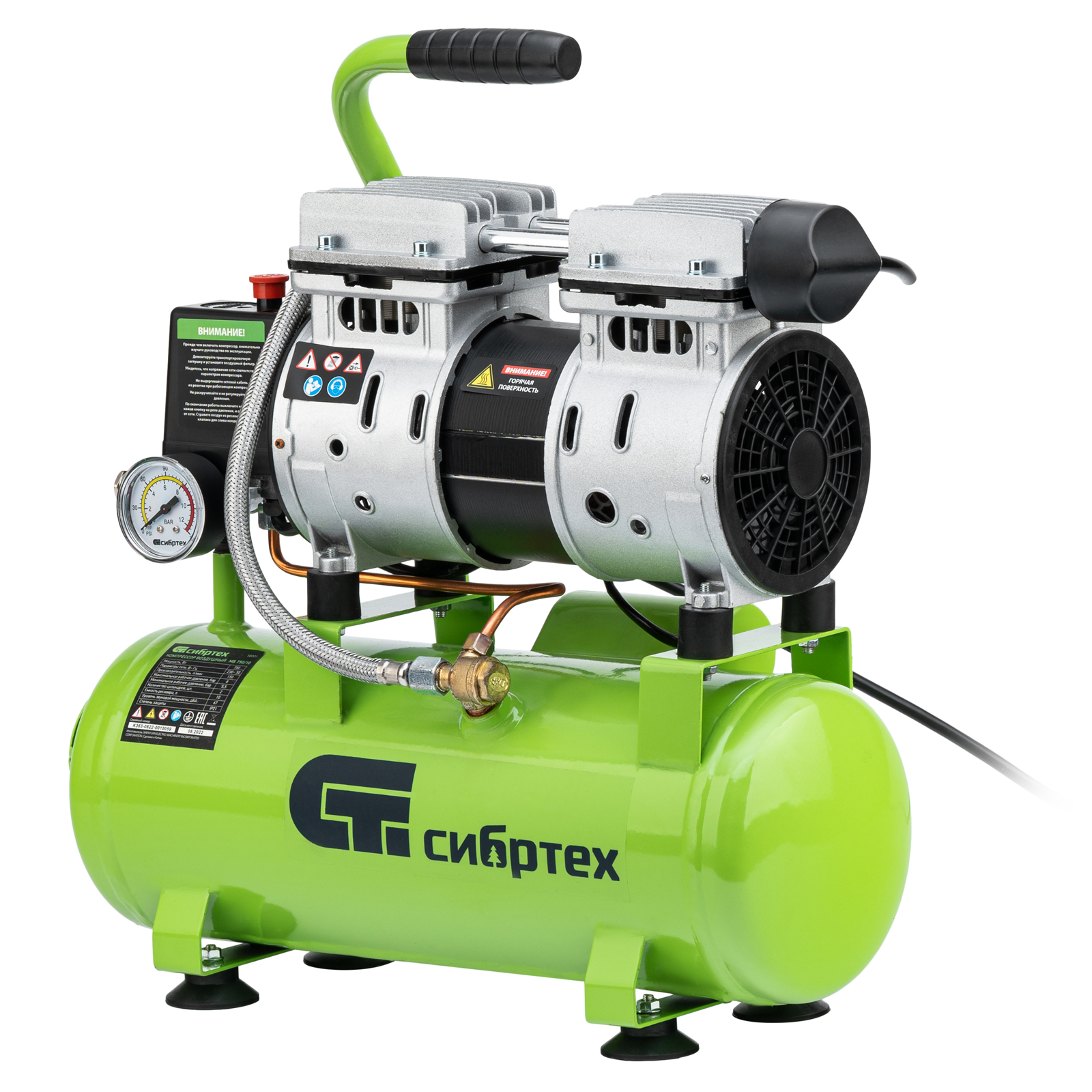 Безмасляный малошумный компрессор Сибртех МБ 750/10 58001 мощностью 750 Вт и объемом ресивера 10 л имеет производительность на входе 150 л/мин и сжимает воздух под давлением до 8 бар. Используется для обеспечения функционирования пневмоинструмента, например, краскораспылителя или пневматического шуруповерта. Для работы устройства не требуется масло, поэтому воздух на выходе не содержит его частиц. Компрессор оптимален для проведения покрасочных работ и продувки электронных компонентов.,Одна из ключевых особенностей компрессора — низкий уровень шума (в районе 65 дБ), позволяющий использовать устройство в жилом помещении без дискомфорта для людей.
