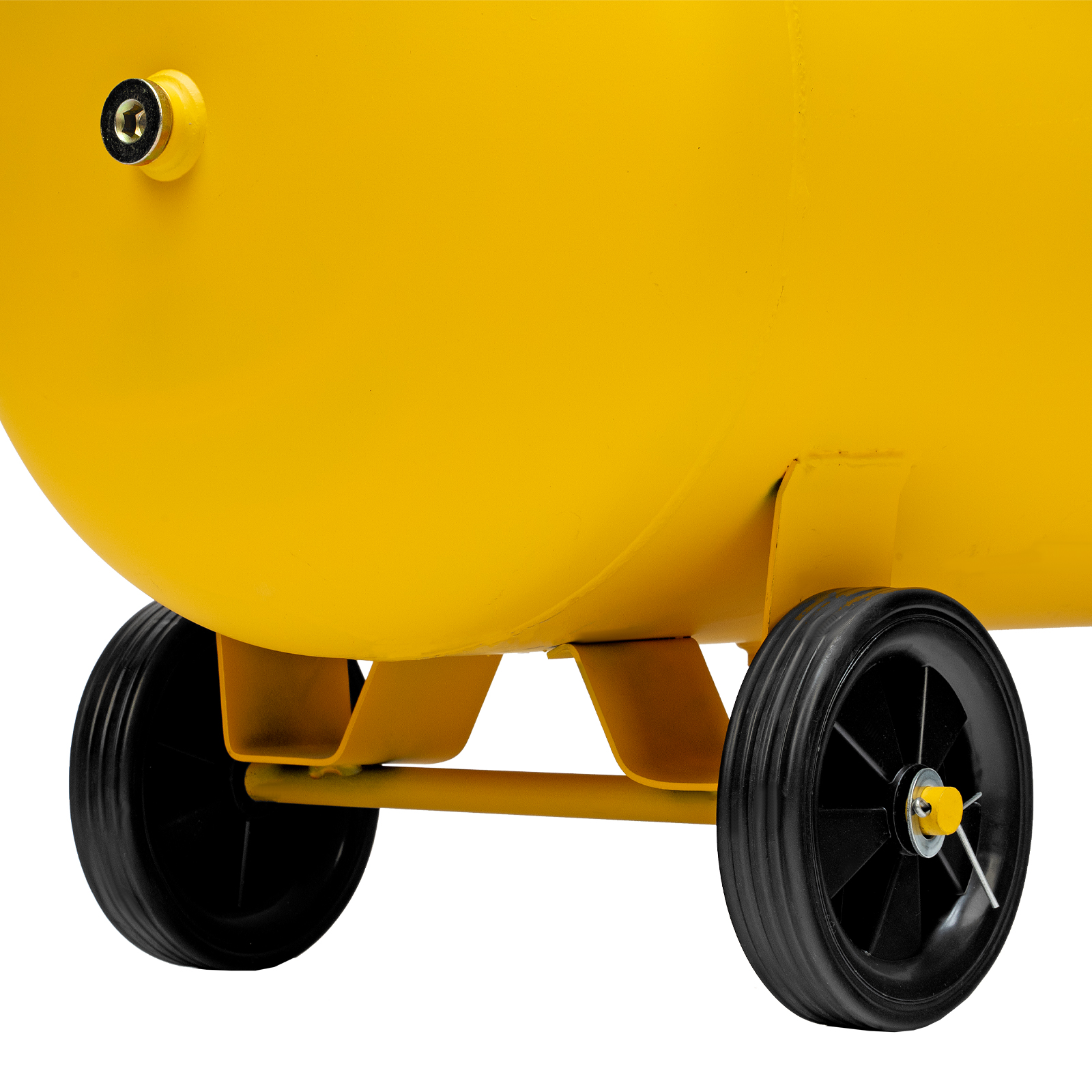 - Мобильность — 4 колеса, 2 из которых поворотные, упрощают перемещение компрессора по рабочей площадке.