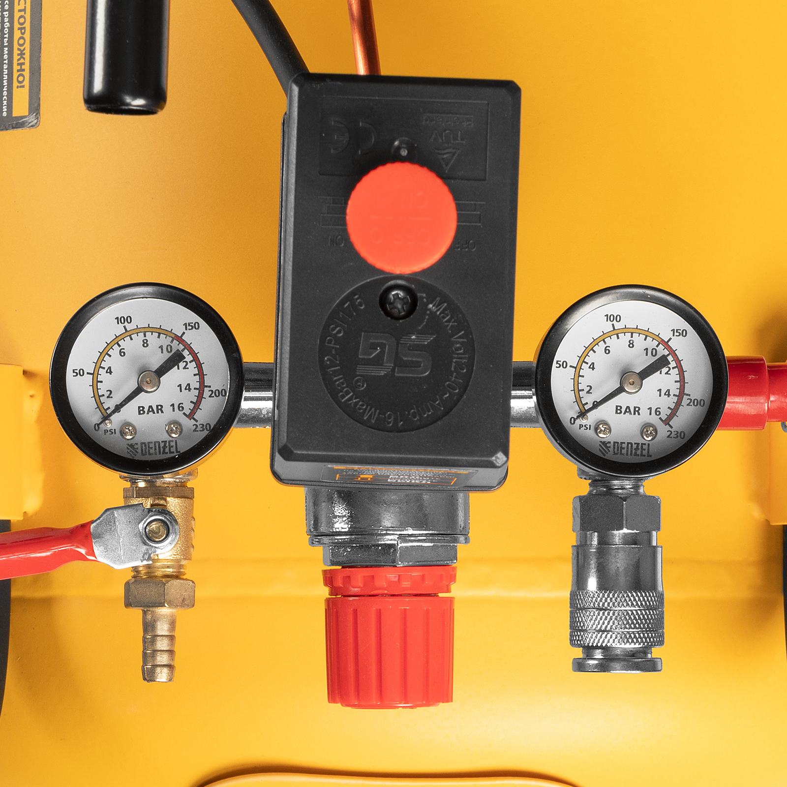 - Удобный контроль давления — 2 манометра имеют увеличенный до 50 мм диаметр, поэтому считать показания давления в ресивере и на выходной магистрали не составит труда.