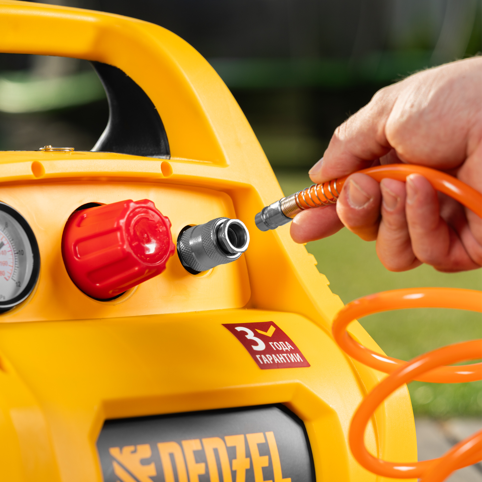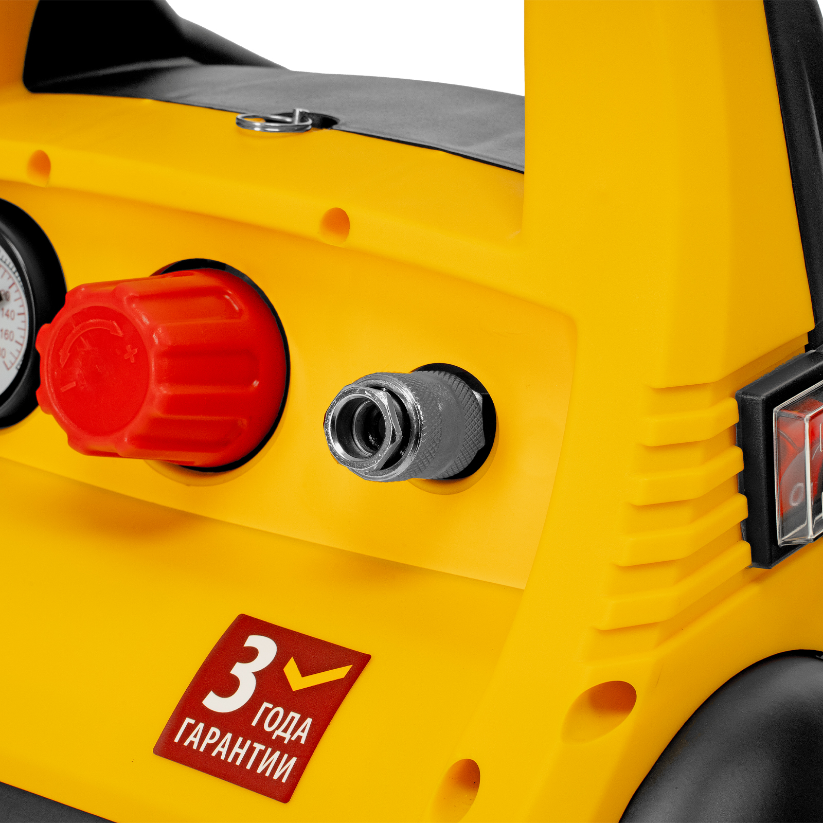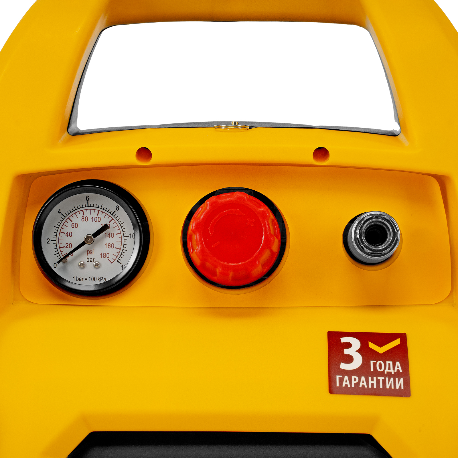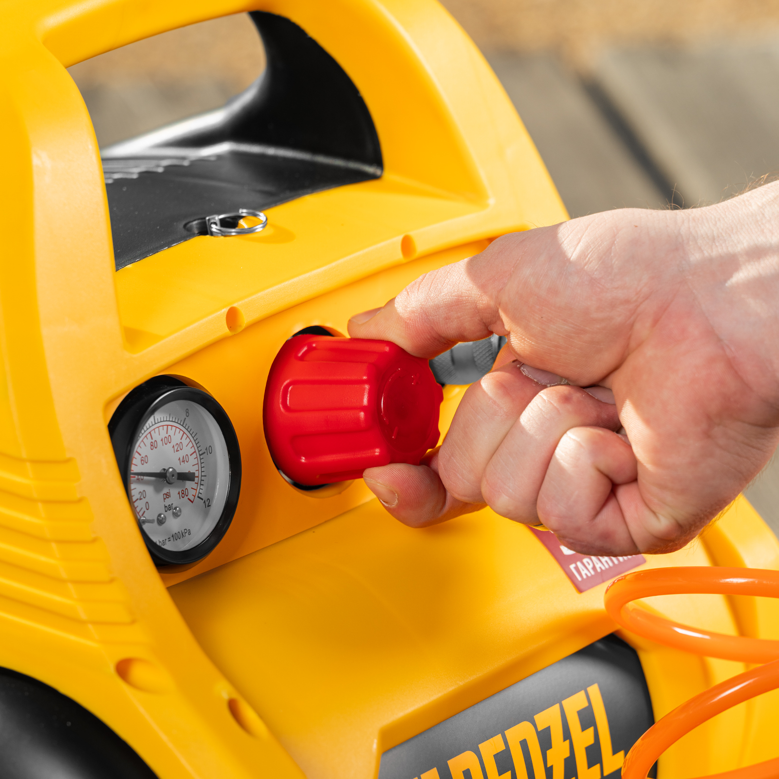 - Предохранительный клапан — изделие надежно защищено от превышения давления в ресивере, что упрощает работу и продлевает срок службы.
