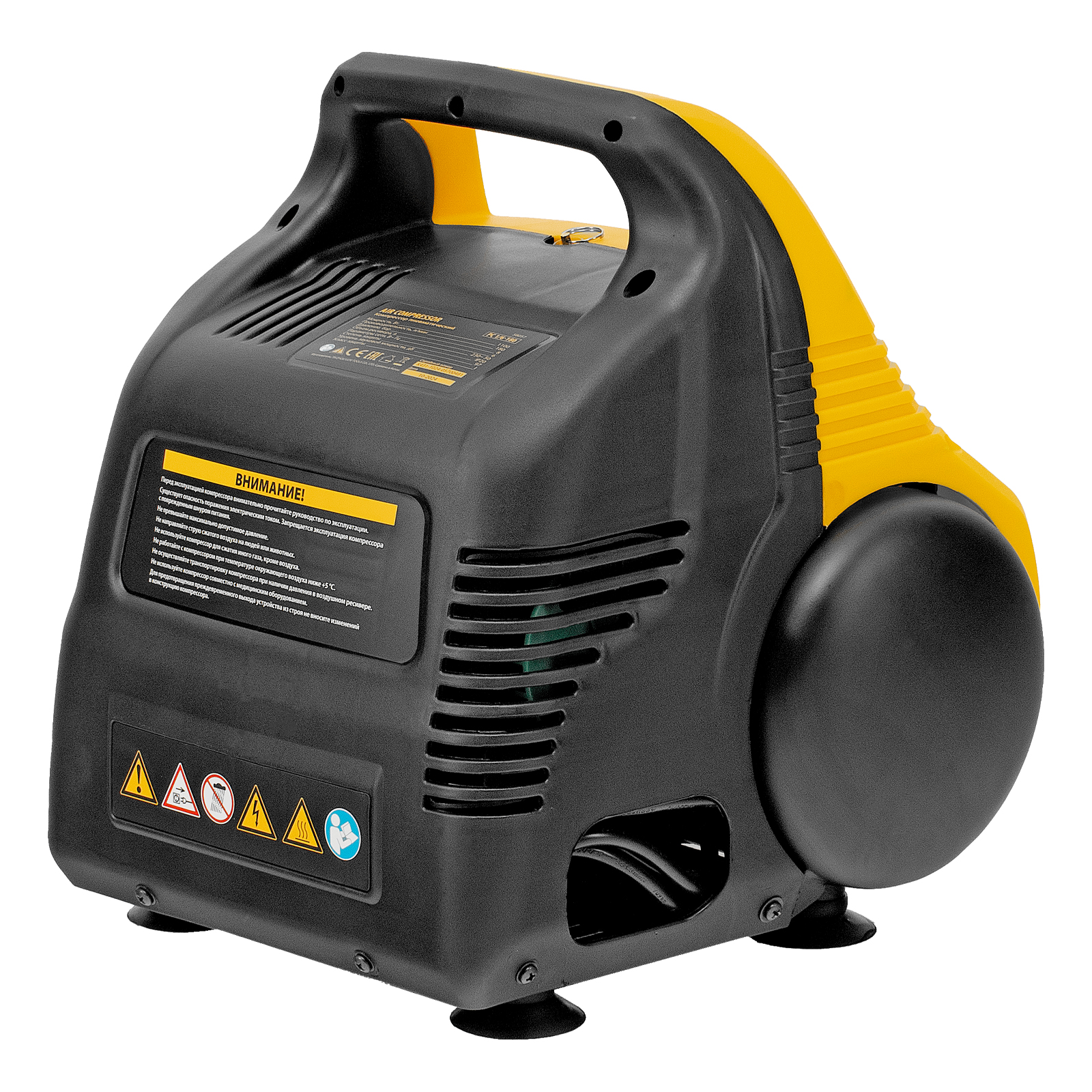 - Безопасность использования — конструкция корпуса исключает вероятность ожога об двигатель и компрессорную головку, поскольку все элементы находятся внутри.