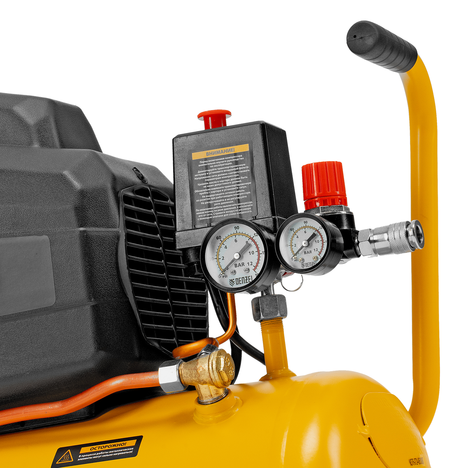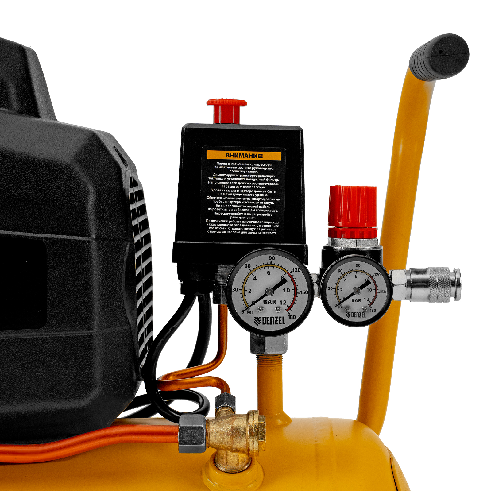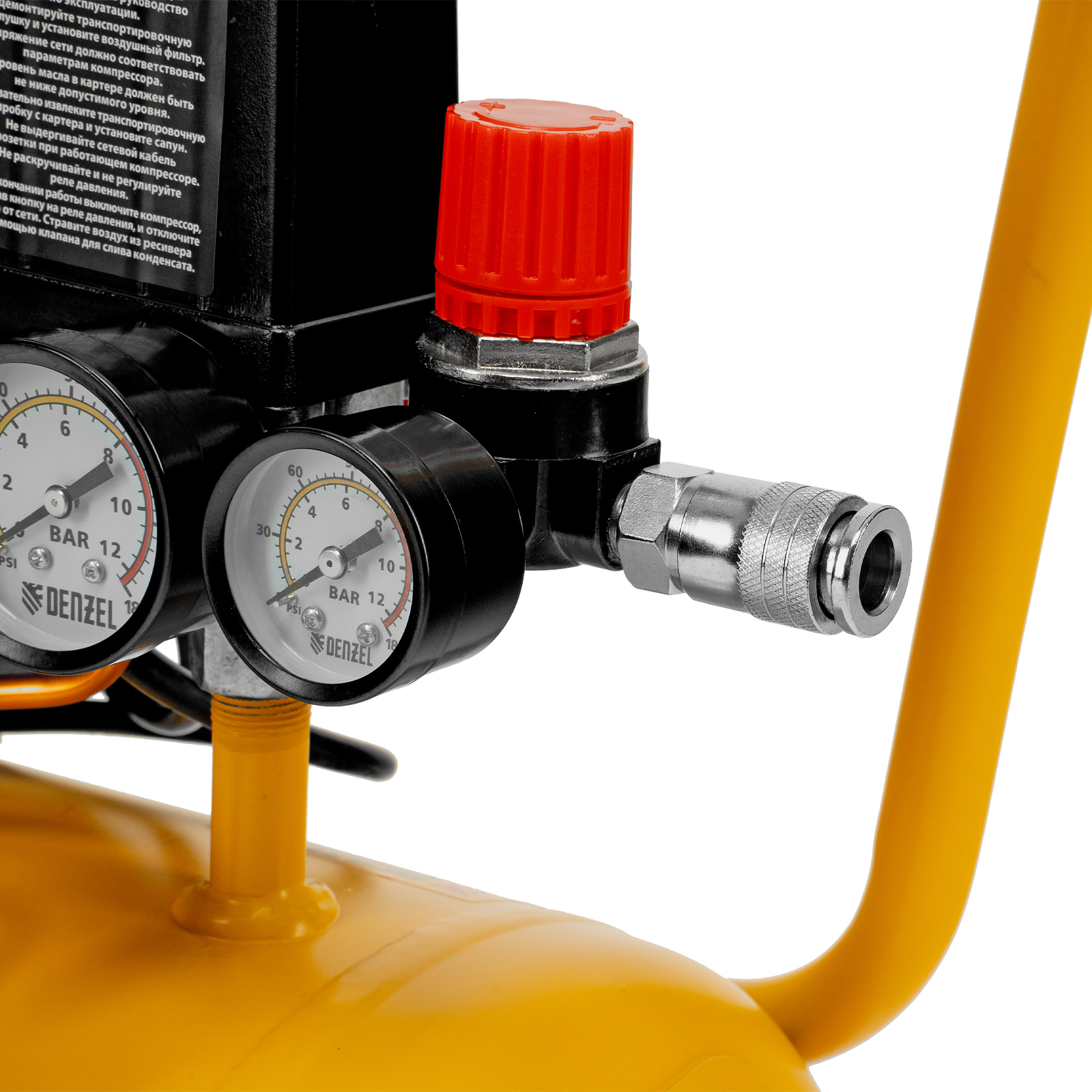 Удобный контроль рабочих параметров — 2 манометра отображают давление в ресивере и выходной магистрали.