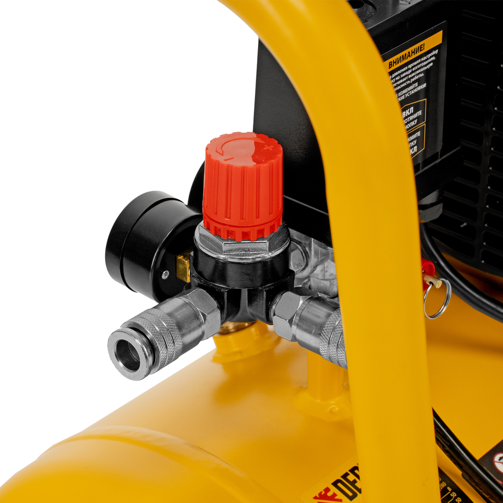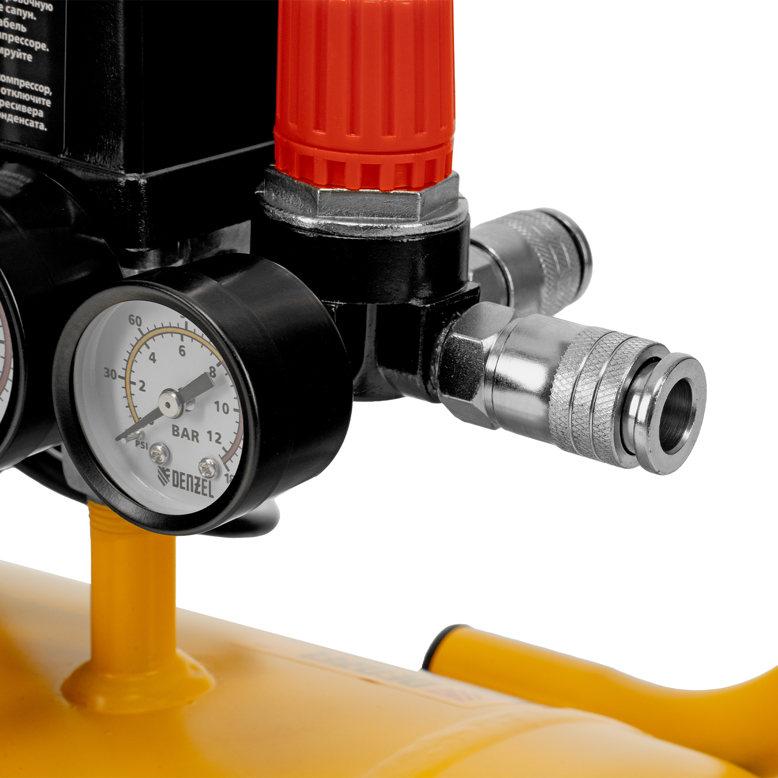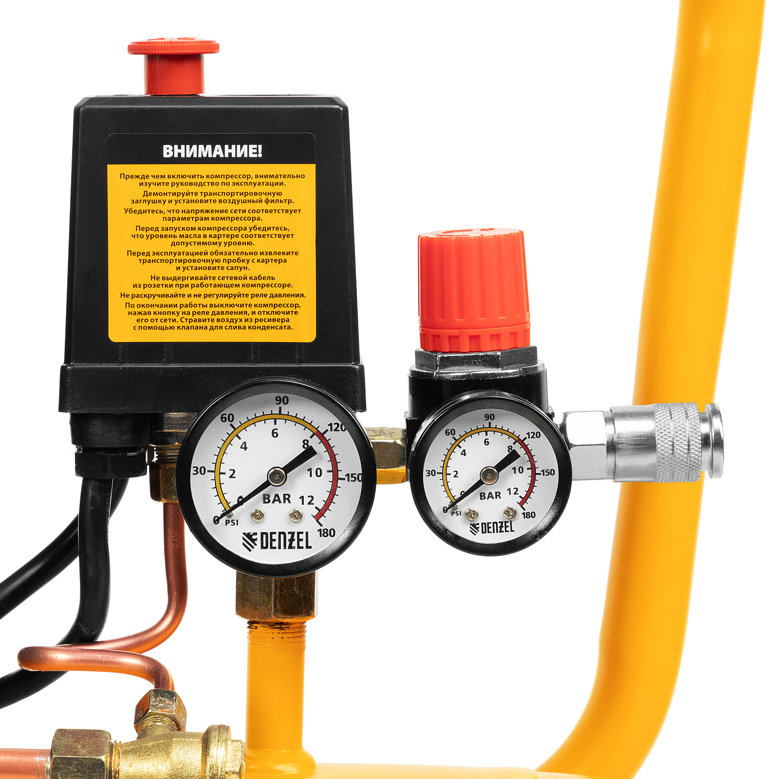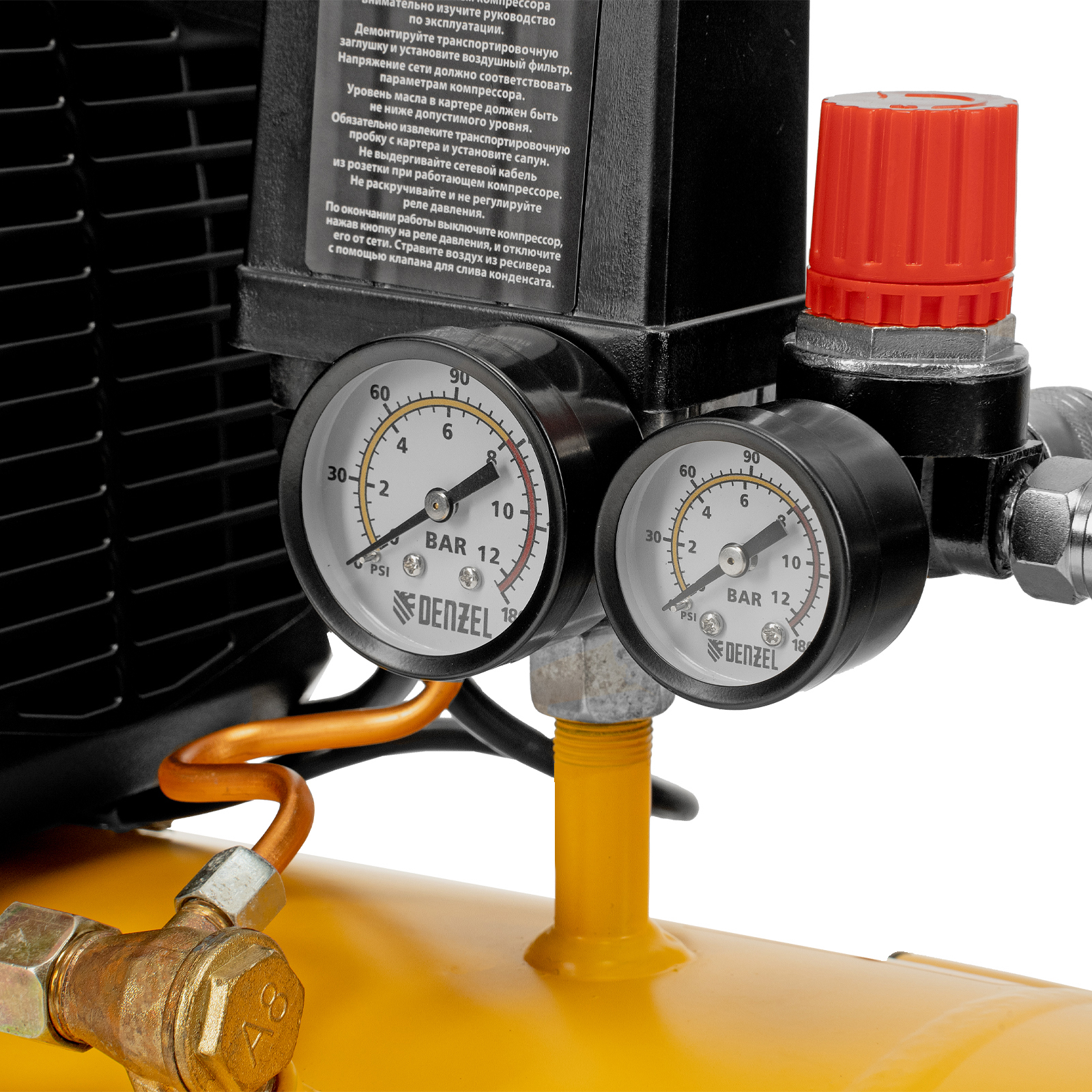 Контроль рабочих параметров — два манометра отображают давление в ресивере и выходной магистрали.