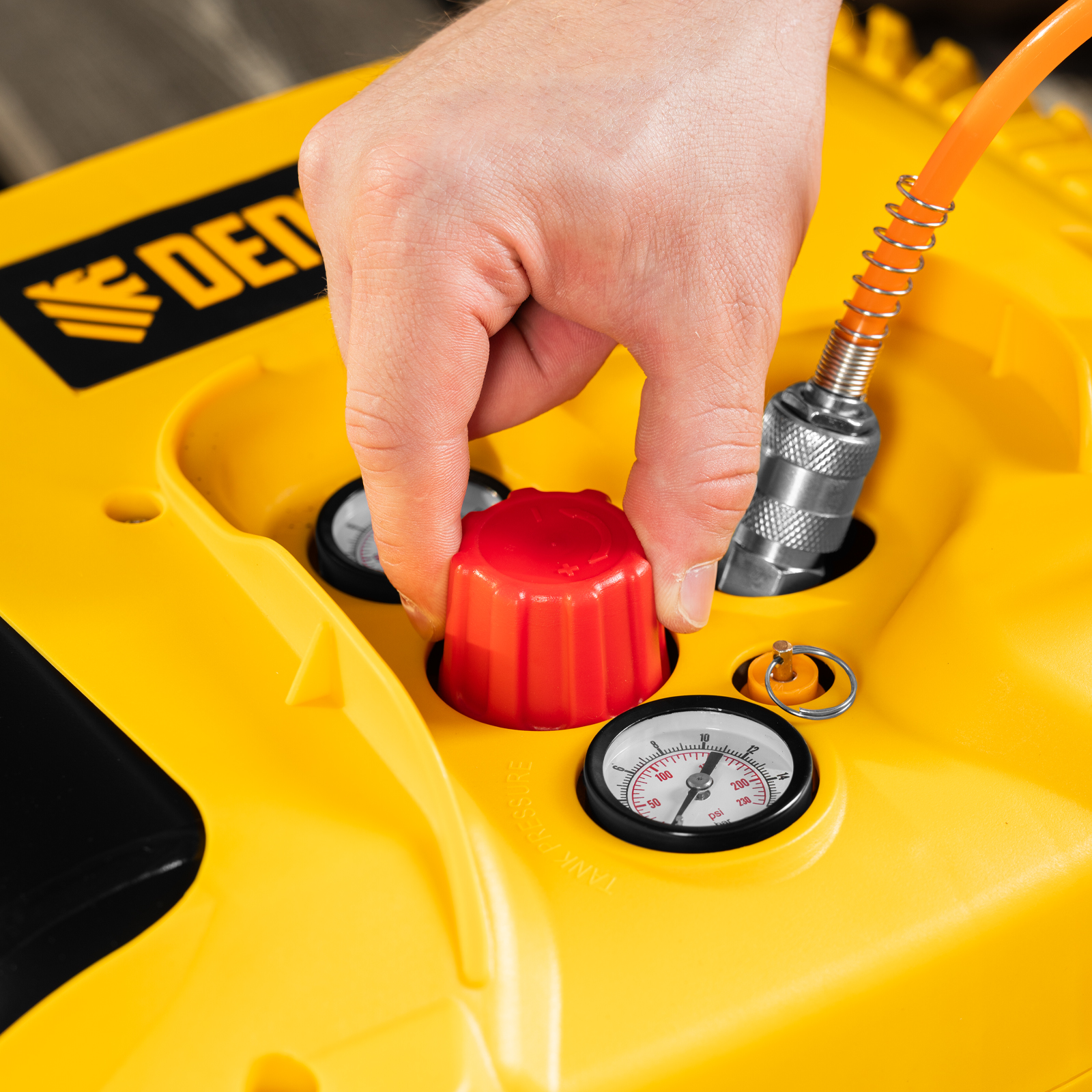 - Ресивер объемом 5 л — несмотря на портативное исполнение, устройство накапливает достаточный запас сжатого воздуха для бесперебойной работы.