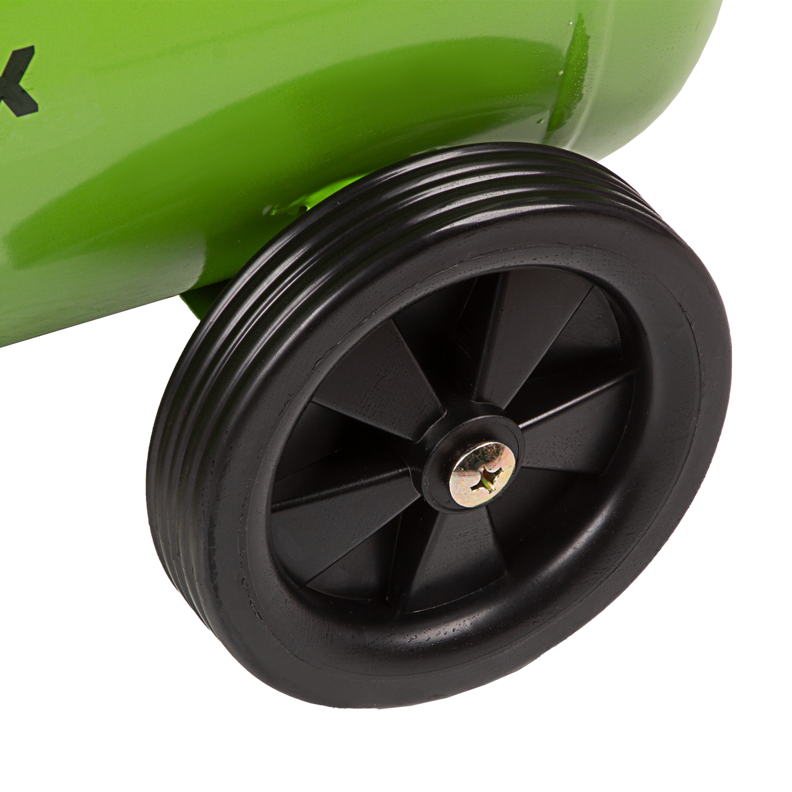 - Простота перемещения — поворотные колеса и удобная рукоятка помогают без усилий развернуть или переставить компрессор.