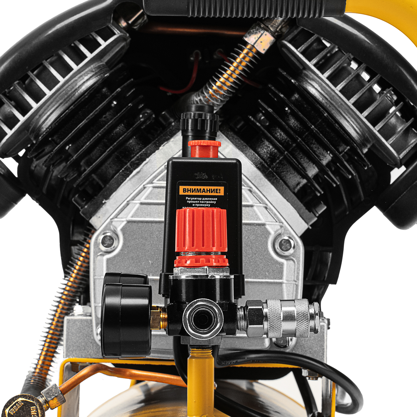 - Контроль давления и расхода воздуха — компрессор оснащен регулятором и двумя манометрами.