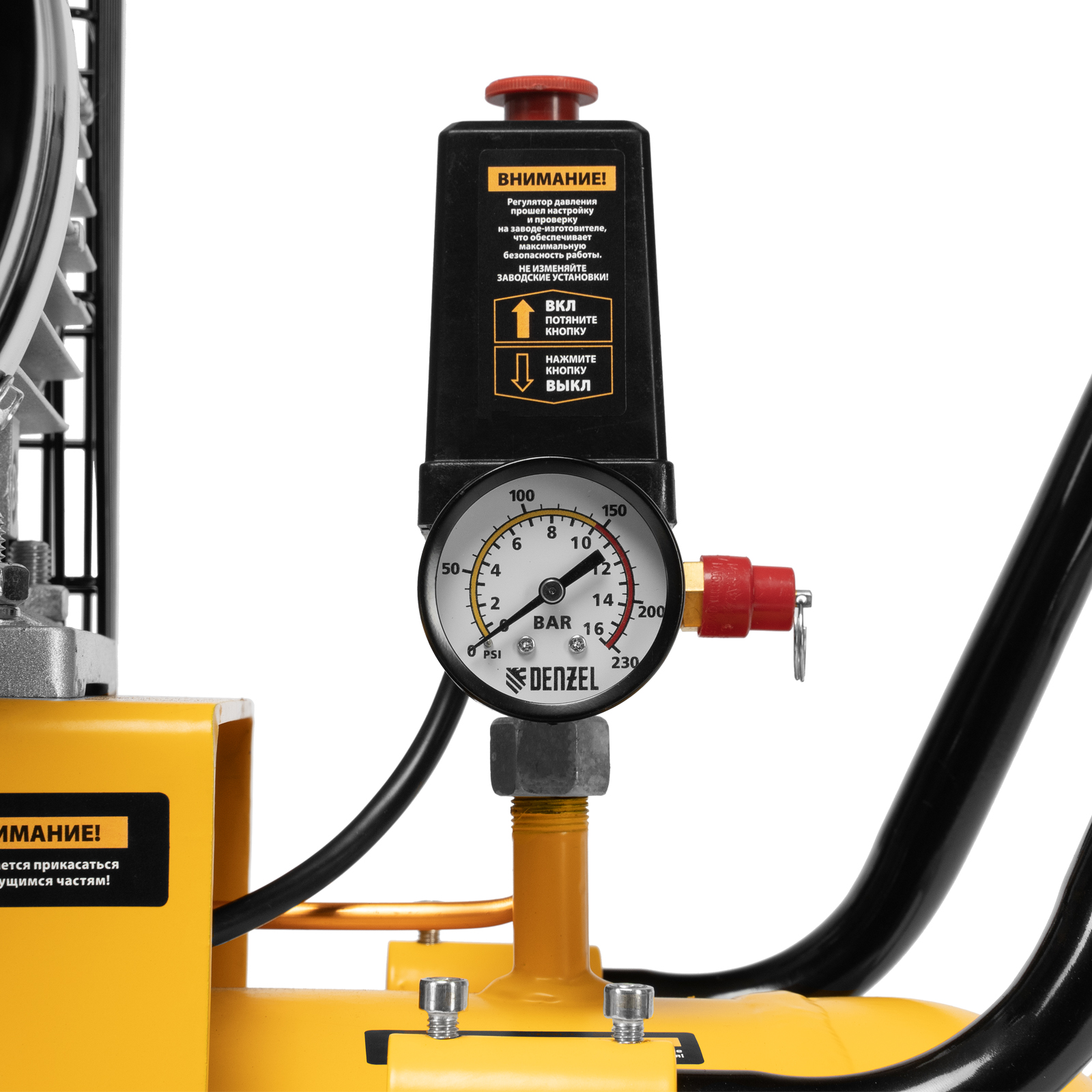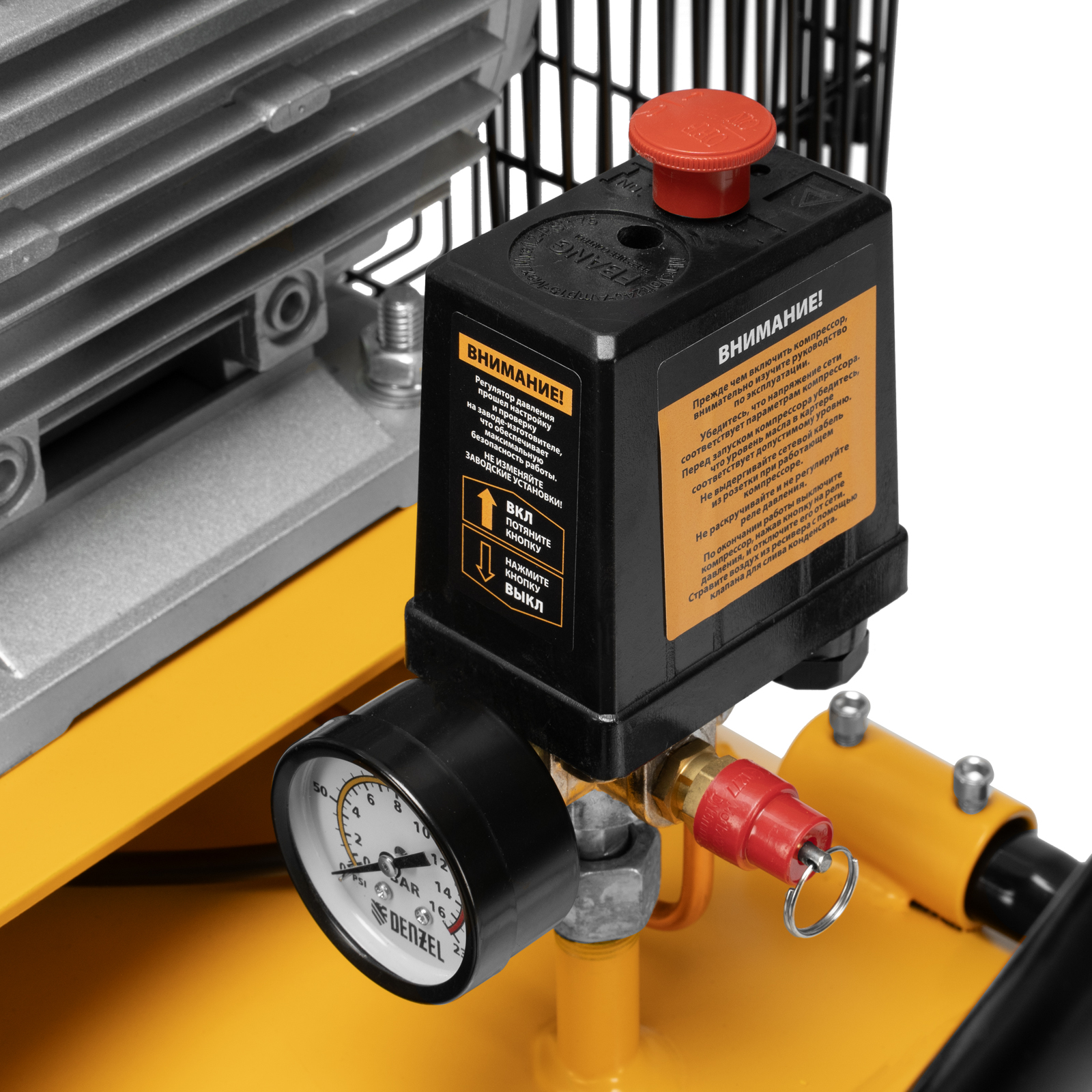 - Безопасность — в случае превышения максимально допустимого давления в ресивере срабатывает предохранительный клапан.