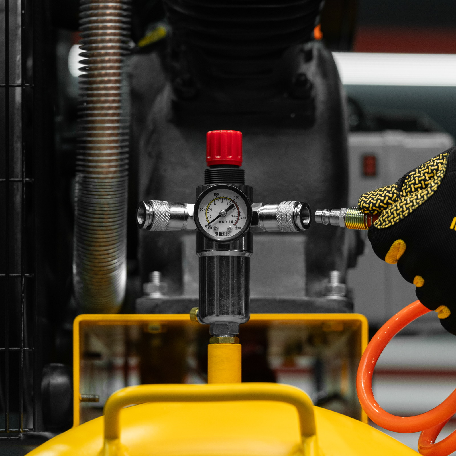 - Регулировка давления на выходе — можно установить оптимальное значение для подключения пневмоинструмента.