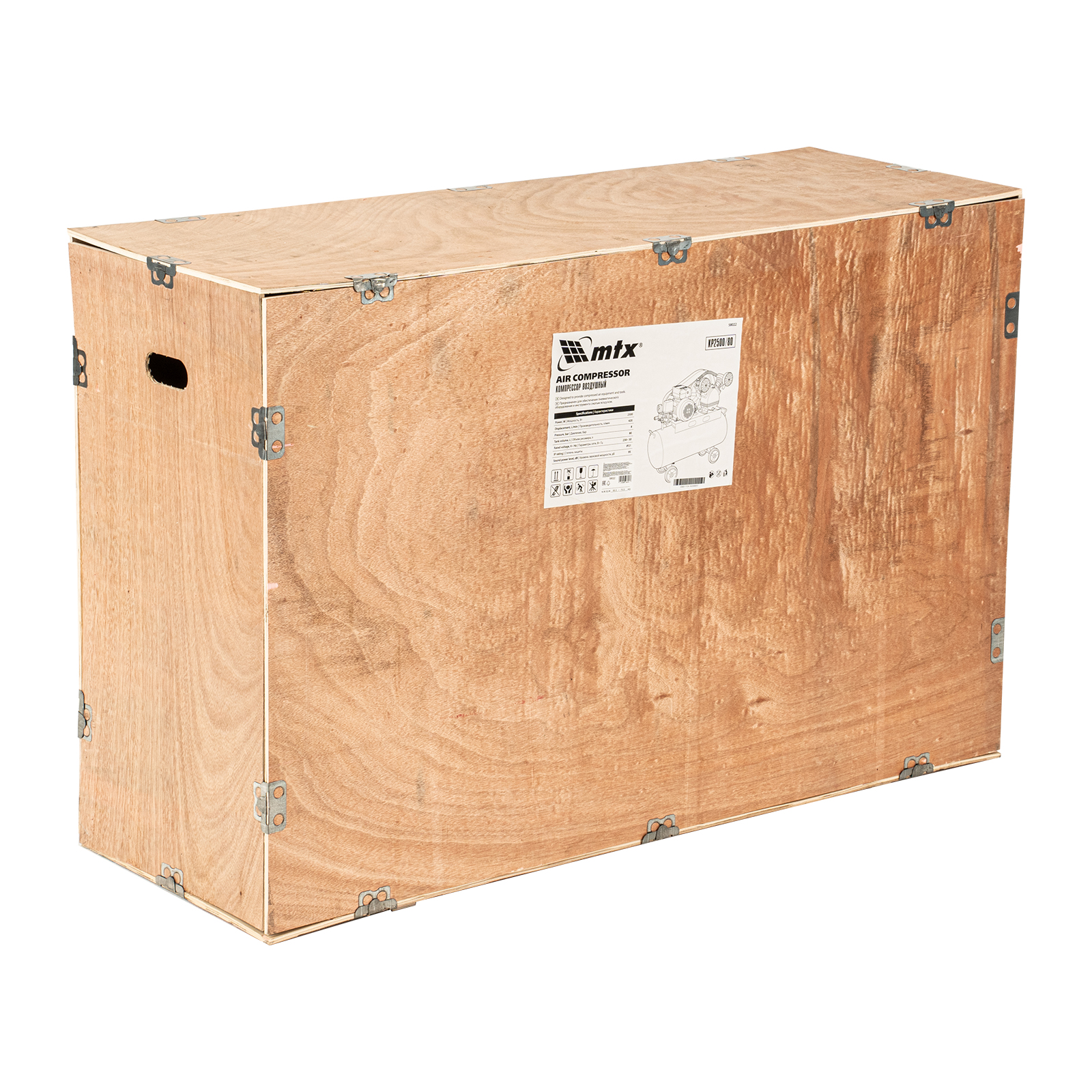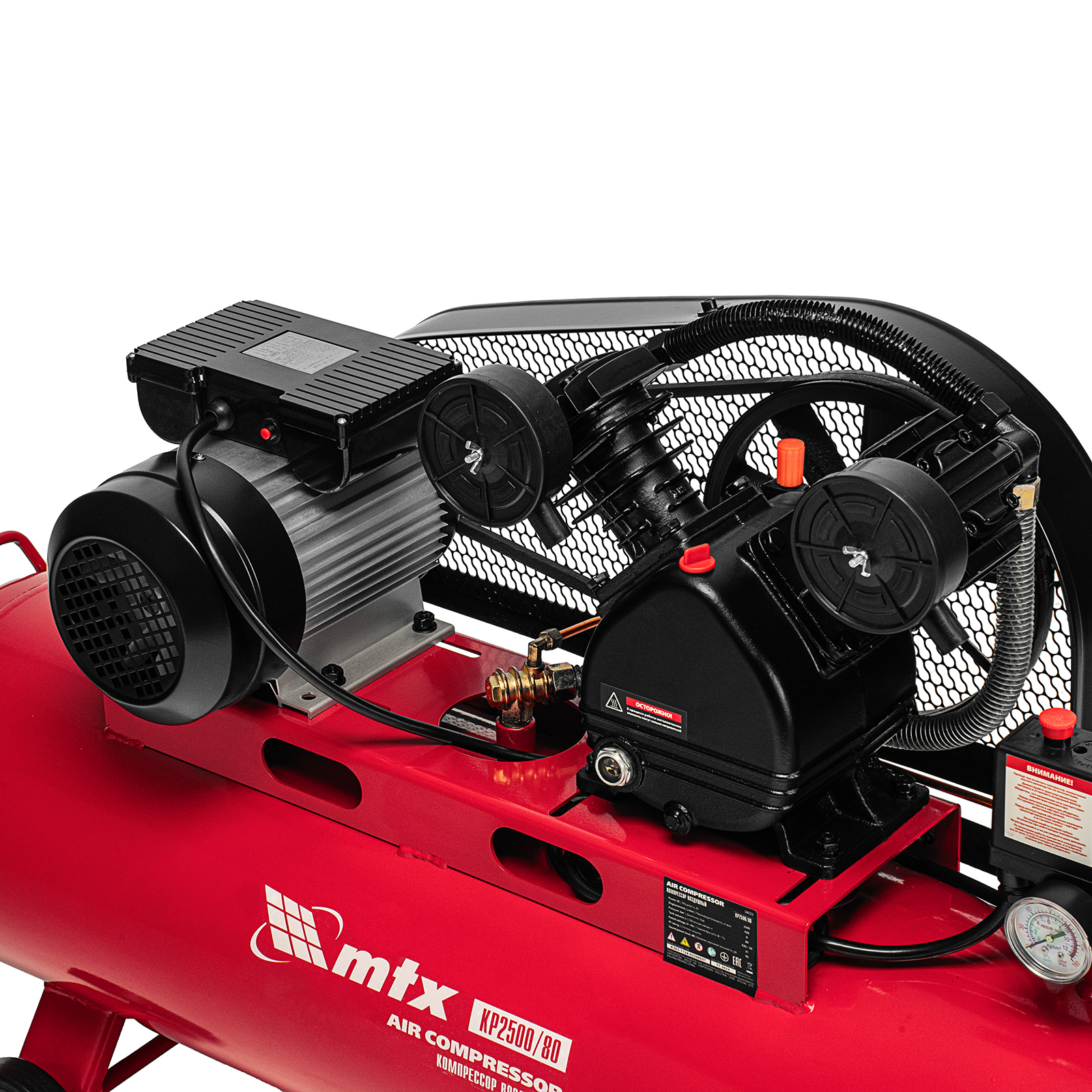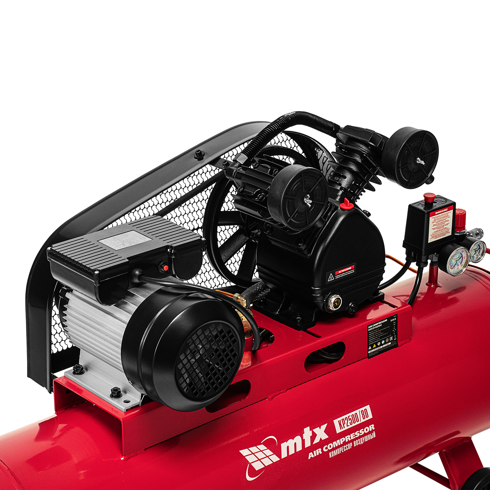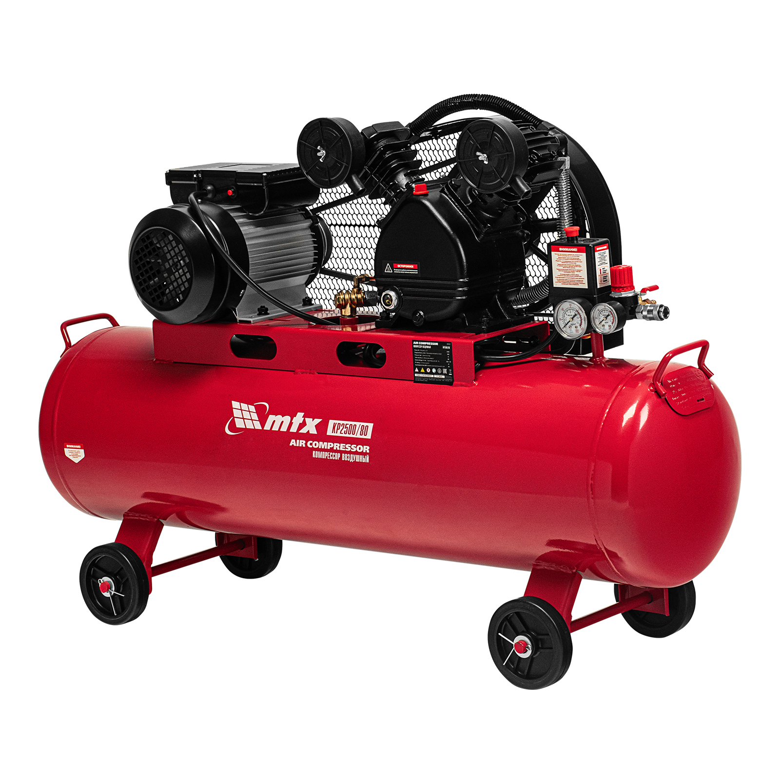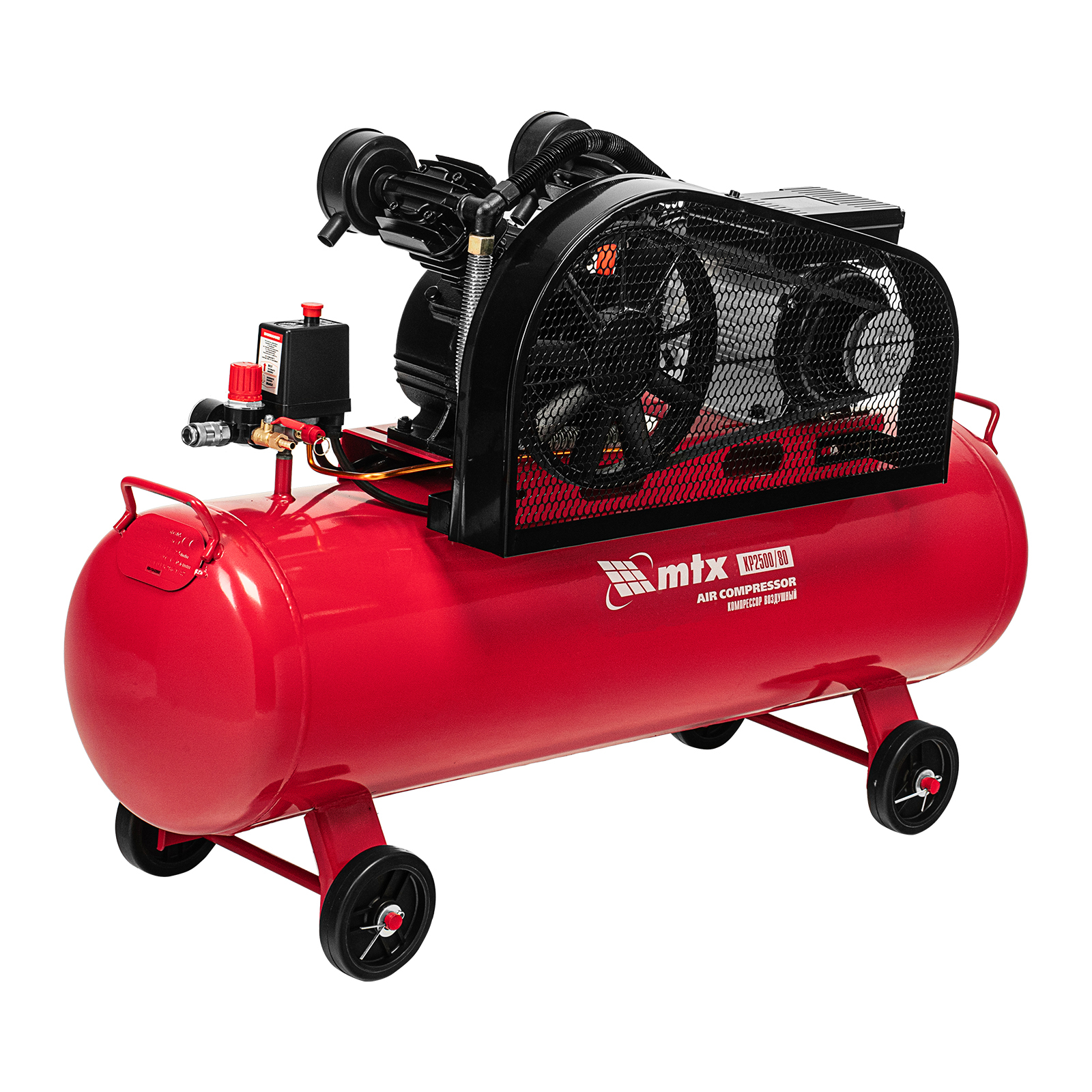 Компрессор воздушный МТХ КР2500/80 58022 с ременным приводом от электродвигателя, мощностью 2,5 кВт и производительностью 420 л/мин, с ресивером объемом 80 литров, применяется для подачи сжатого атмосферного воздуха к пневматическому инструменту. К нему можно подключить гайковерт, дрель, углошлифовальную машину, степлер, краскопульт, продувочный пистолет или другой пневмоинструмент. Для подключения предусмотрены 2 штуцера: быстросъемный и «елочка». Компрессор подходит для профессионального использования на предприятии автосервиса, строительной площадке, в мастерской.