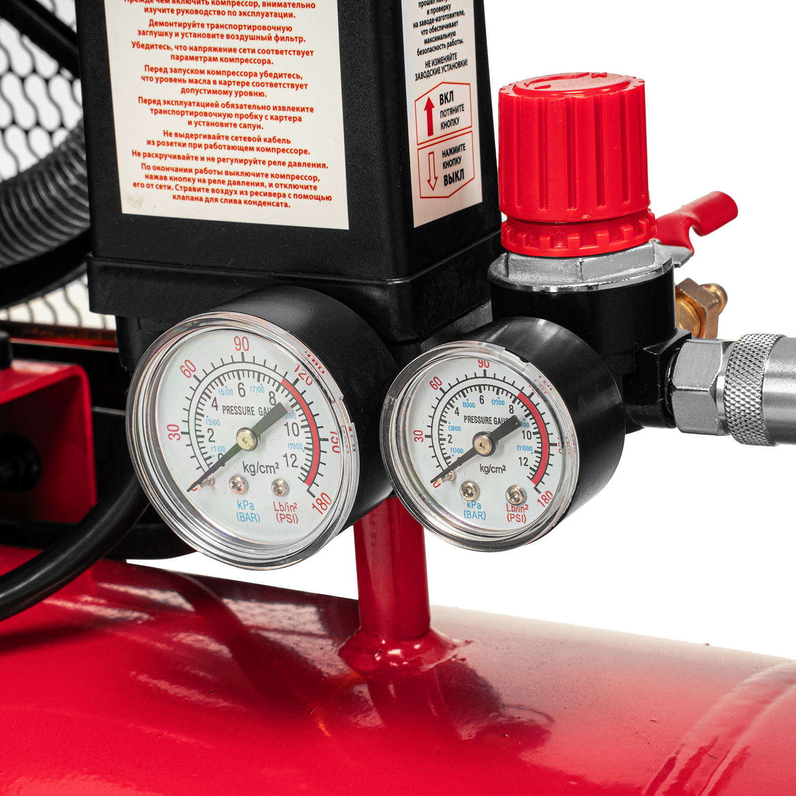 - Автоматическая регулировка производительности — прессостат останавливает двигатель при достижении максимального рабочего давления (8 бар) и запускает его при падении давления ниже минимально допустимого уровня.