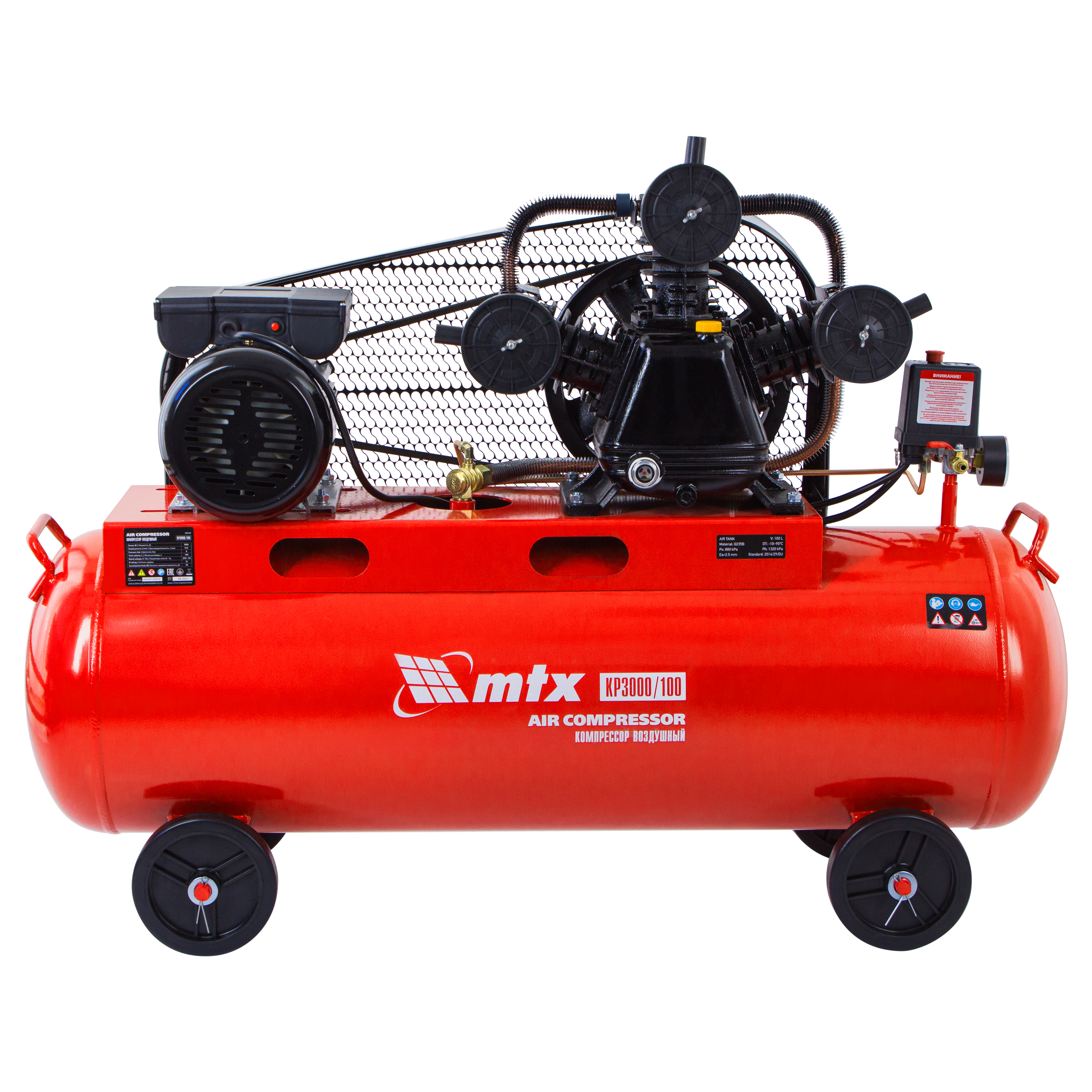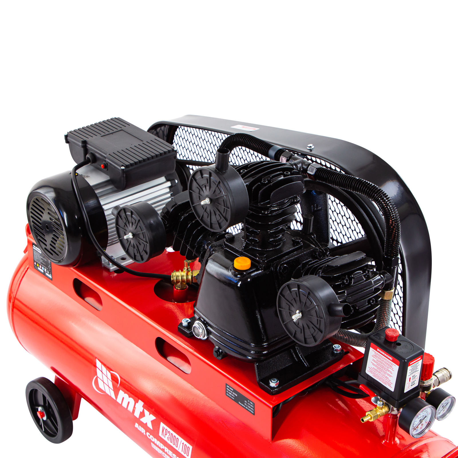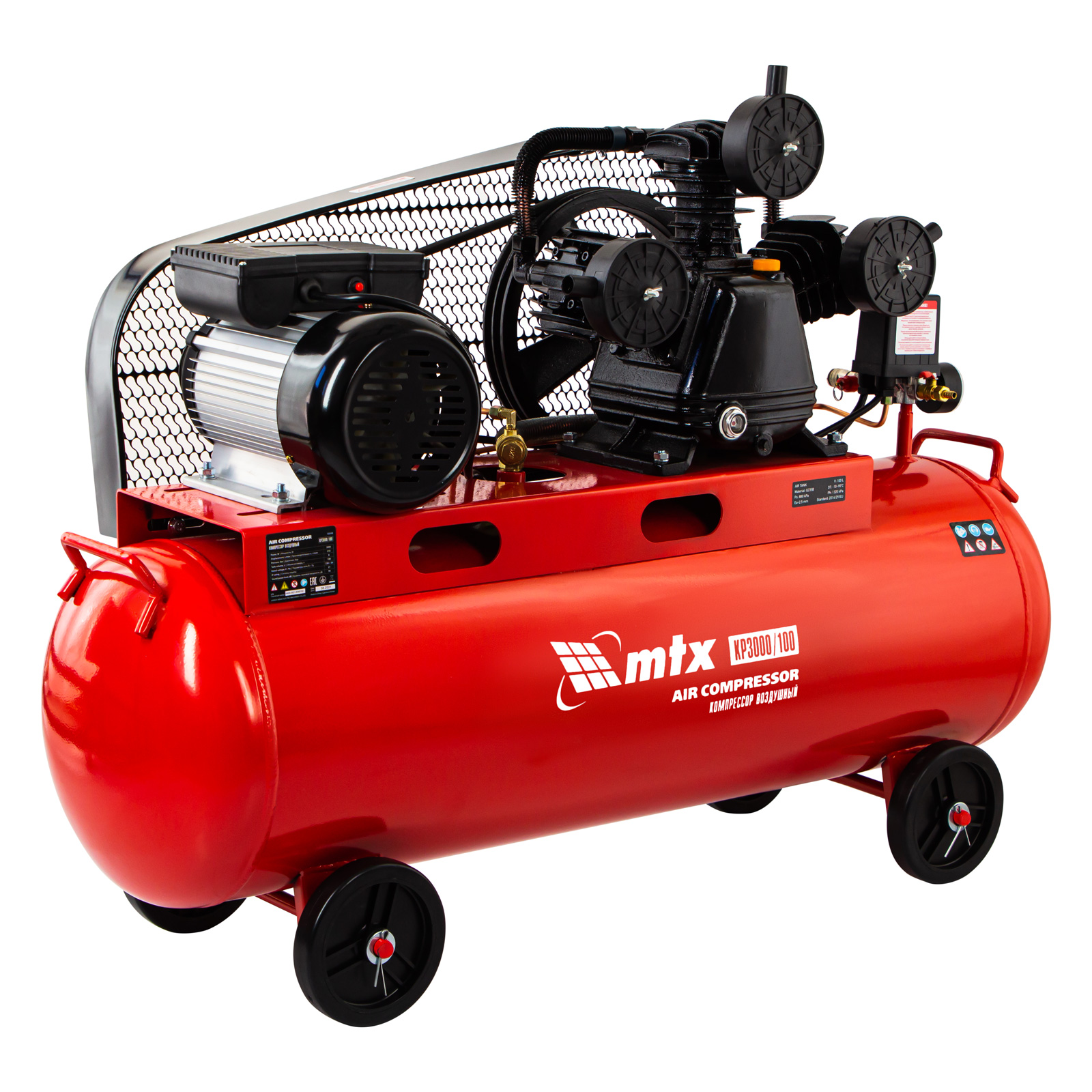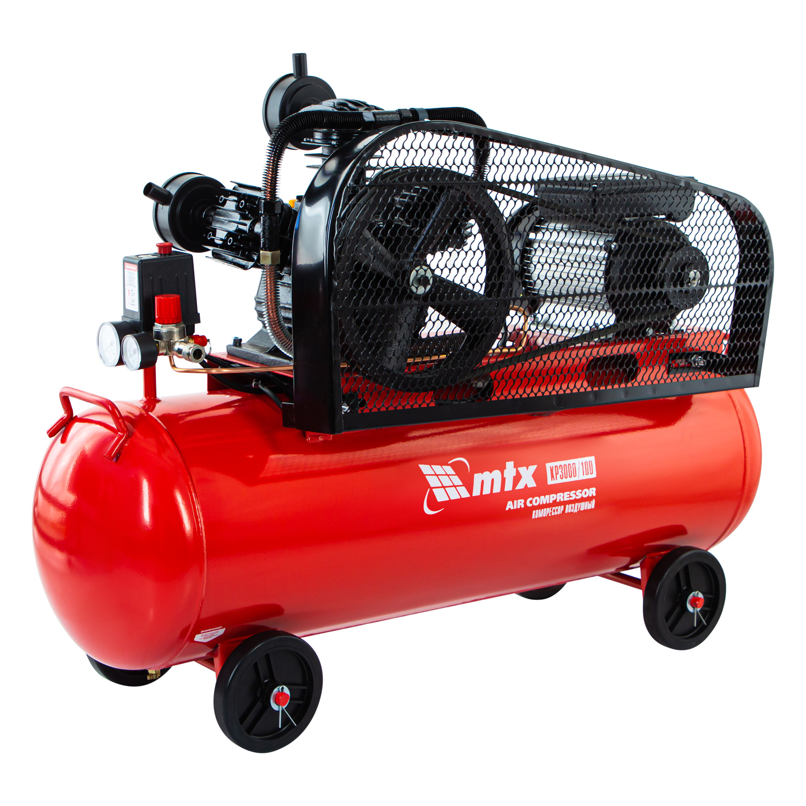 Компрессор воздушный МТХ КР3000/100, 58048, с ременным приводом от электродвигателя, мощностью 3,0 кВт и производительностью 510 л/мин, с ресивером объемом 100 литров, применяется для подачи сжатого атмосферного воздуха в пневматические инструменты. К нему можно подключать гайковерт, дрель, степлер, краскопульт, продувочный пистолет и т.п.
