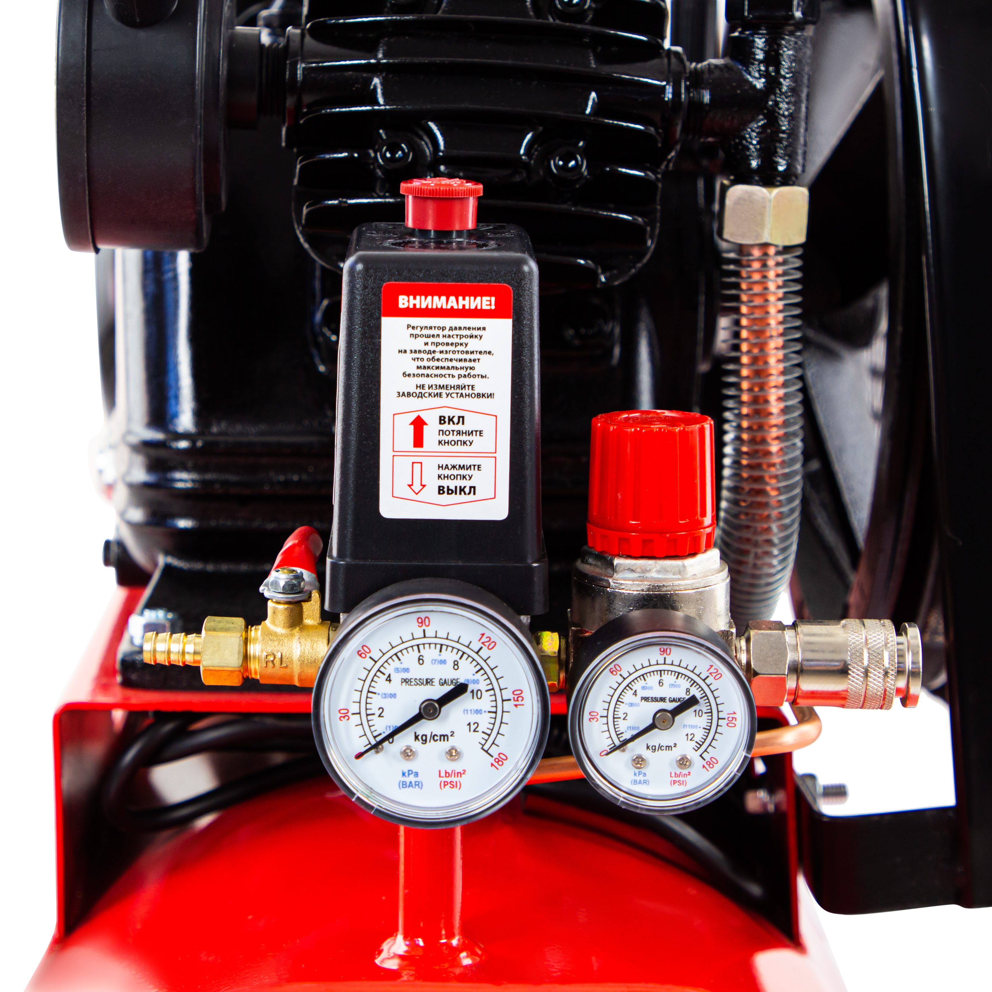 - Защитный клапан — превышение максимально допустимого давления в ресивере исключено.