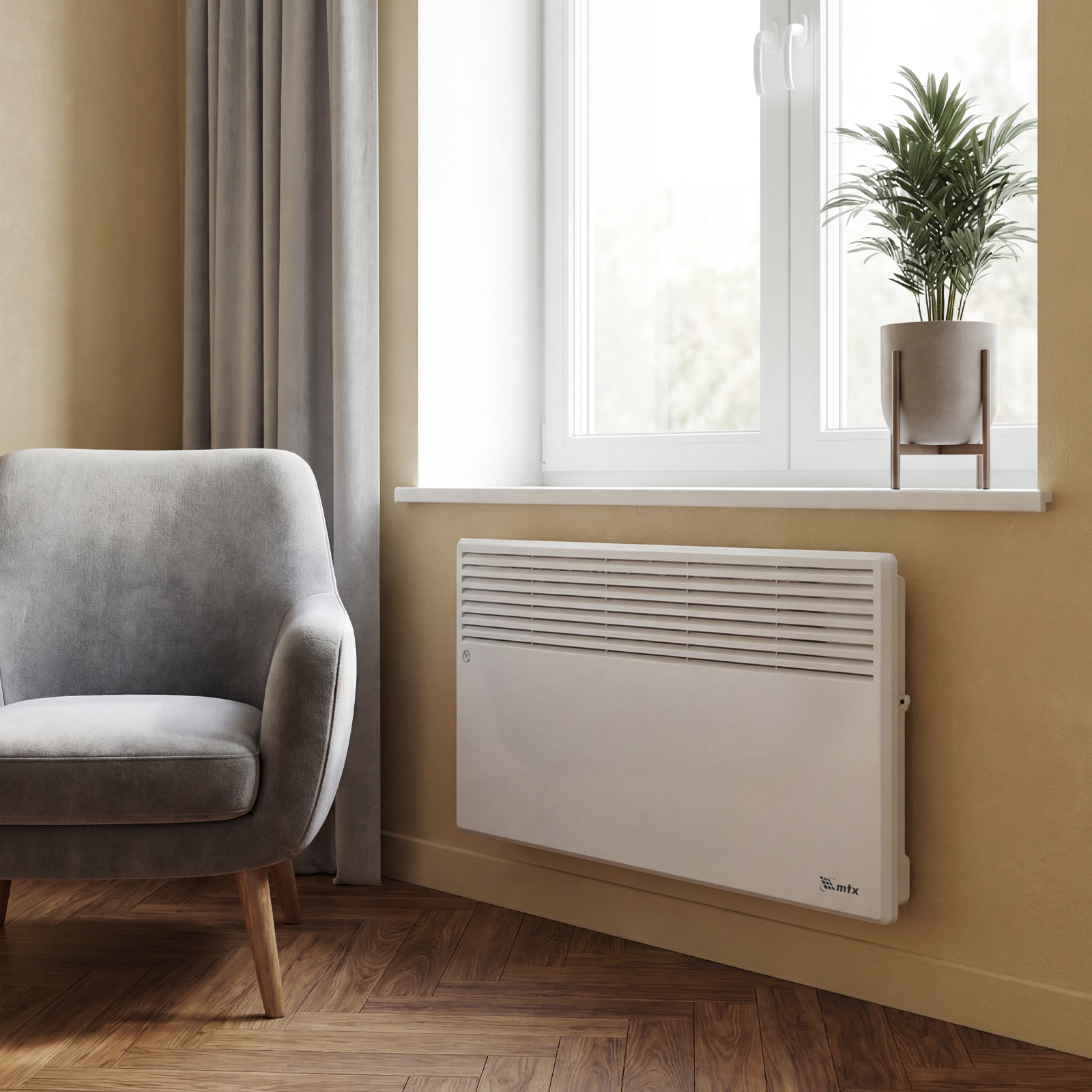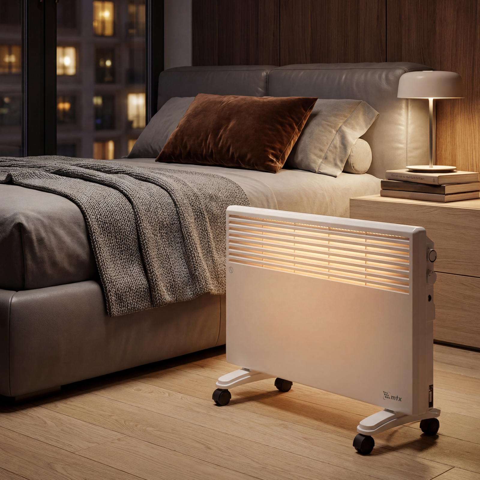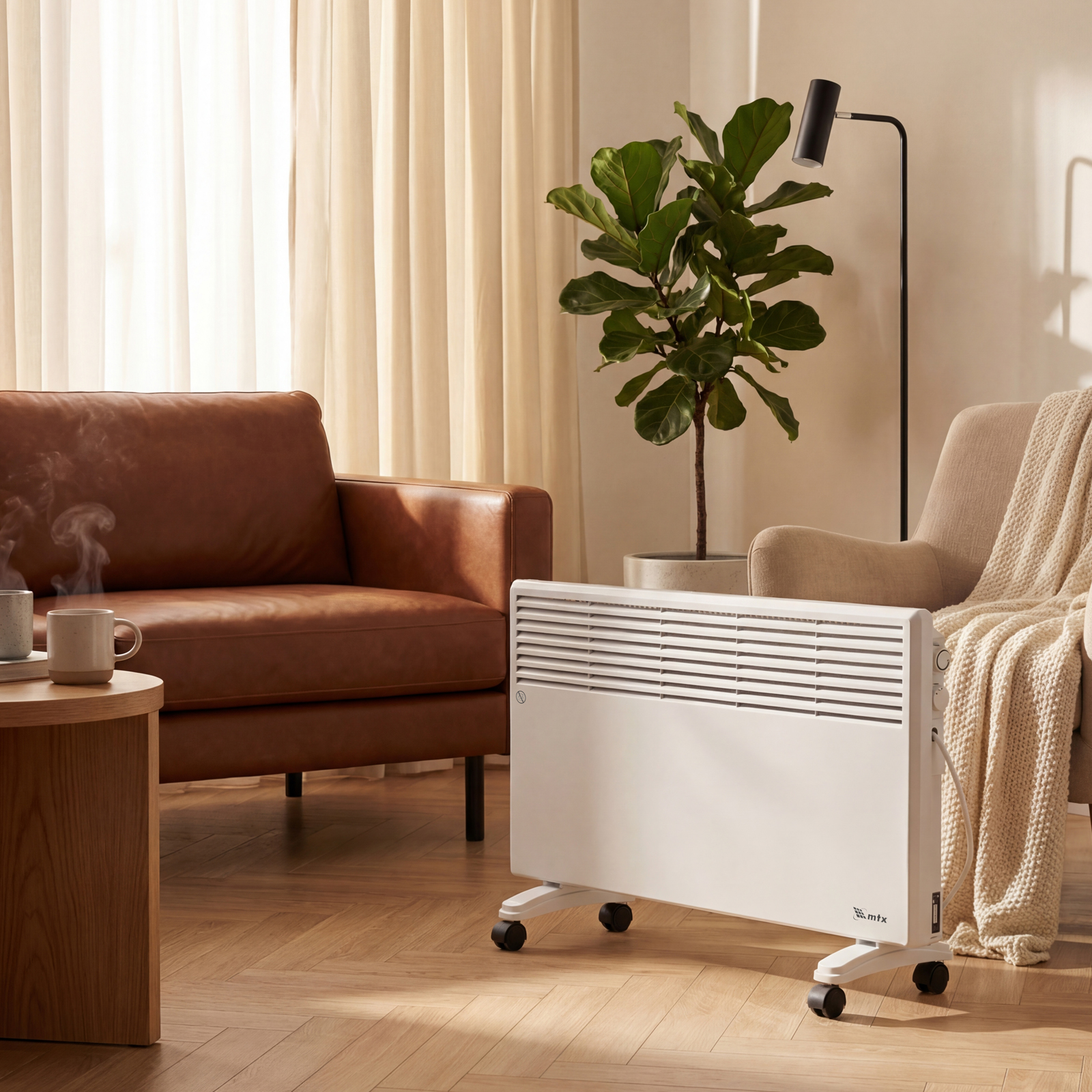 Электрический конвектор MTX CH-2000 98107 максимальной мощностью 2000 Вт, с X-образным нагревателем, термостатом и колесами, — источник тепла для жилых, офисных и хозяйственных помещений. X-образный нагревательный элемент позволяет быстро и равномерно нагреть помещение до нужной температуры. Площадь обогрева составляет 25 м2.