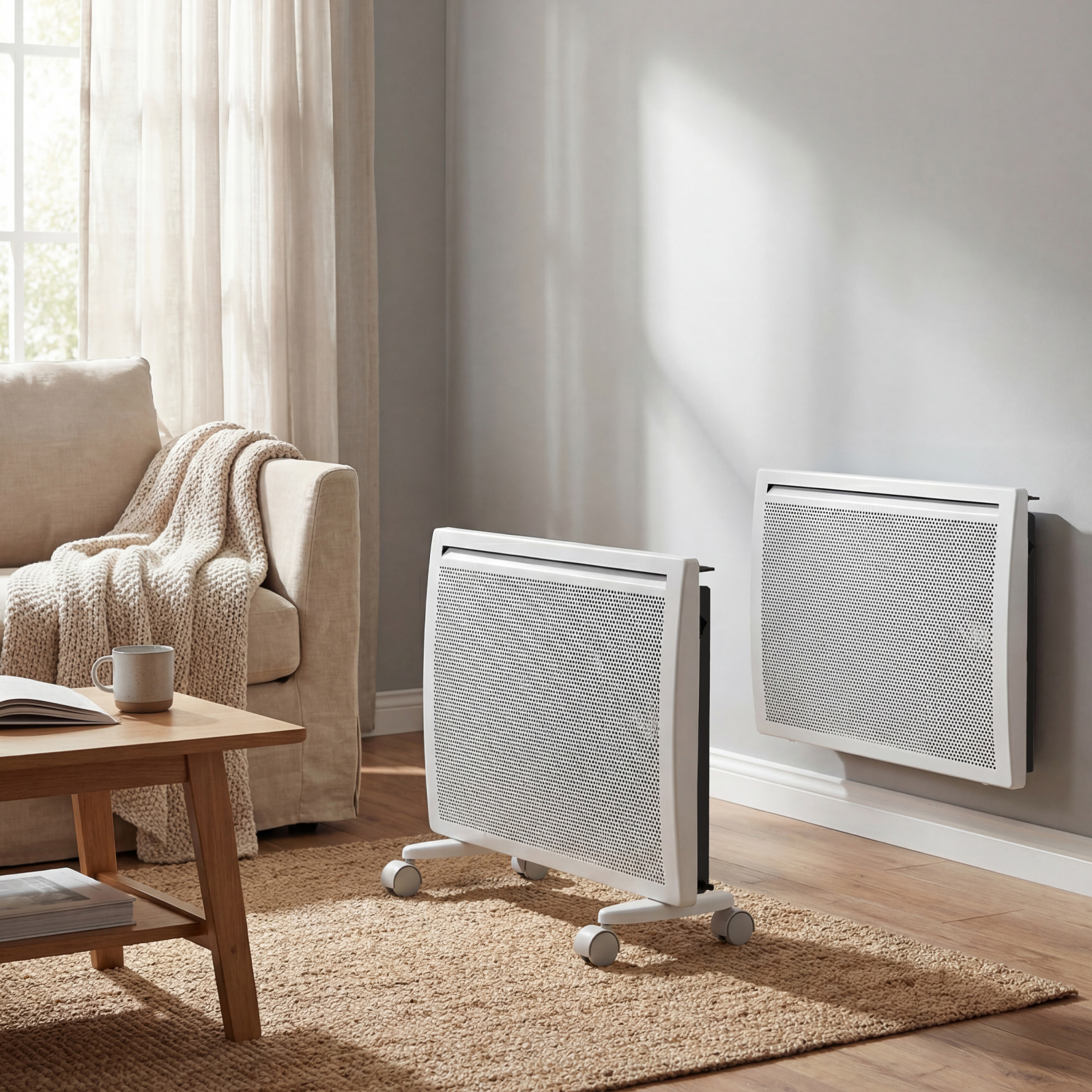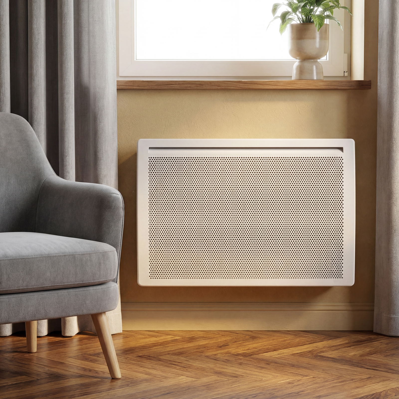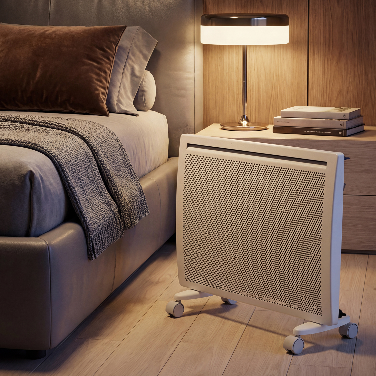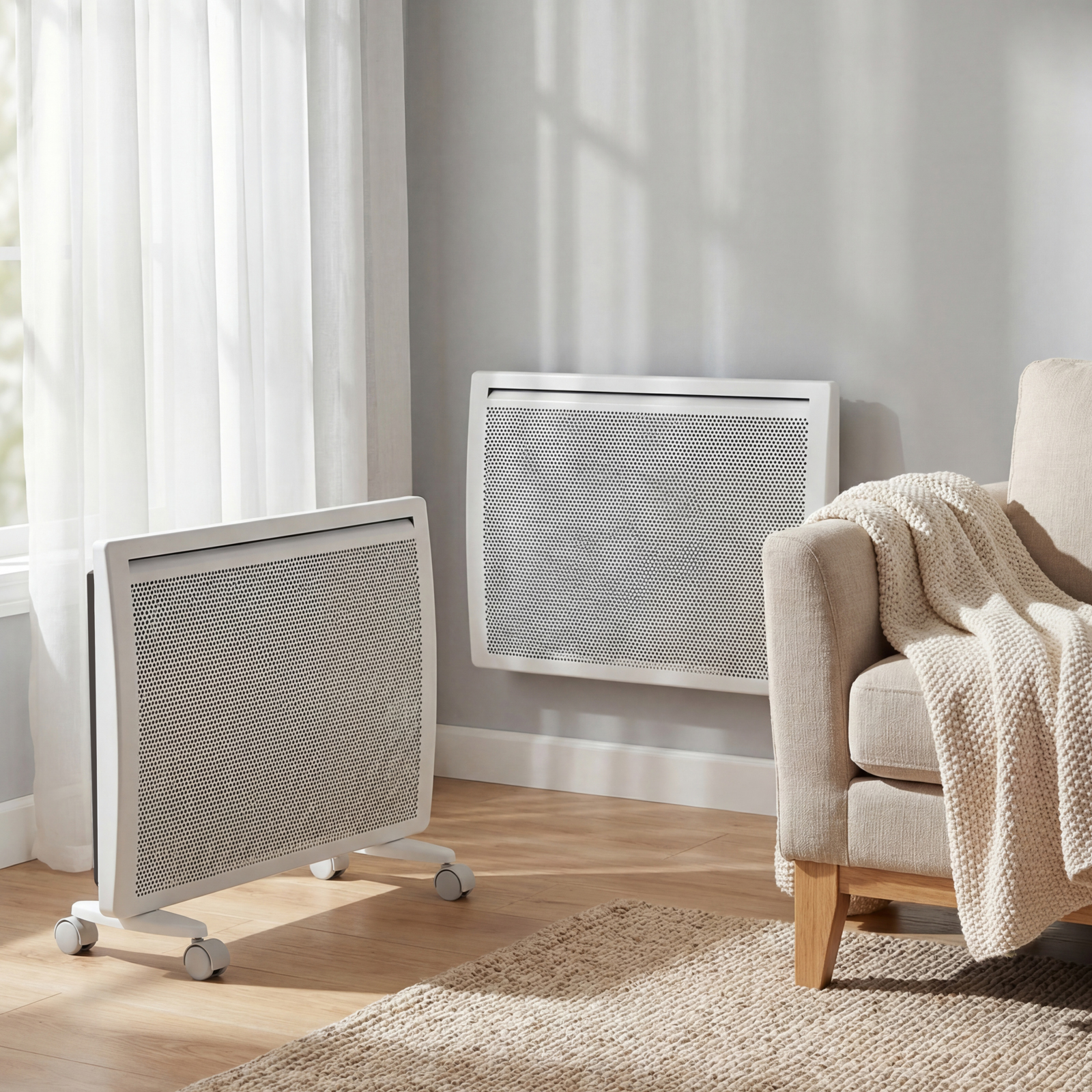 - Высокая энергоэффективность — гибридный нагревательный элемент излучает инфракрасное тепло и одновременно обеспечивает конвекцию воздуха, что позволяет прогревать помещение заметно быстрее при тех же затратах энергии.