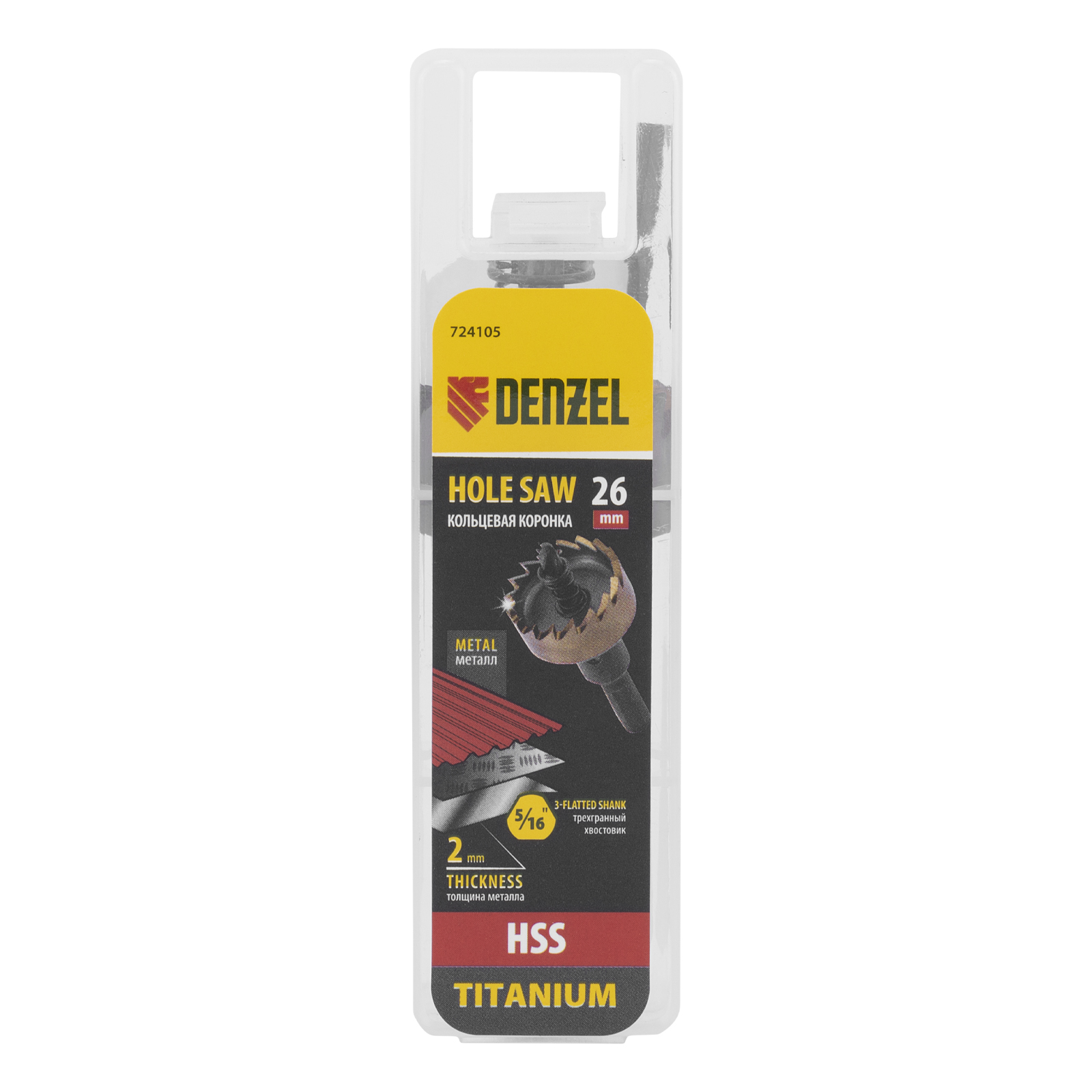 <p>Коронка Denzel 724105 диаметром 26 мм, из стали HSS, с нитридтитановым покрытием, применяется для сверления отверстий в черных, цветных металлах, пластике и других материалах. Рассчитана на профессиональное использование на строительной площадке. Коронка пригодится при прокладке коммуникаций, монтаже оборудования, крепежных элементов и различных конструкций.</p><h2>Преимущества</h2><ul><li>Прочность — корпус и рабочая часть являются монолитной конструкцией из высококачественной стали.</li><li>Высокая эффективность — центрирующее сверло из быстрорежущей стали облегчает засверливание.</li><li>Коррозионная стойкость — корпус и рабочая часть имеют защитное нитридтитановое покрытие.</li><li>Эффективное удаление продуктов сверления — специальная пружина препятствует застреванию шлама.</li><li>Трехгранный хвостовик — коронка не прокручивается в патроне перфоратора во время работы.</li></ul>