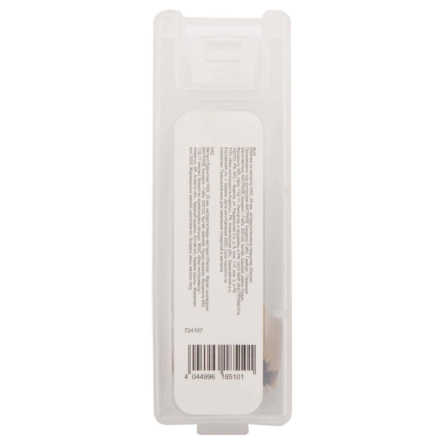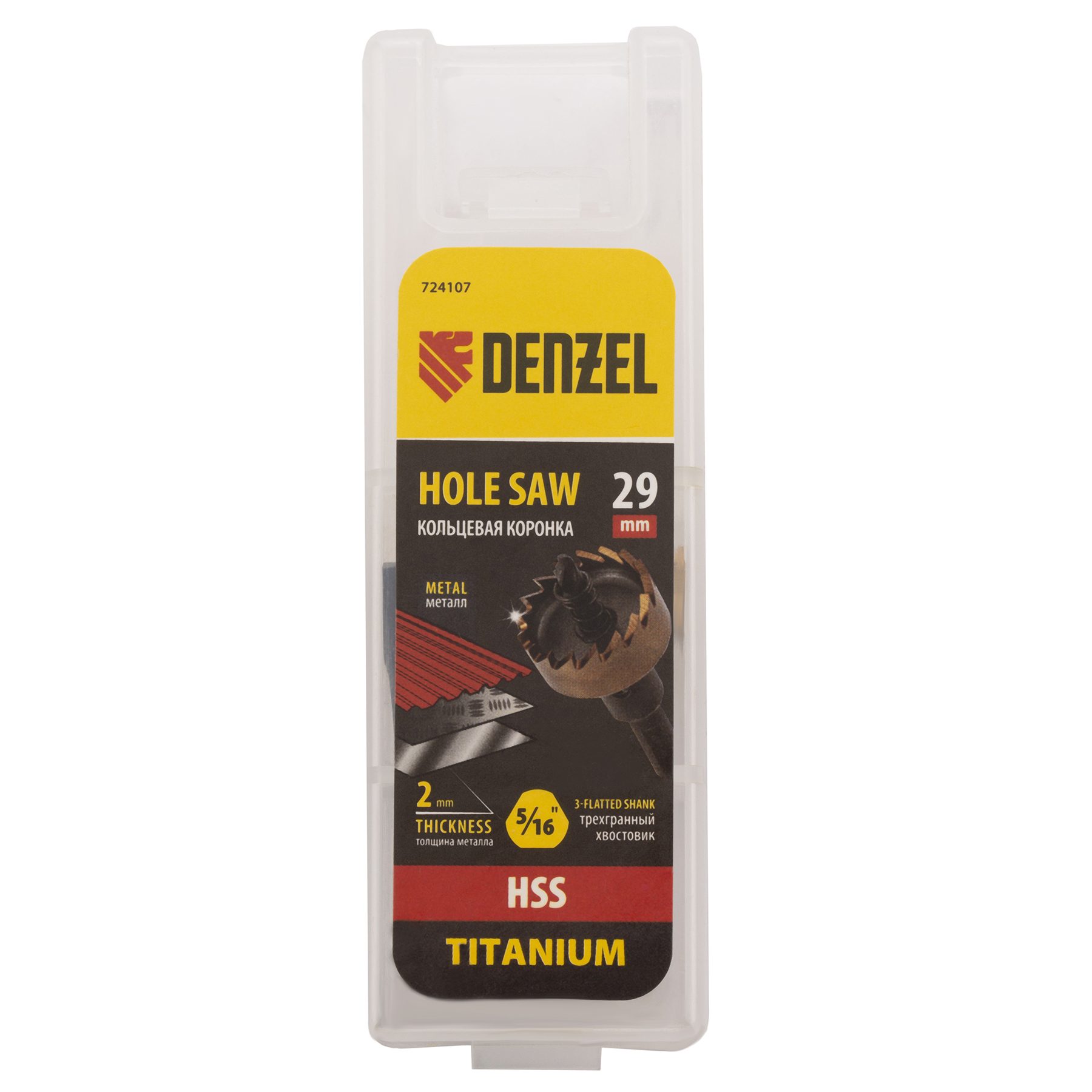 <p>Коронка Denzel 724107 диаметром 29 мм, из стали HSS, с нитридтитановым покрытием, применяется для сверления отверстий в черных, цветных металлах, пластике и других материалах. Рассчитана на профессиональное использование на строительной площадке. Коронка пригодится при прокладке коммуникаций, монтаже оборудования, крепежных элементов и различных конструкций.</p><h2>Преимущества</h2><ul><li>Прочность — корпус и рабочая часть являются монолитной конструкцией из высококачественной стали.</li><li>Высокая эффективность — центрирующее сверло из быстрорежущей стали облегчает засверливание.</li><li>Коррозионная стойкость — корпус и рабочая часть имеют защитное нитридтитановое покрытие.</li><li>Эффективное удаление продуктов сверления — специальная пружина препятствует застреванию шлама.</li><li>Трехгранный хвостовик — коронка не прокручивается в патроне перфоратора во время работы.</li></ul>