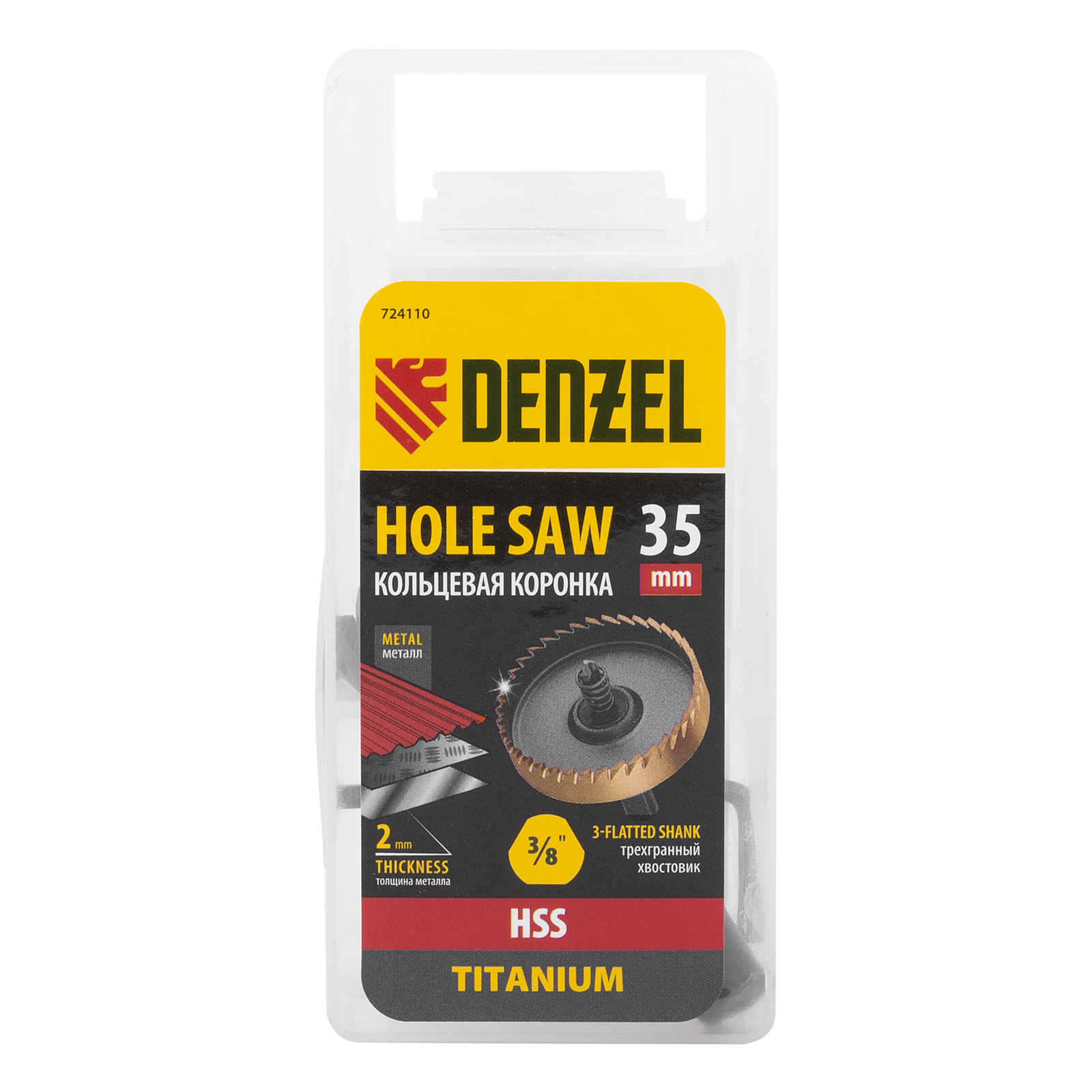 <p>Коронка Denzel 724110 диаметром 35 мм, из стали HSS, с нитридтитановым покрытием, применяется для сверления отверстий в черных, цветных металлах, пластике и других материалах. Рассчитана на профессиональное использование на строительной площадке. Коронка пригодится при прокладке коммуникаций, монтаже оборудования, крепежных элементов и различных конструкций.</p><h2>Преимущества</h2><ul><li>Прочность — корпус и рабочая часть являются монолитной конструкцией из высококачественной стали.</li><li>Высокая эффективность — центрирующее сверло из быстрорежущей стали облегчает засверливание.</li><li>Коррозионная стойкость — корпус и рабочая часть имеют защитное нитридтитановое покрытие.</li><li>Эффективное удаление продуктов сверления — специальная пружина препятствует застреванию шлама.</li><li>Трехгранный хвостовик — коронка не прокручивается в патроне перфоратора во время работы.</li></ul>
