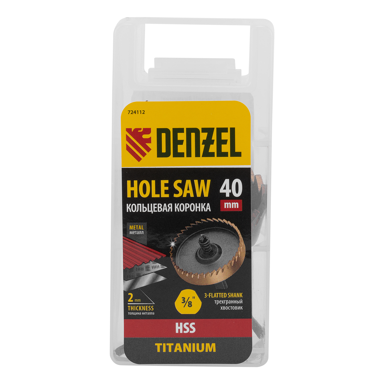 <p>Коронка Denzel 724112 диаметром 40 мм, из стали HSS, с нитридтитановым покрытием, применяется для сверления отверстий в черных, цветных металлах, пластике и других материалах. Рассчитана на профессиональное использование на строительной площадке. Коронка пригодится при прокладке коммуникаций, монтаже оборудования, крепежных элементов и различных конструкций.</p><h2>Преимущества</h2><ul><li>Прочность — корпус и рабочая часть являются монолитной конструкцией из высококачественной стали.</li><li>Высокая эффективность — центрирующее сверло из быстрорежущей стали облегчает засверливание.</li><li>Коррозионная стойкость — корпус и рабочая часть имеют защитное нитридтитановое покрытие.</li><li>Эффективное удаление продуктов сверления — специальная пружина препятствует застреванию шлама.</li><li>Трехгранный хвостовик — коронка не прокручивается в патроне перфоратора во время работы.</li></ul>