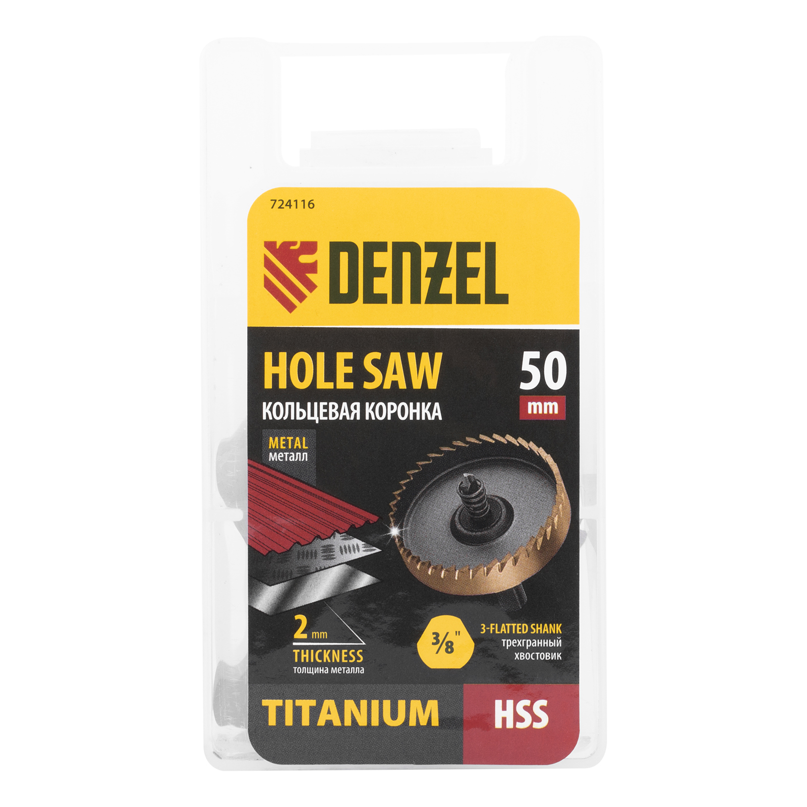<p>Коронка Denzel 724116 диаметром 50 мм, из стали HSS, с нитридтитановым покрытием, применяется для сверления отверстий в черных, цветных металлах, пластике и других материалах. Рассчитана на профессиональное использование на строительной площадке. Коронка пригодится при прокладке коммуникаций, монтаже оборудования, крепежных элементов и различных конструкций.</p><h2>Преимущества</h2><ul><li>Прочность — корпус и рабочая часть являются монолитной конструкцией из высококачественной стали.</li><li>Высокая эффективность — центрирующее сверло из быстрорежущей стали облегчает засверливание.</li><li>Коррозионная стойкость — корпус и рабочая часть имеют защитное нитридтитановое покрытие.</li><li>Эффективное удаление продуктов сверления — специальная пружина препятствует застреванию шлама.</li><li>Трехгранный хвостовик — коронка не прокручивается в патроне перфоратора во время работы.</li></ul>