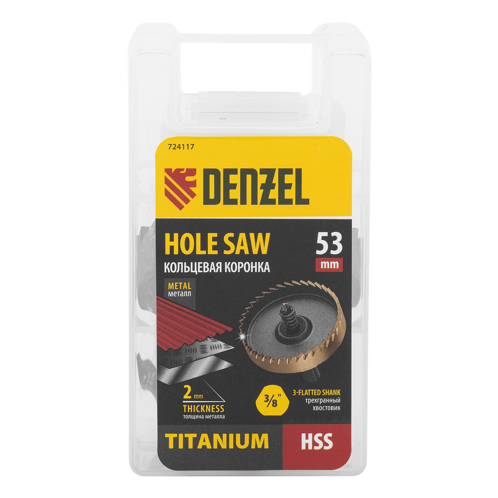 <p>Коронка Denzel 724117 диаметром 53 мм, из стали HSS, с нитридтитановым покрытием, применяется для сверления отверстий в черных, цветных металлах, пластике и других материалах. Рассчитана на профессиональное использование на строительной площадке. Коронка пригодится при прокладке коммуникаций, монтаже оборудования, крепежных элементов и различных конструкций.</p><h2>Преимущества</h2><ul><li>Прочность — корпус и рабочая часть являются монолитной конструкцией из высококачественной стали.</li><li>Высокая эффективность — центрирующее сверло из быстрорежущей стали облегчает засверливание.</li><li>Коррозионная стойкость — корпус и рабочая часть имеют защитное нитридтитановое покрытие.</li><li>Эффективное удаление продуктов сверления — специальная пружина препятствует застреванию шлама.</li><li>Трехгранный хвостовик — коронка не прокручивается в патроне перфоратора во время работы.</li></ul>