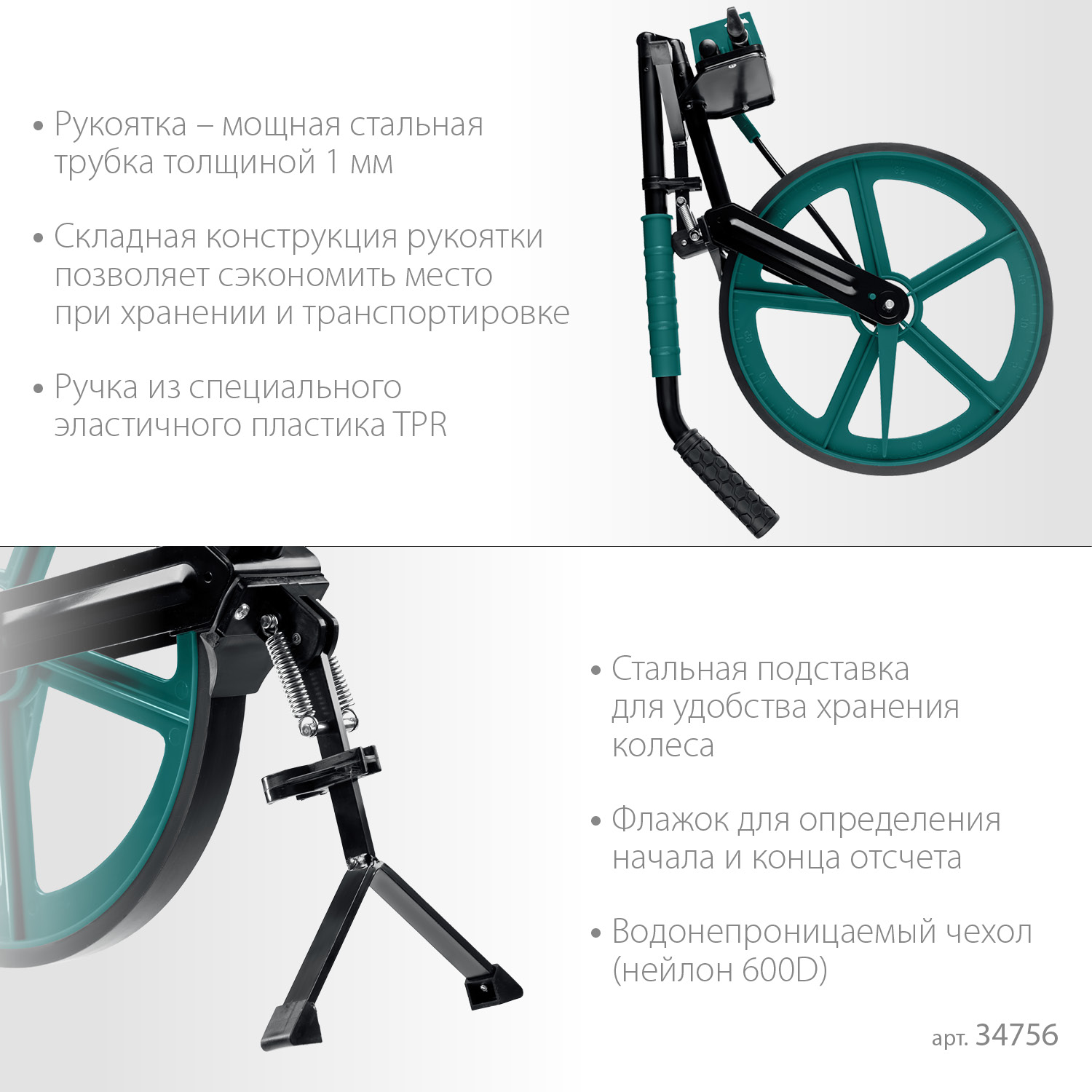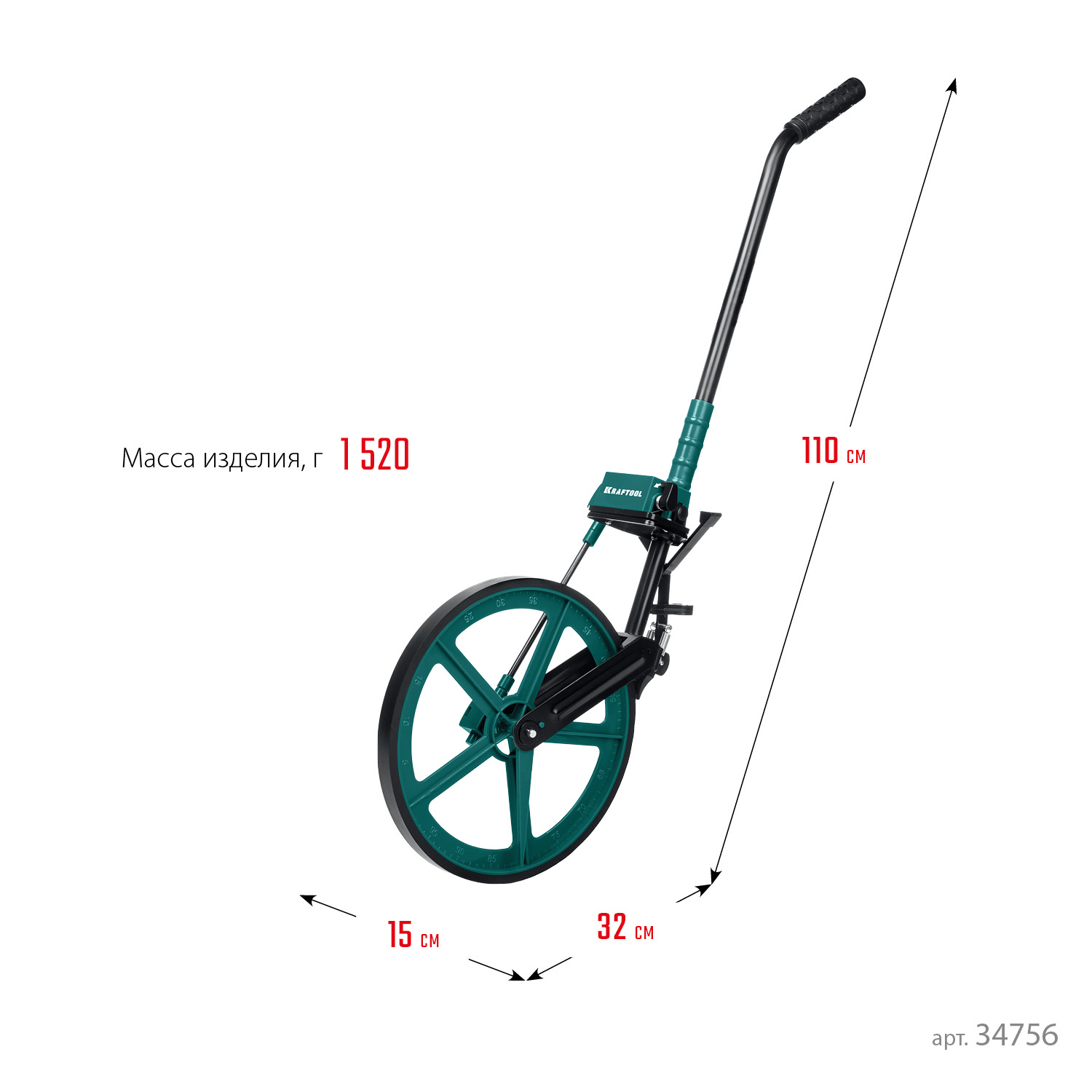 - Колесо из ударопрочного ABS-пластика с износостойким покрытием и нанесенной измерительной шкалой с шагом 1 см