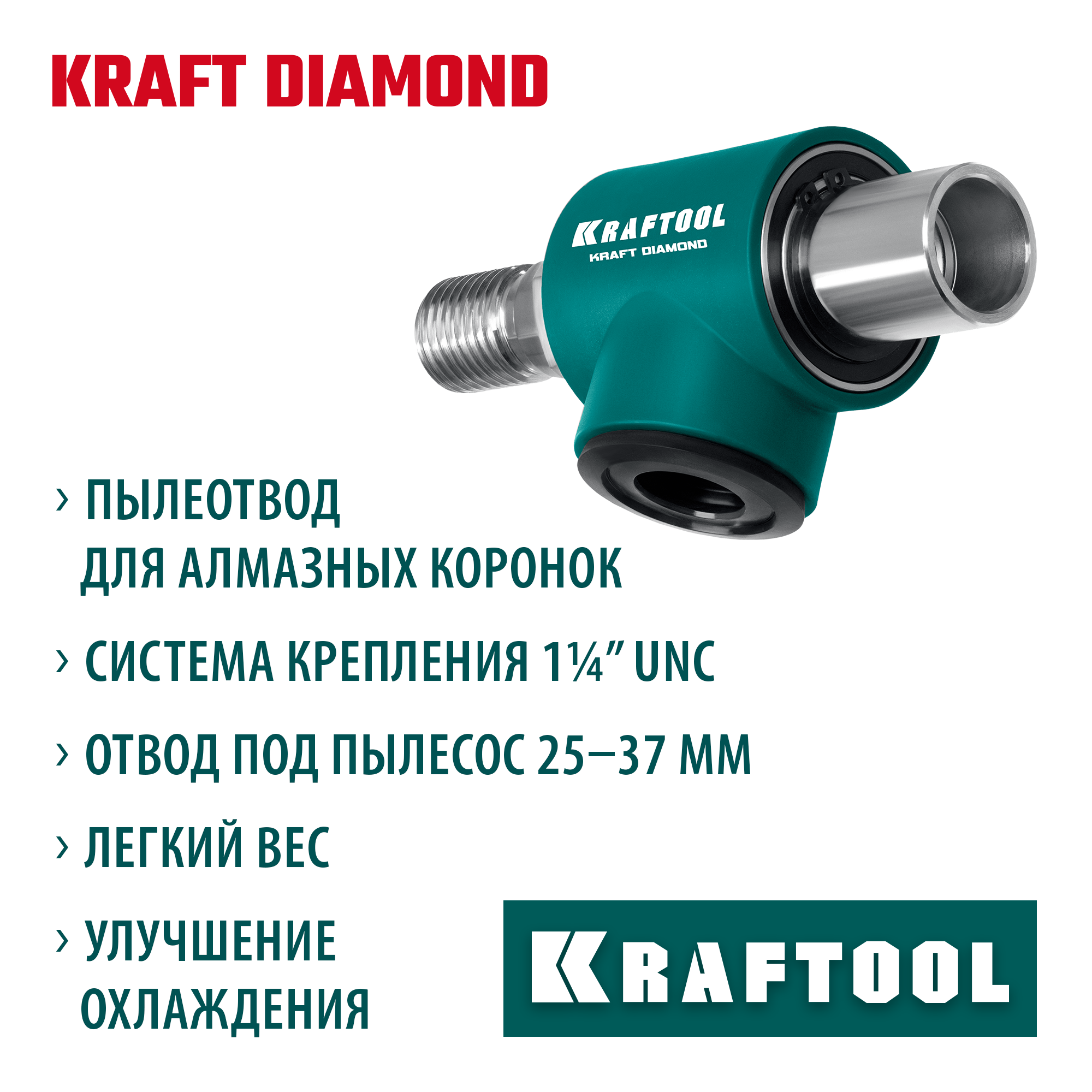 Предназначен для отвода пыли и крупных частиц в процессе сверления алмазными коронками, работает с пылесосами. Для использования с установками и дрелями алмазного бурения с посадкой 1 1/4″ - UNC.