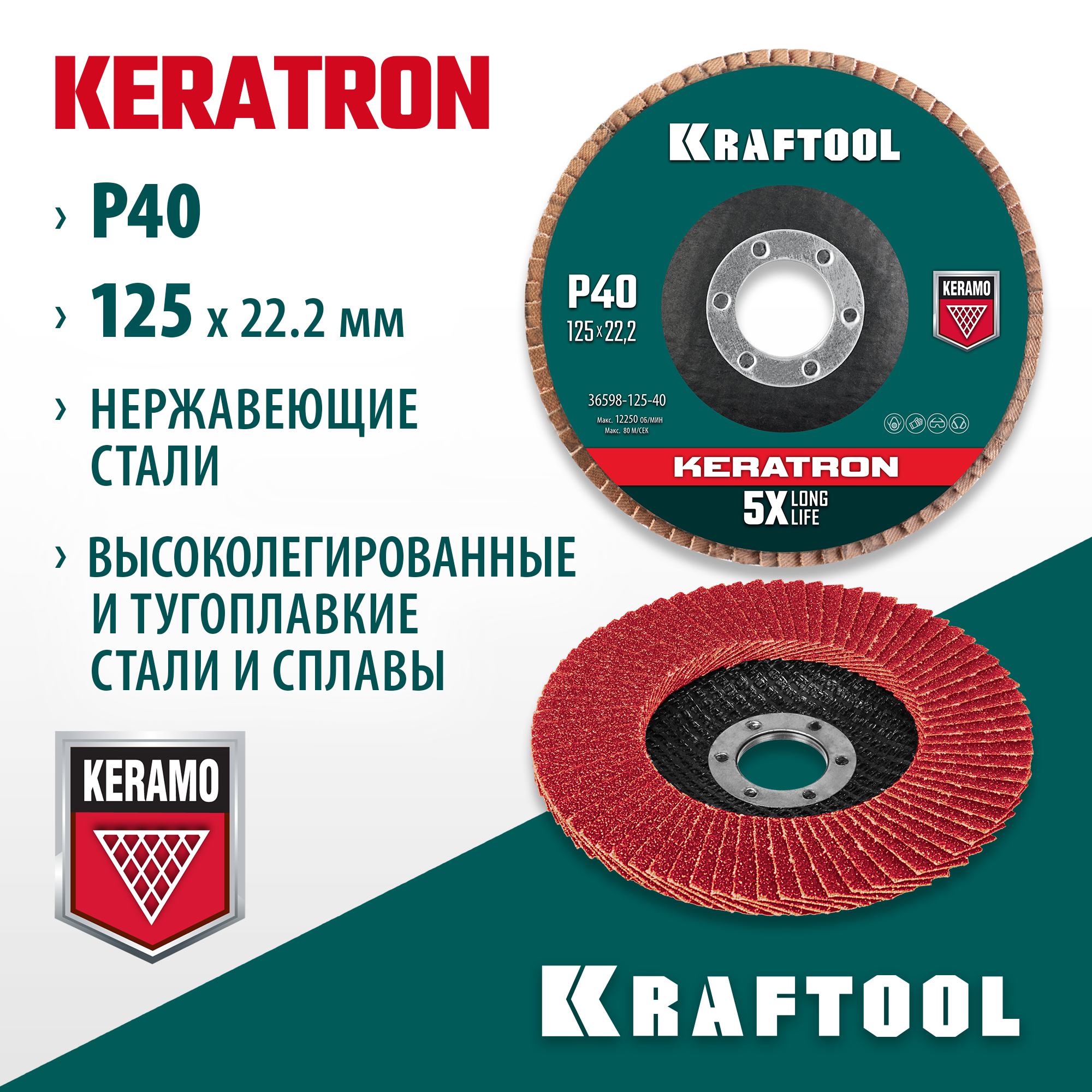 Керамические лепестковые круги KRAFTOOL KERATRON имеют наивысший рабочий ресурс и производительность среди всех типов КЛТ. Их высочайшая эффективность при работе с нержавеющими и высоколегироваными сталями обеспечивает им возможность профессианального применения на промышленных предприятиях, а также специализированных производственных и строительных площадках.