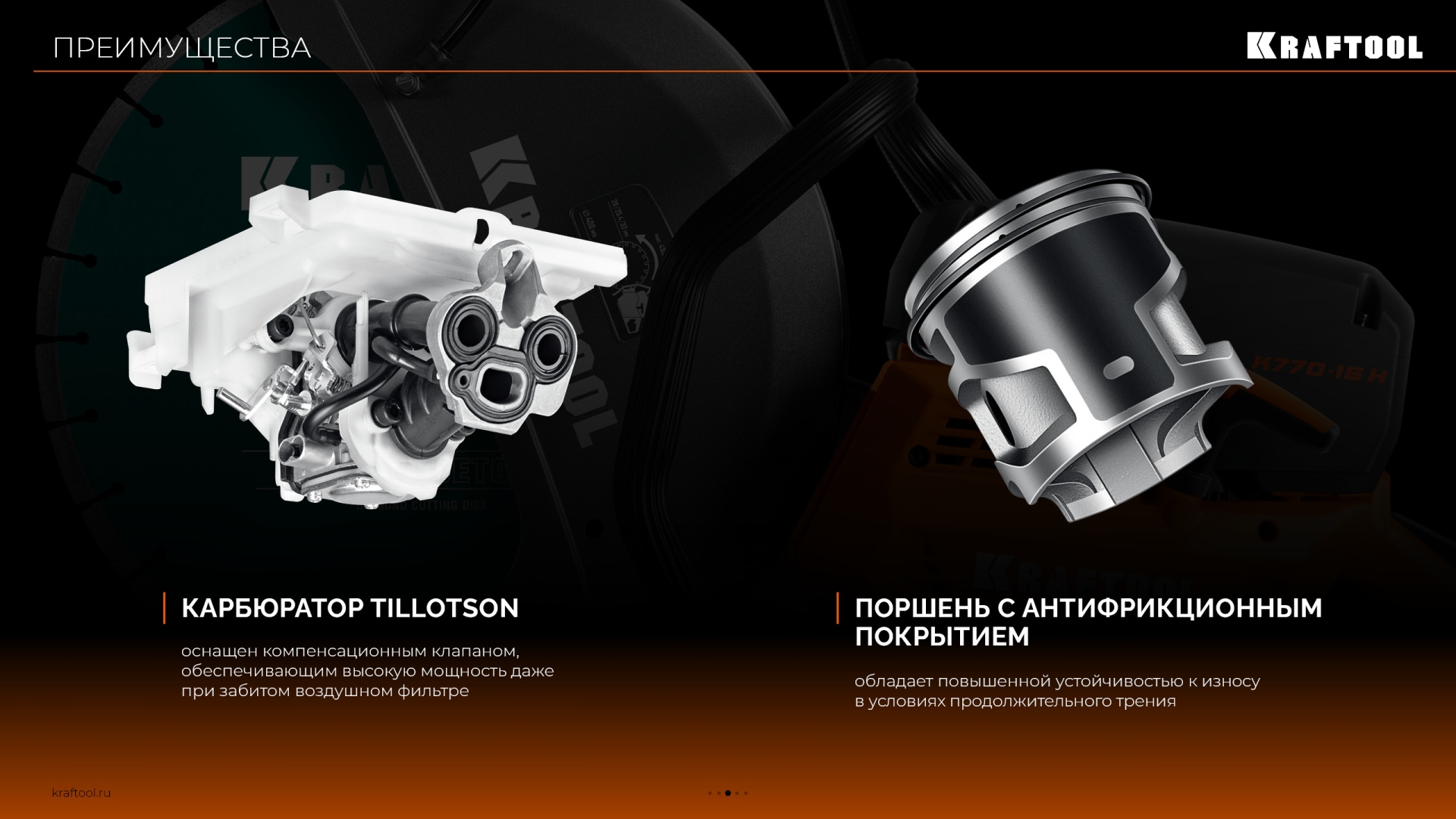 • Карбюратор TILLOTSON оснащен компенсационным клапаном, обеспечивающим высокую мощность даже при забитом воздушном фильтре