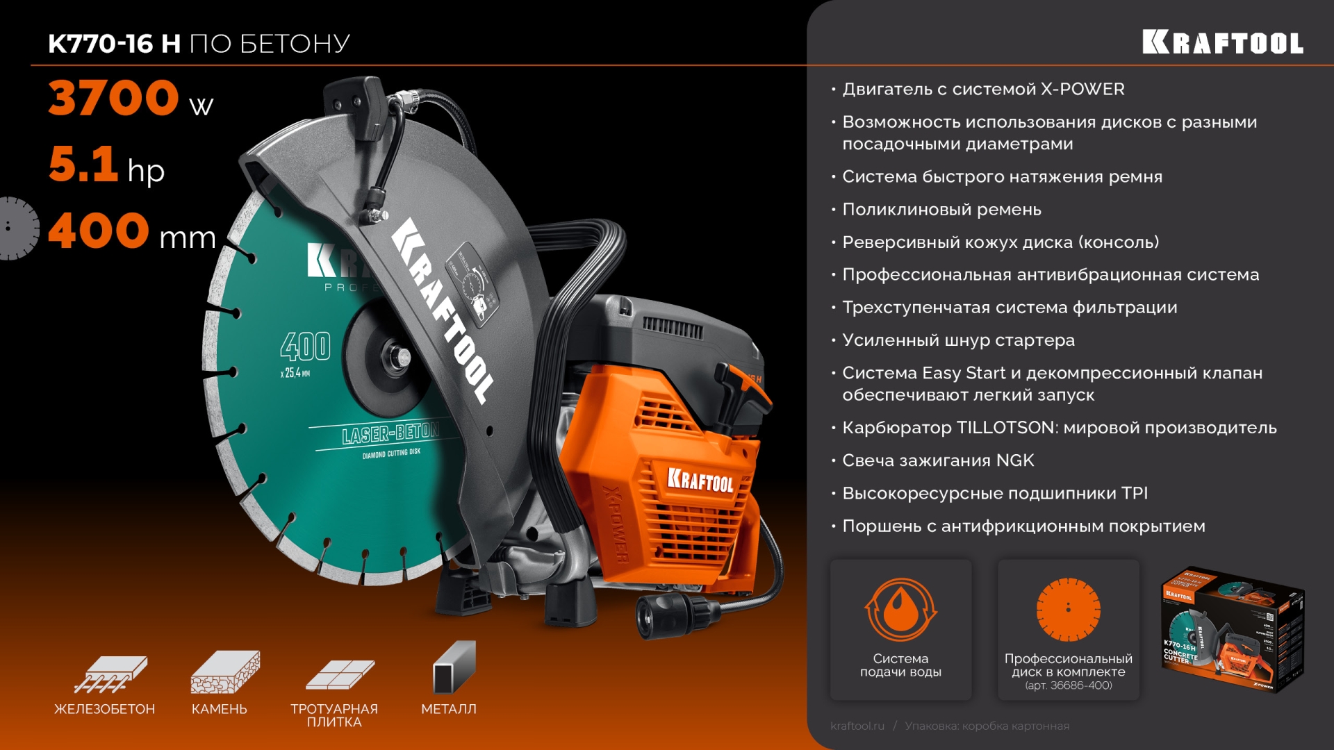 KRAFTOOL 3700 Вт, 400 мм, диск в комплекте, бензорез по бетону (бетонорез) (K770-16 H)