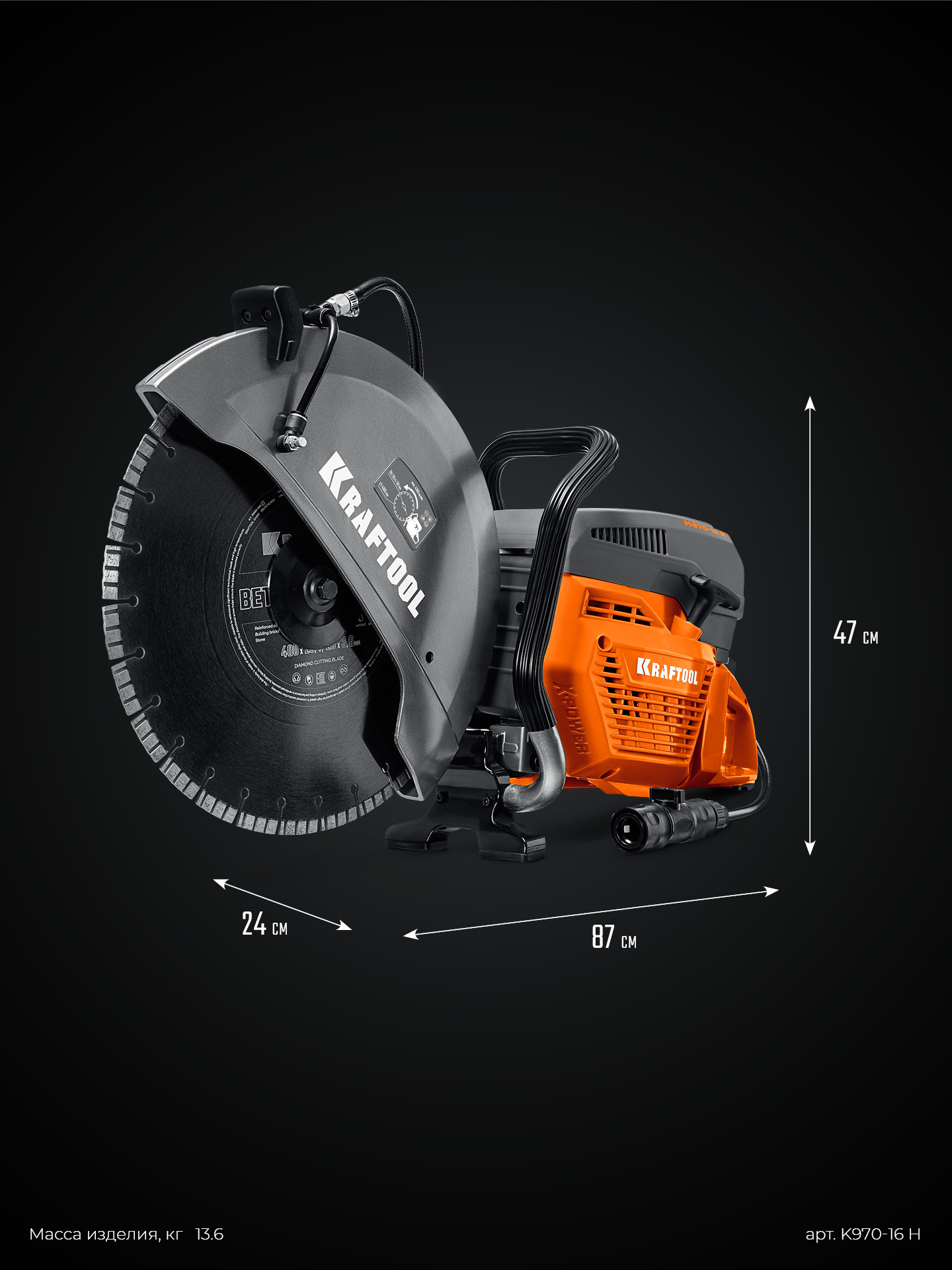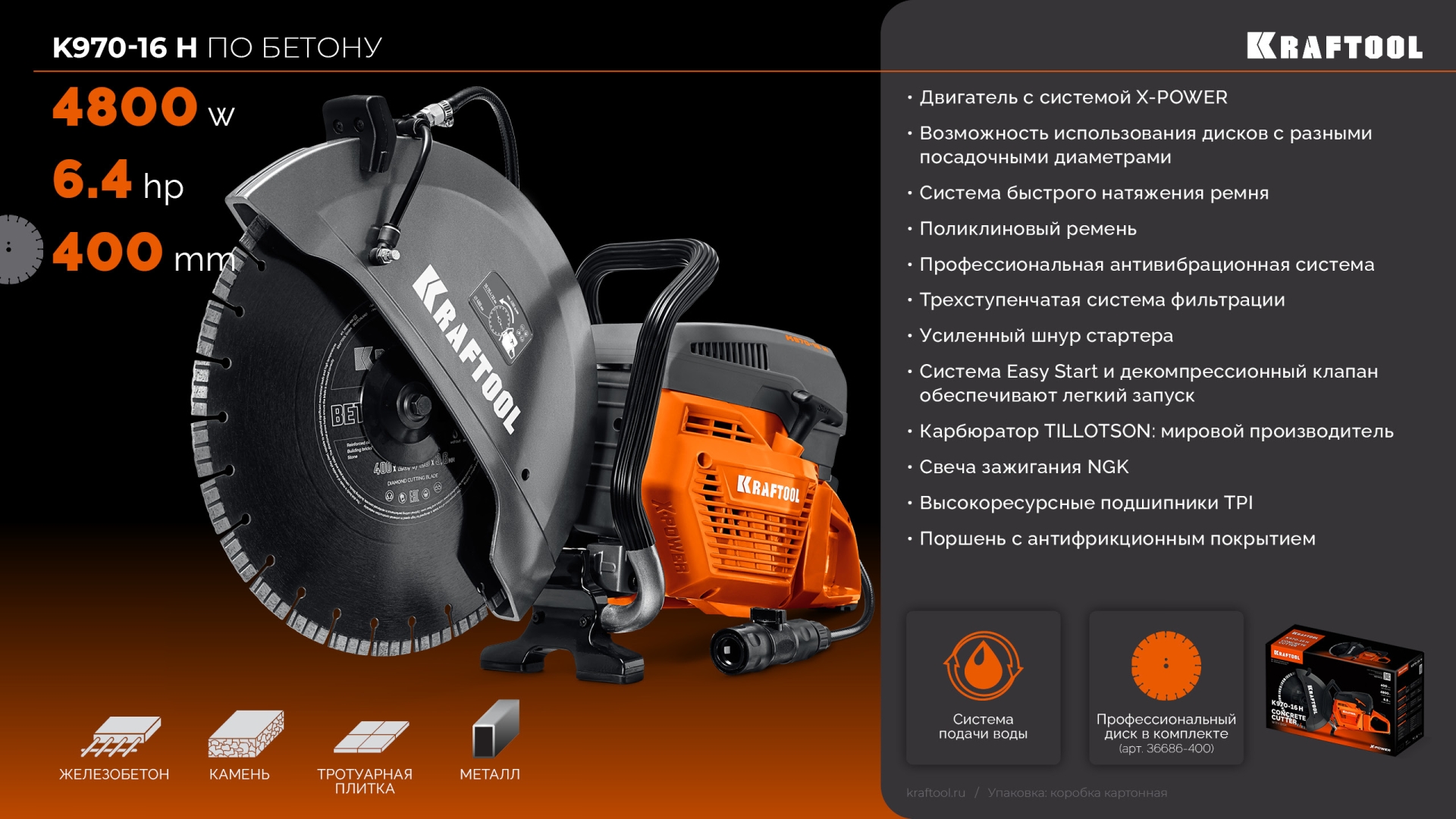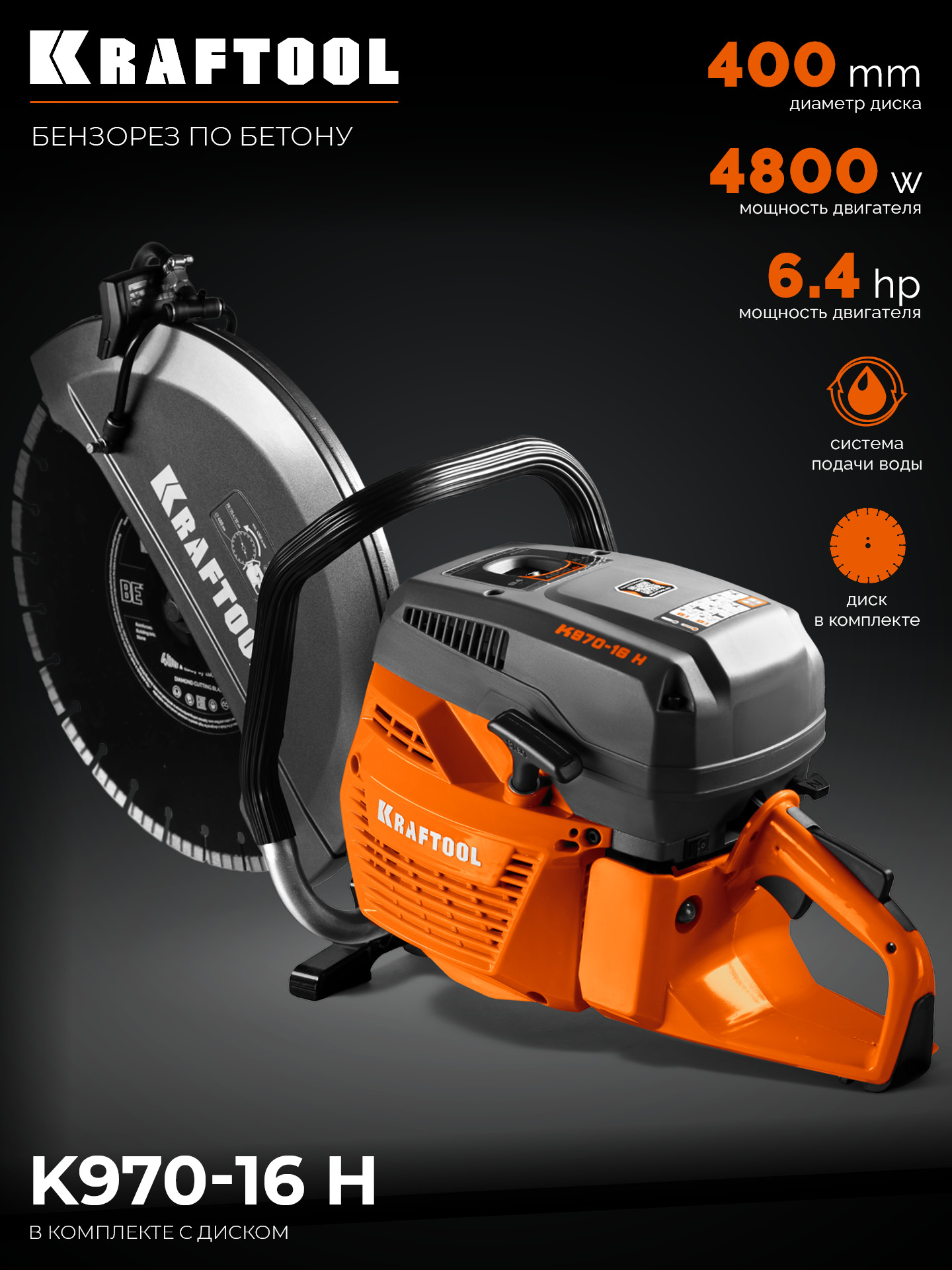 KRAFTOOL 4800 Вт, 400 мм, диск в комплекте, бензорез по бетону (бетонорез) (K970-16 H)