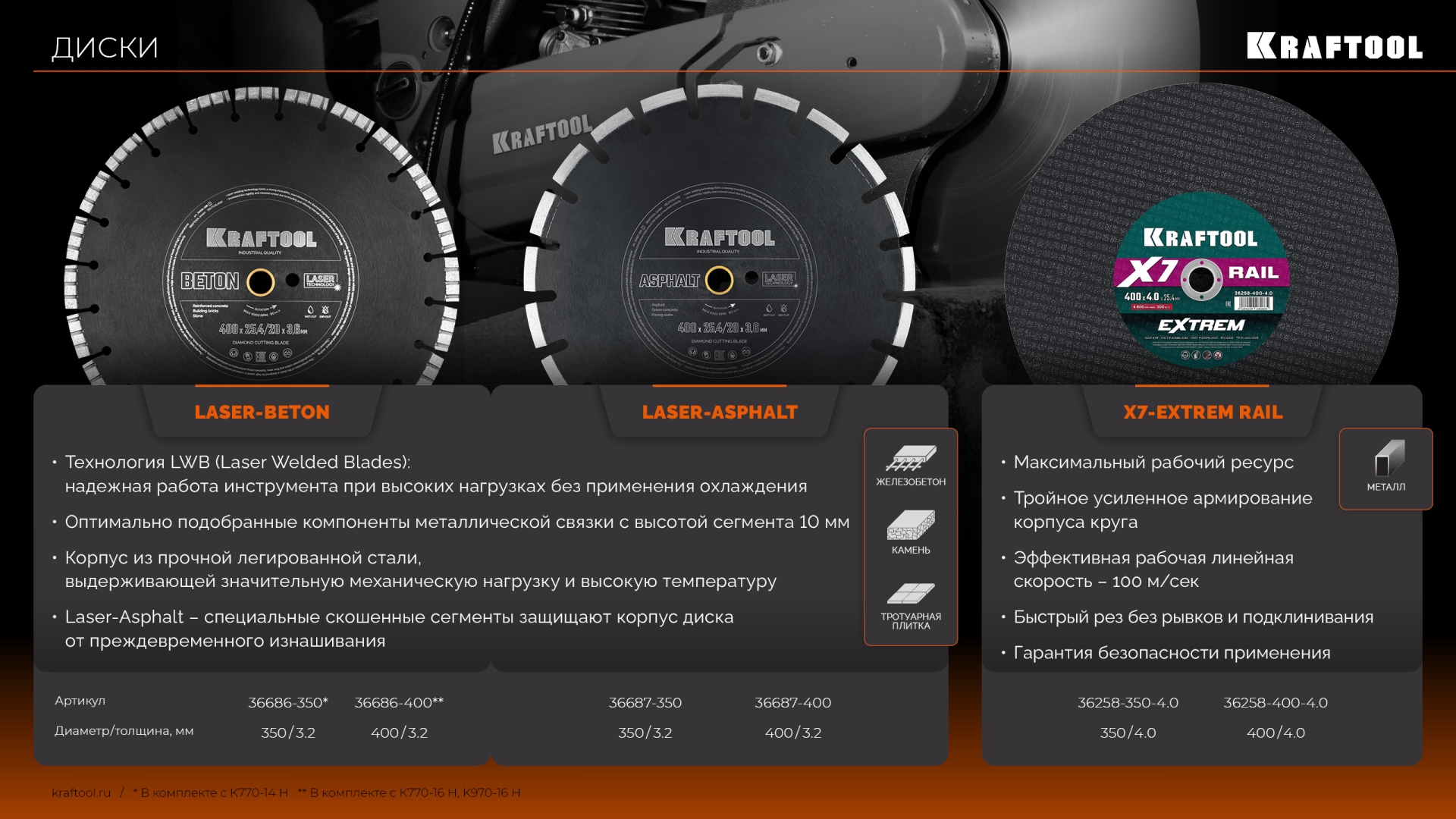 Для сухой и мокрой резки и проделывания спилов, отверстий в литом бетоне, камне, кирпиче, металлических конструкциях, стенах, асфальте и бордюрах.