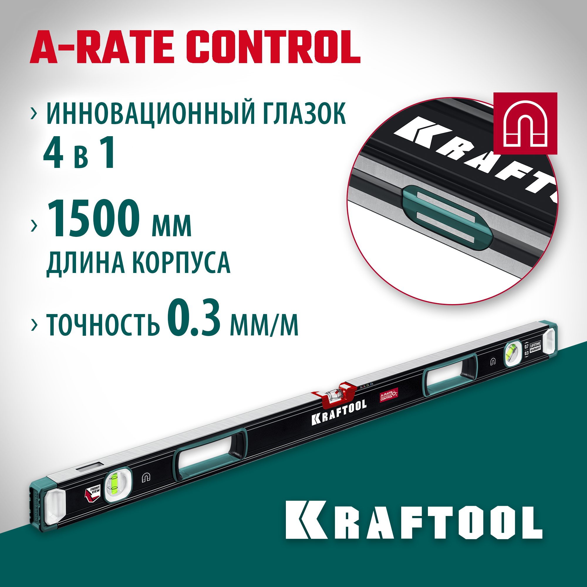 KRAFTOOL A-RATE CONTROL, 1500 мм, точность 0.3 мм/м, с зеркальным глазком, сверхпрочный магнитный уровень (34988-150)