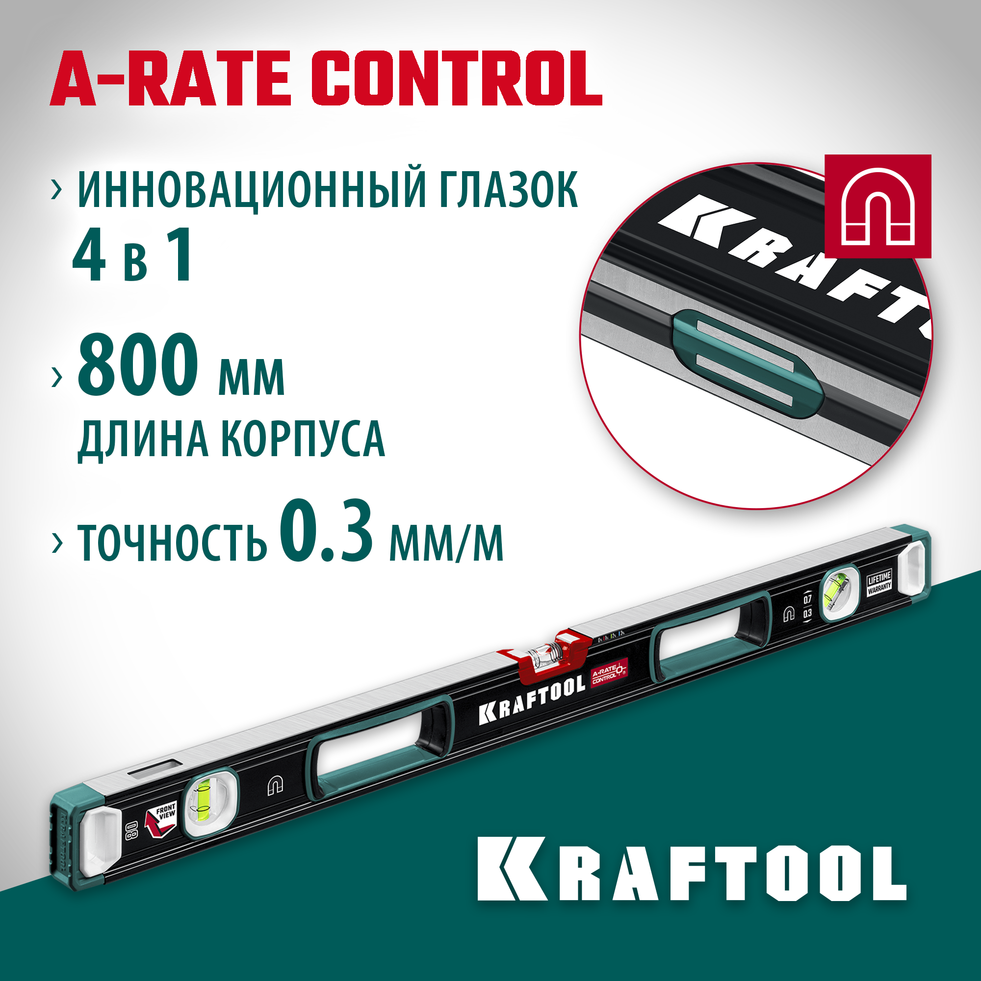 KRAFTOOL A-RATE CONTROL, 800 мм, точность 0.3 мм/м, с зеркальным глазком, сверхпрочный магнитный уровень (34988-80)