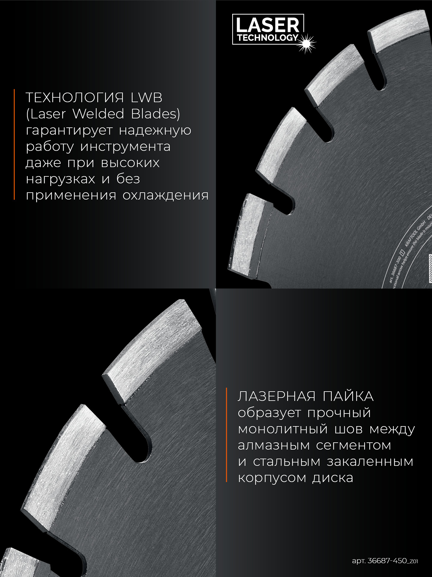 - Технология LWB (Laser Welded Blades) гарантирует надежную работу инструмента даже при высоких нагрузках и без применения охлаждения