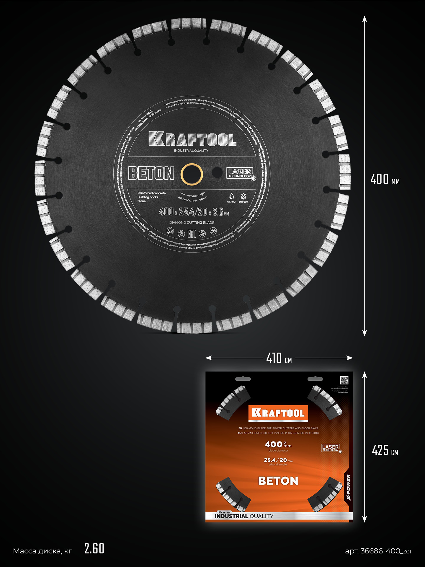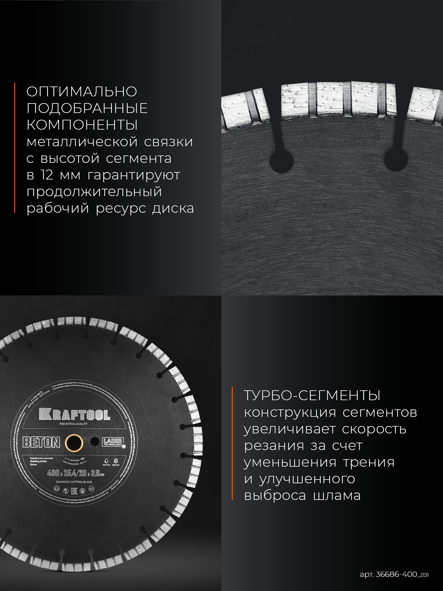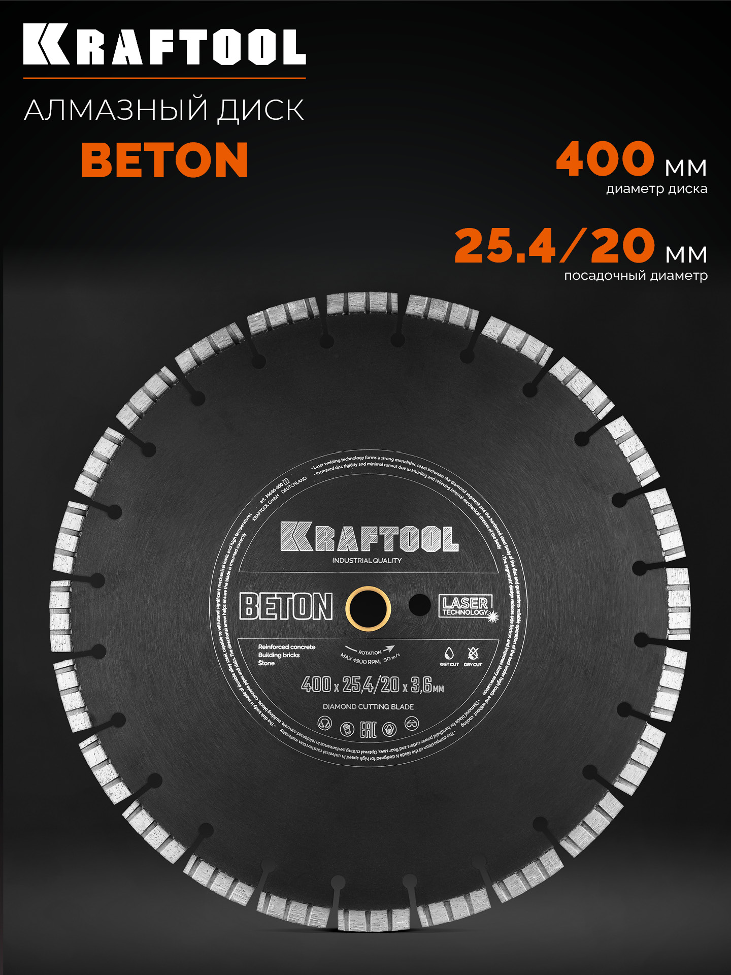 KRAFTOOL BETON 400 мм (25.4/20 мм, 12х3.6 мм), алмазный диск (36686-400)