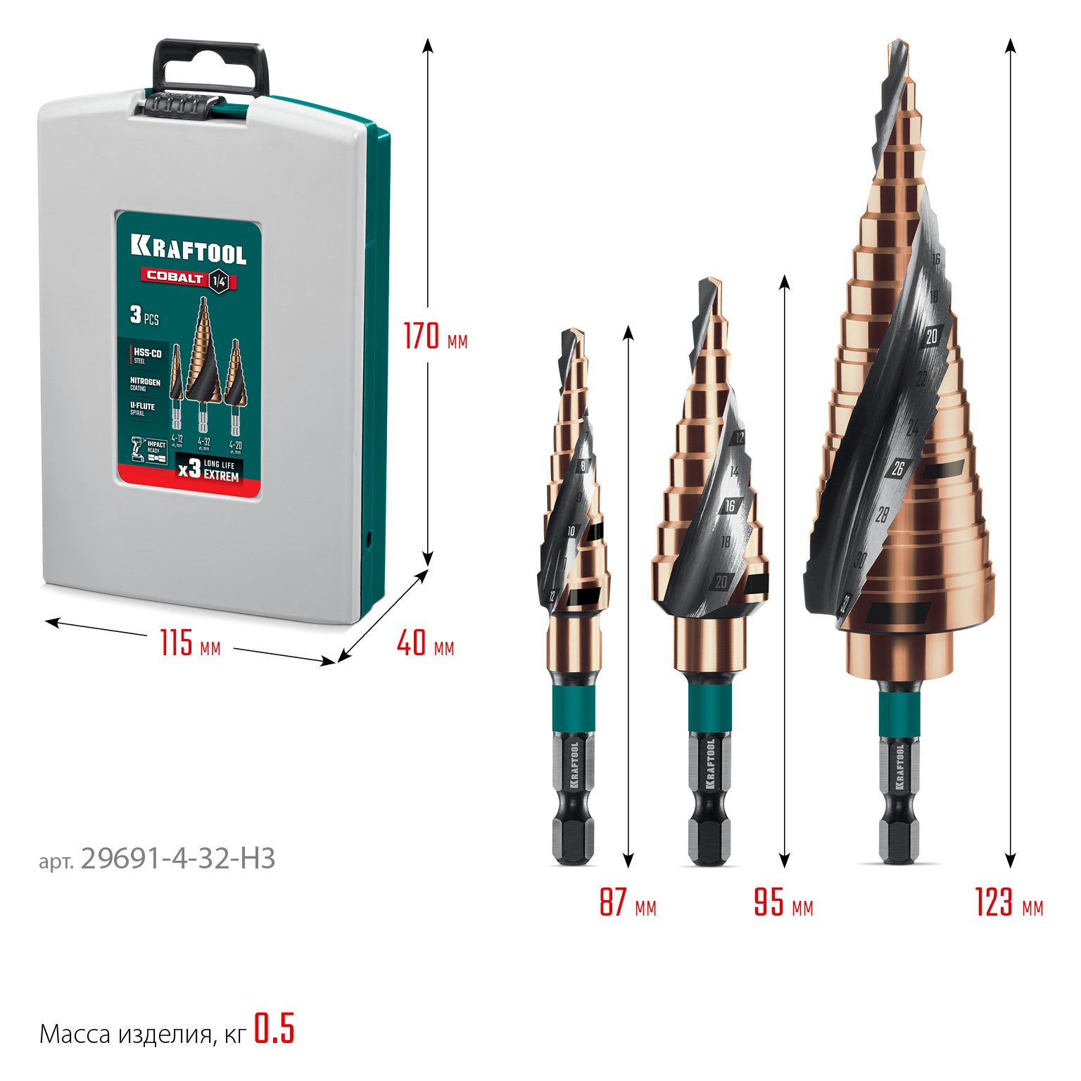 KRAFTOOL COBALT 3 шт., 4-32мм, азотирование, винтовая спираль, набор сверл ступенчатых(29691-4-32-H3)